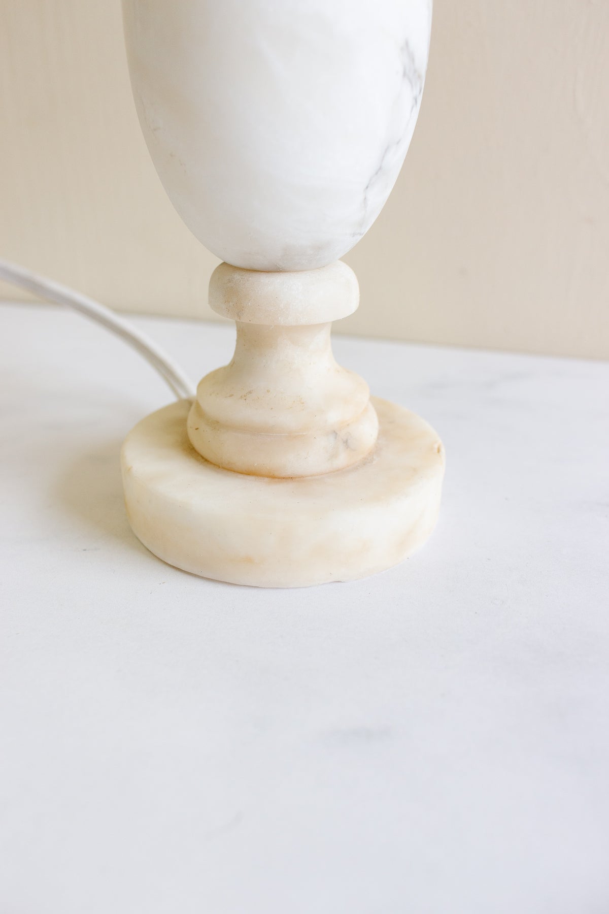 A gorgeous, richly embellished carved lamp made of Italian marble. This piece makes a statement while staying timeless.  Please note we recommend rewiring to ensure all current electrical safety standards are met. Sourced from a family estate. Please note there is a small stain on the shade as pictured. Priced accordingly.