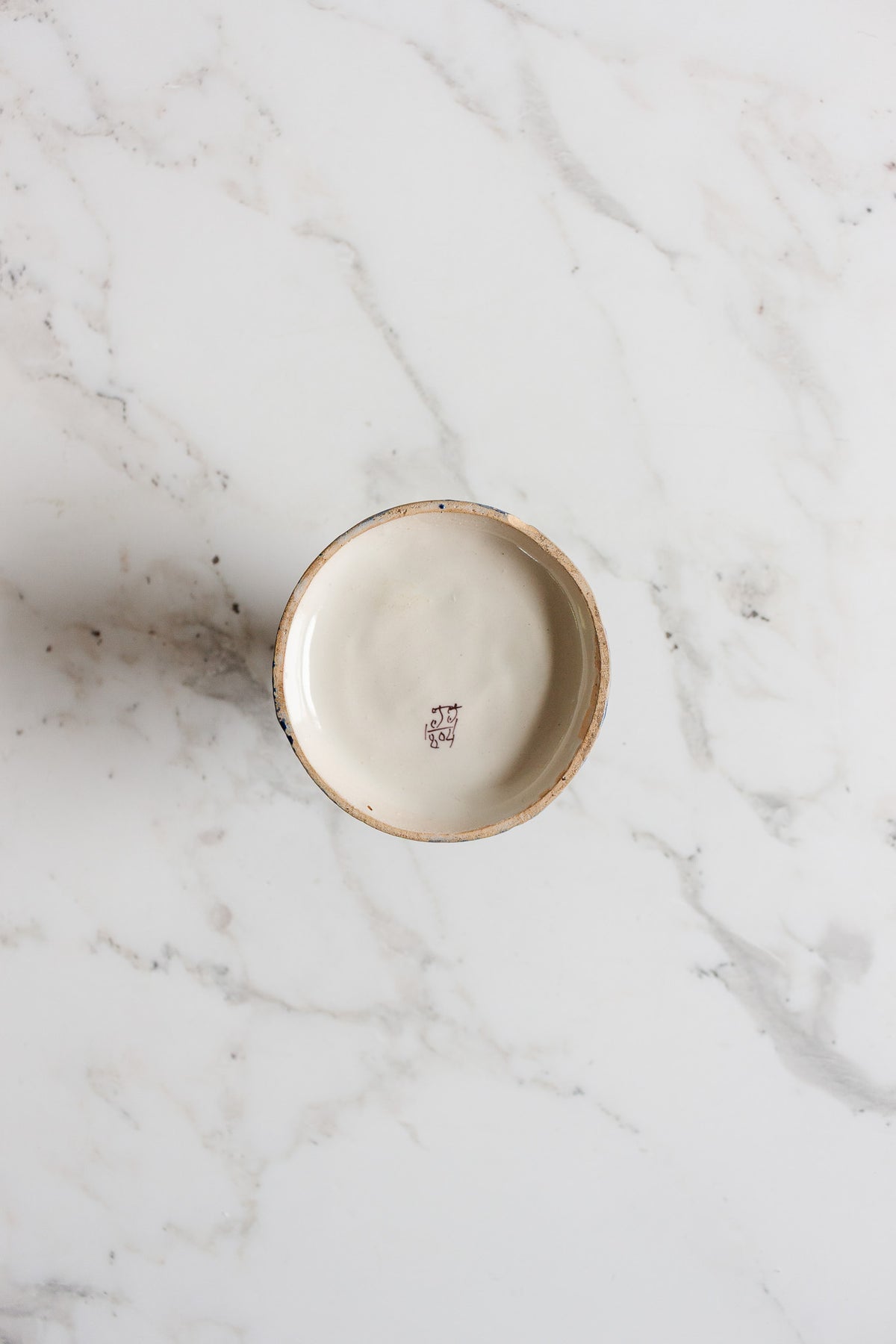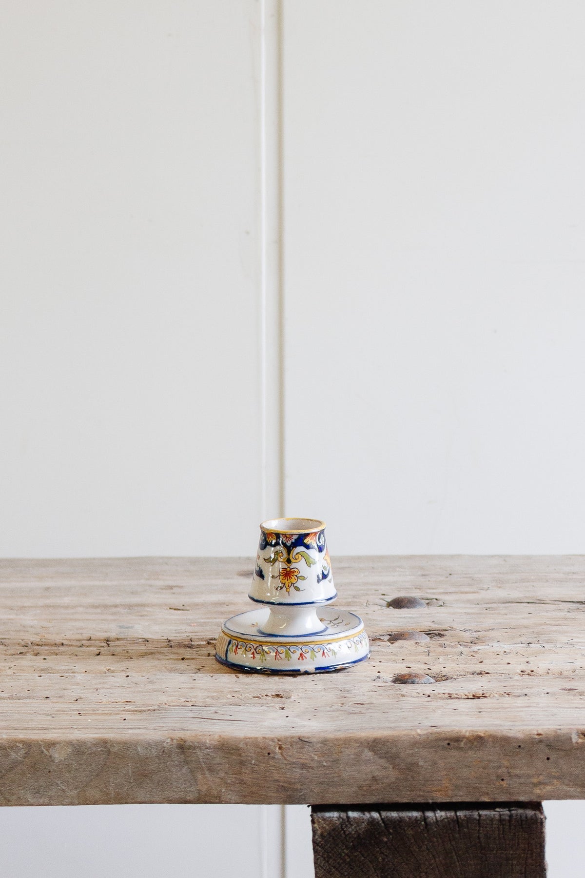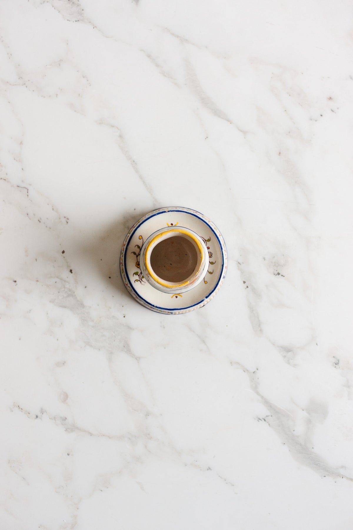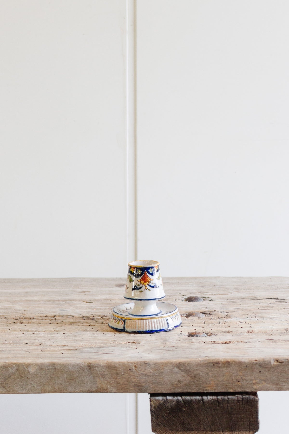 Antique French match striker from Moustiers, crafted in tin-glazed earthenware with hand-painted blue floral motifs. These strikers were once commonly found in bars and cafés across France, used to hold and light matches. Classic flared base with ribbed surface for striking. Displays a small chip to the rim, as shown, consistent with age and use.