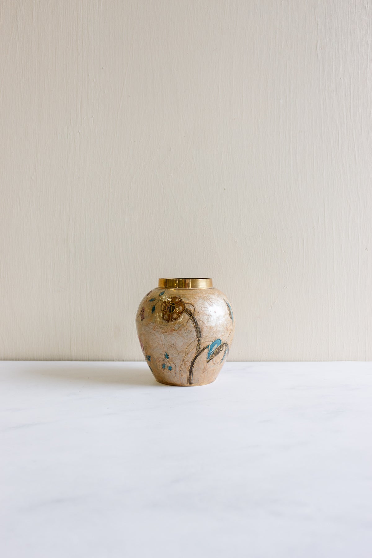 This vintage french cloisonné vase features an array of colourful flowers. We think it would look lovely with some fresh flowers, or displayed on your shelf or tabletop. Sourced from an estate in Normandy.