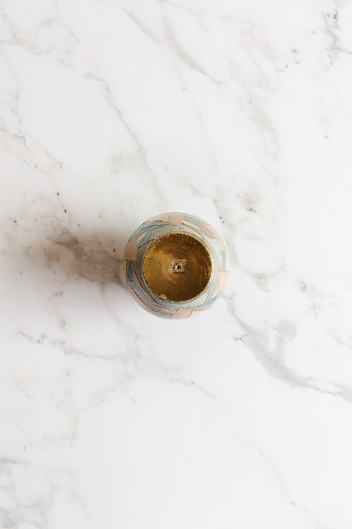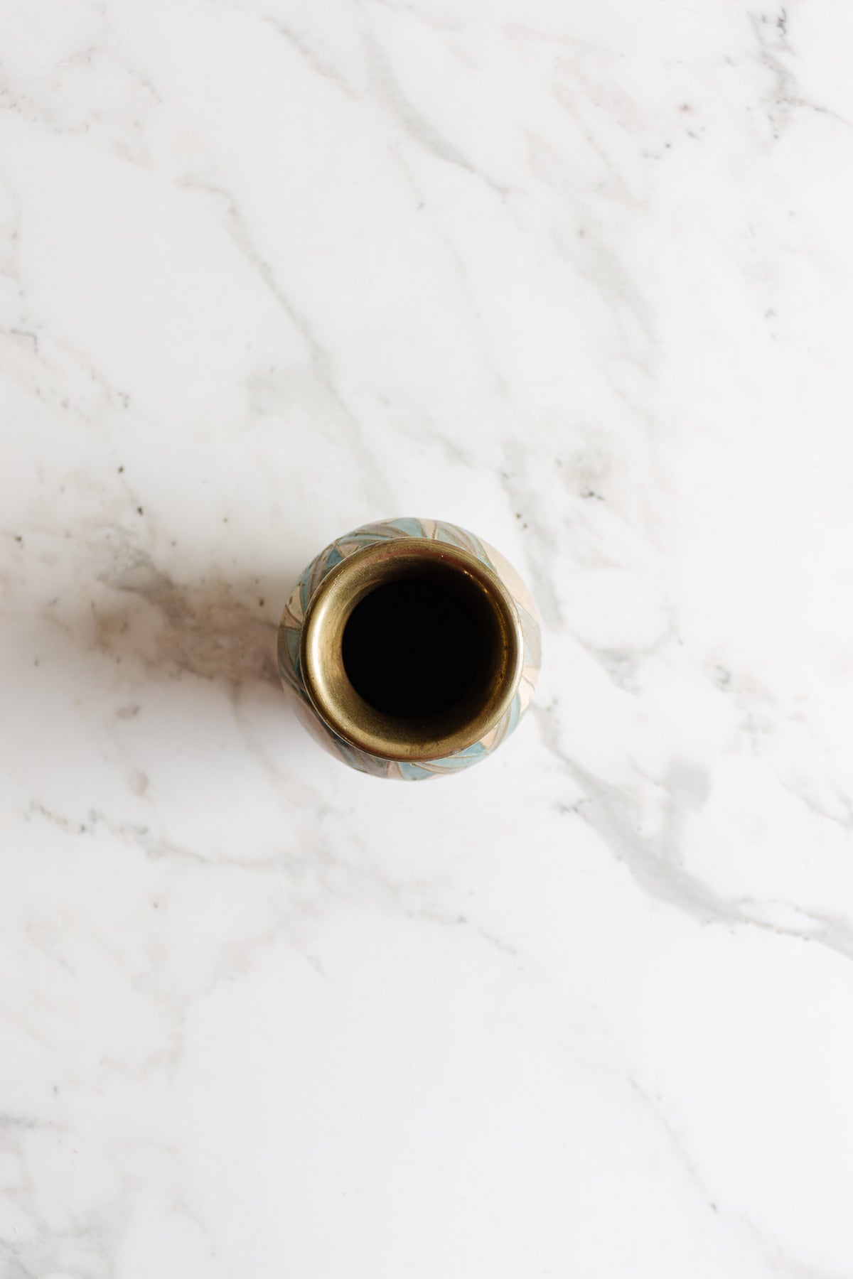 This elegant antique French petite vase features exquisite cloisonné enamelwork on a solid brass base. Handcrafted with intricate floral and geometric patterns, the vase showcases the traditional cloisonné technique, where delicate metal wires form compartments filled with vibrant colored enamel. Sourced from a brocante in Marseille.