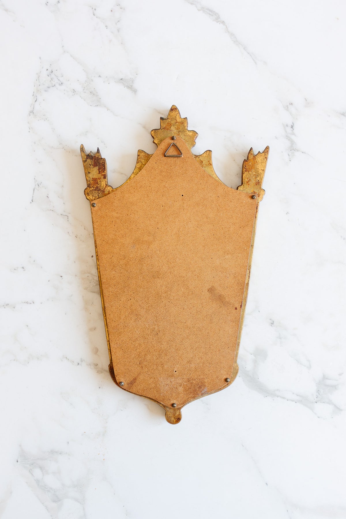 A shield-shaped mirror with ornate wooden edges and a plain back sits on a white marble surface. Showing slight wear and corner metal fasteners, this decorative mirror's versatile size makes it ideal for display.