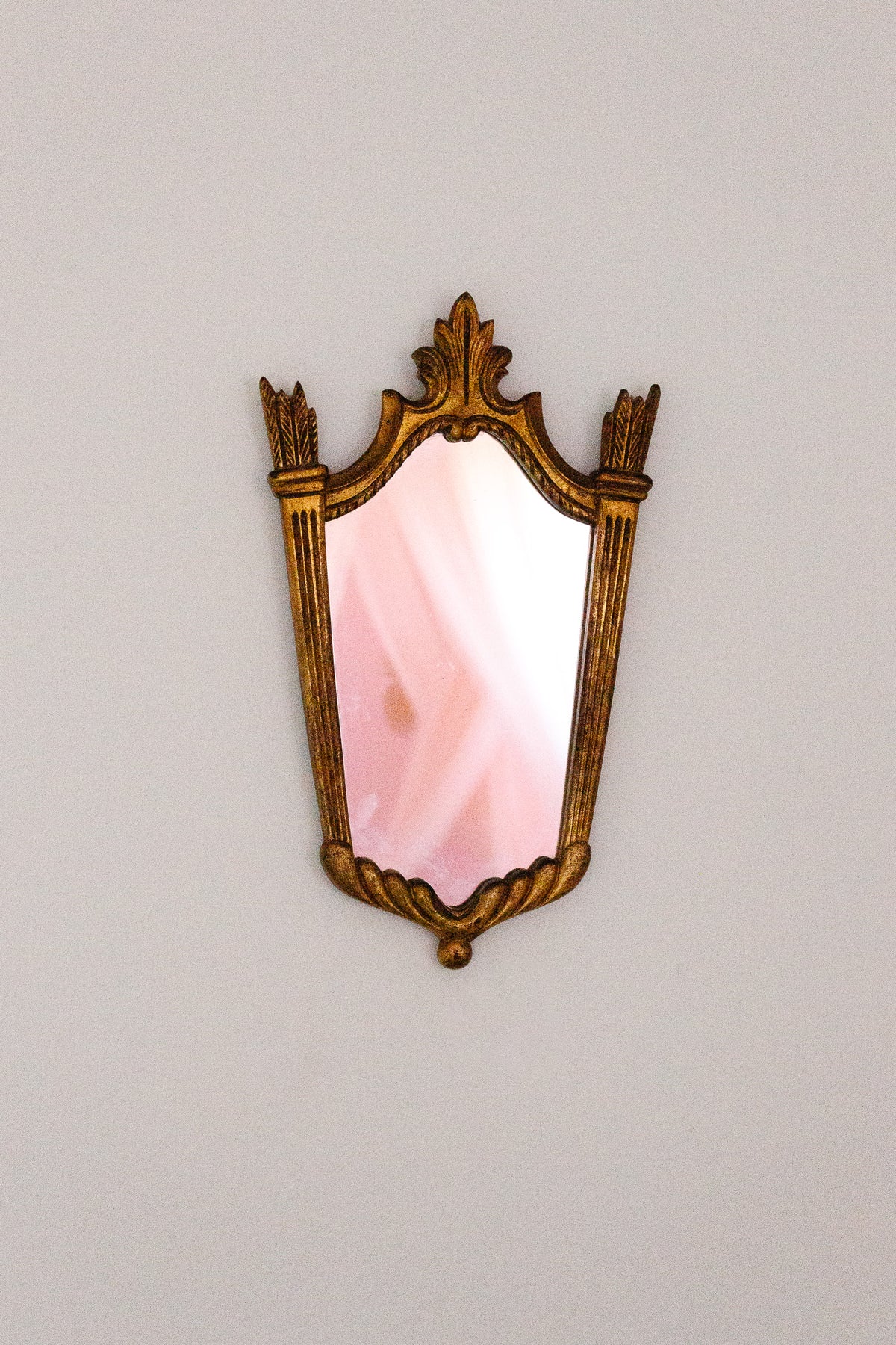 A vintage-style mirror with a gold frame hangs on a white wall. The mirror reflects soft pink and white tones, possibly from a room or curtain, and adds an elegant touch with its ornate design.