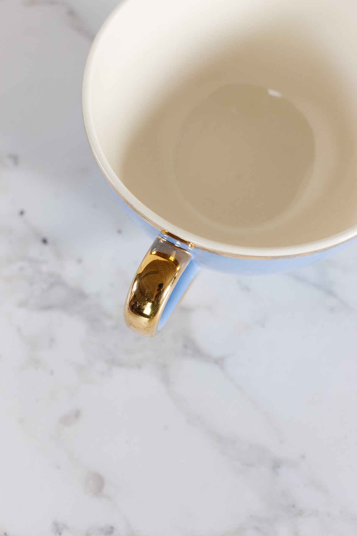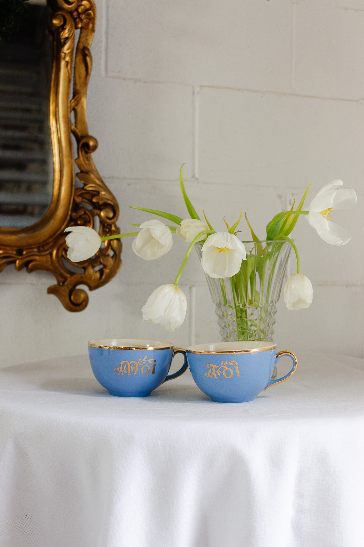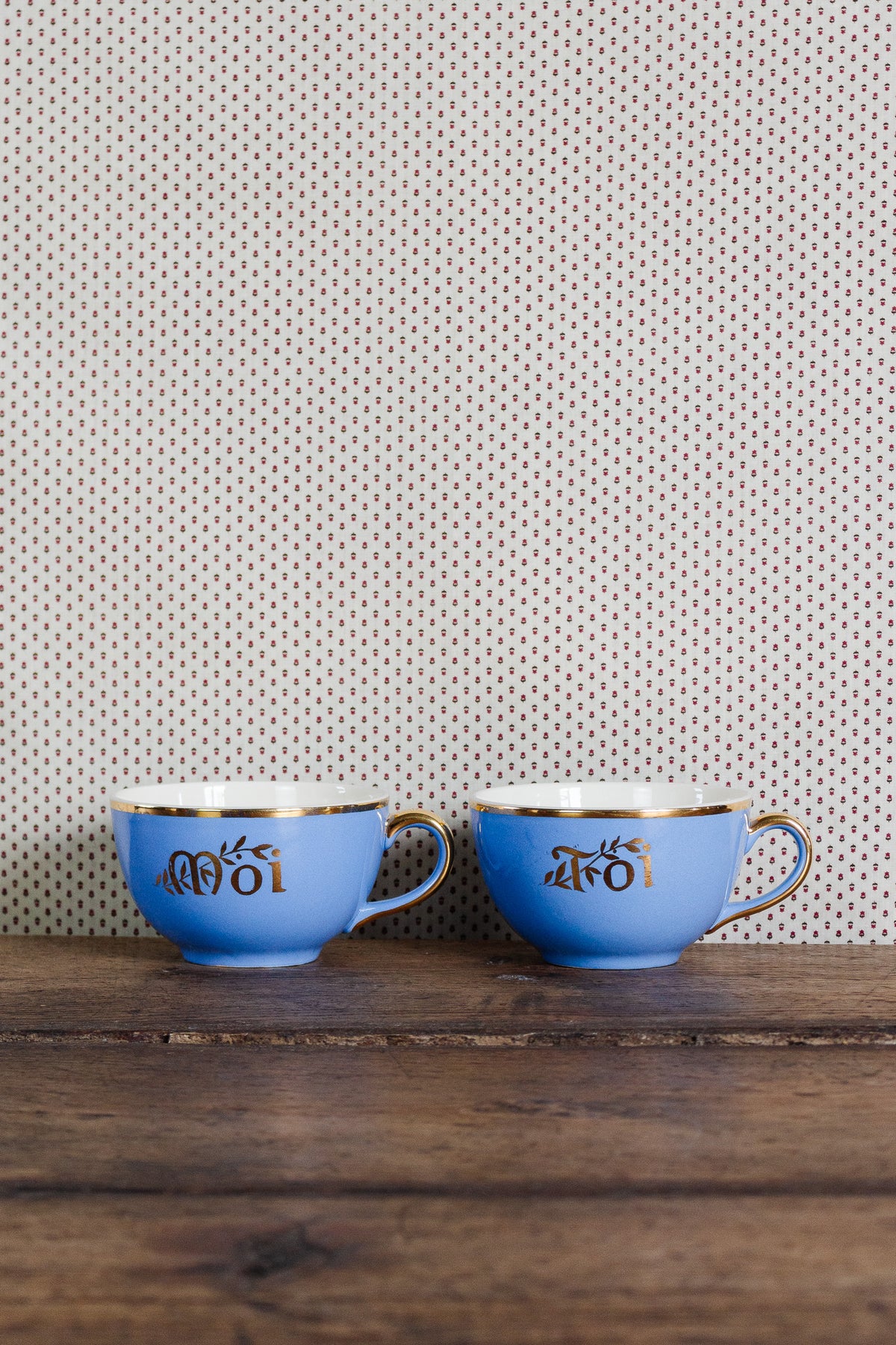 These sweet teacups are popular in France, and you can find them in wide range of styles, but many that we’ve come across are common, newer in production or mass produced. This set, however, caught our eye: a pair made by Villeroy & Boch, in the most incredible cerulean blue with gold accents, gold accented handles, and the "toi" and "moi" shining brightly.