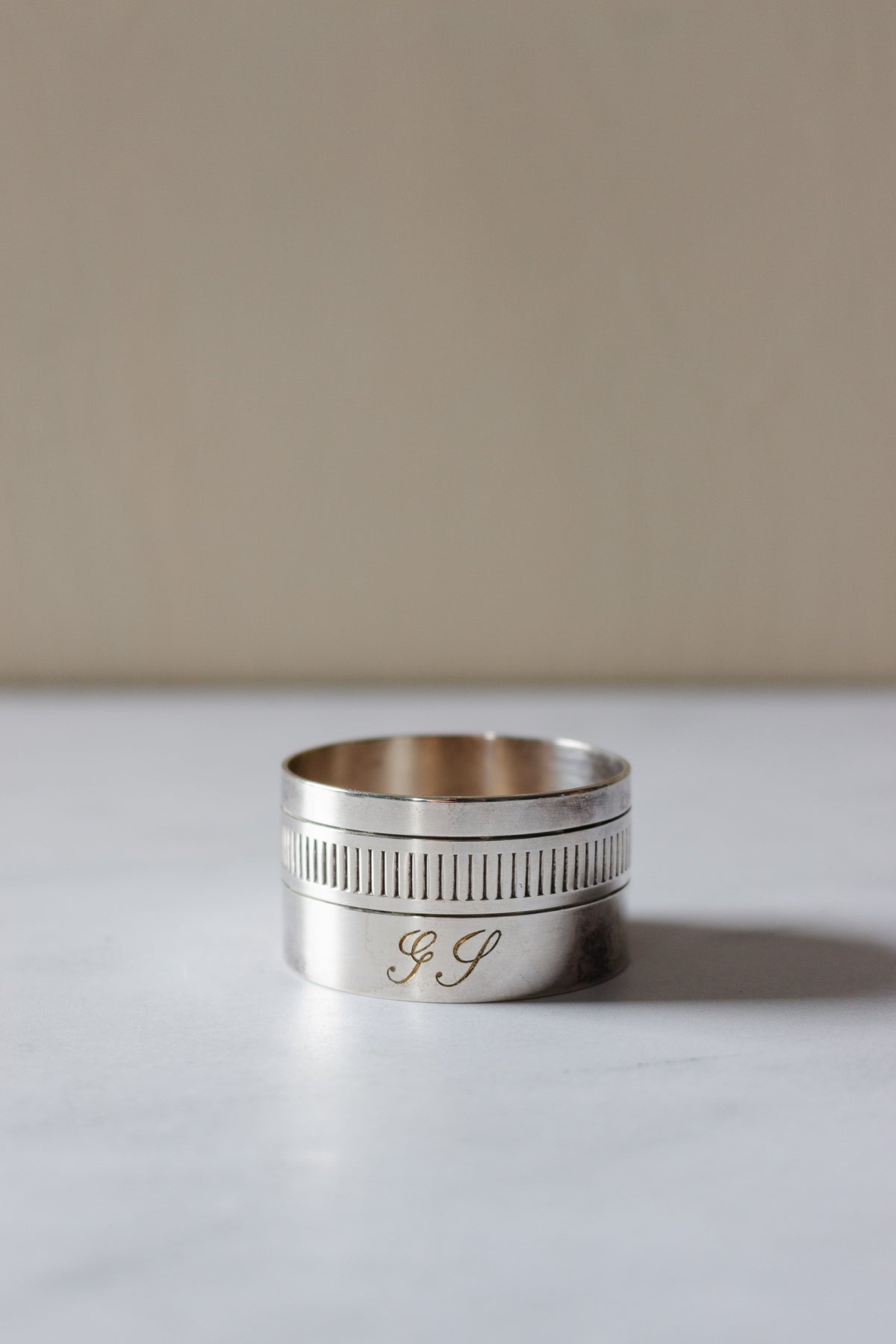 These monogrammed napkin rings once belonged to a family who had them custom made and they had been kept in their original boxes as pictured. Instantly elevate your tablescape!