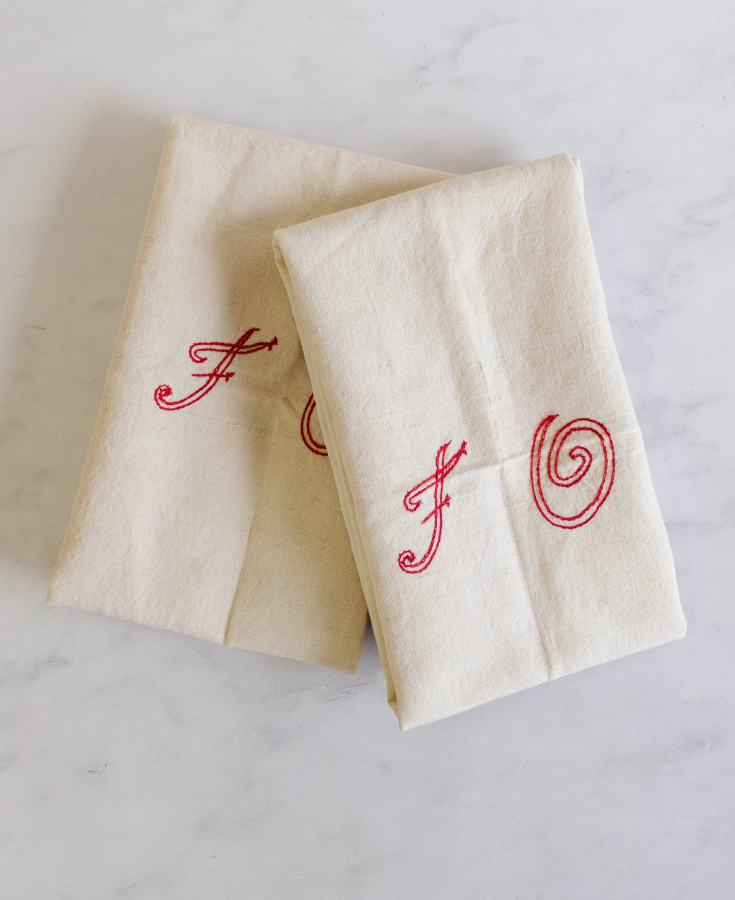 This gorgeous set of 2 French "torchons” or kitchen towels, feature the owner’s monogram “FO” and were lovingly preserved in a dowry box in an estate in Marseille. Made of a linen/cotton blend. As with most antique linens, these have a few slight markings as shown.