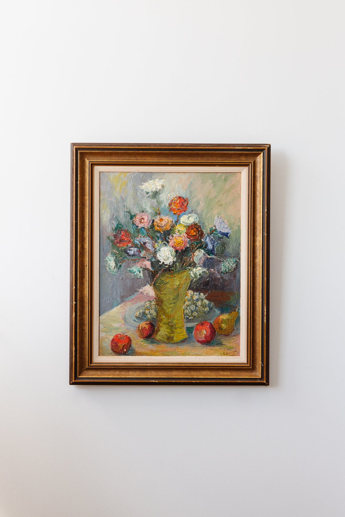 This stunning oil on board still life painting showcases an exquisite arrangement of flowers and fruit. The artist skillfully captures the vibrant colors and intricate details, infusing the composition with a rich texture that brings the elements to life. The visible brushstrokes add depth and a sense of movement, creating a captivating and immersive experience for the viewer. Sourced from a local estate.