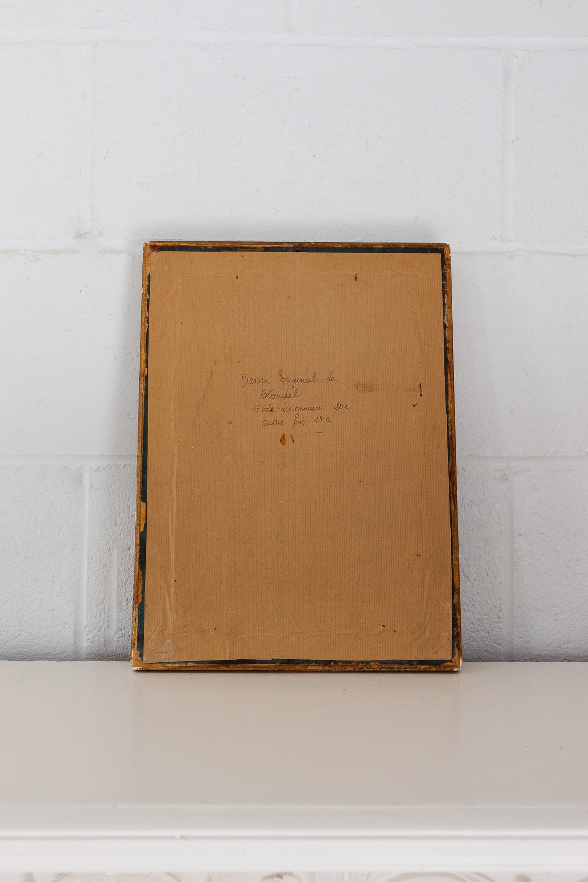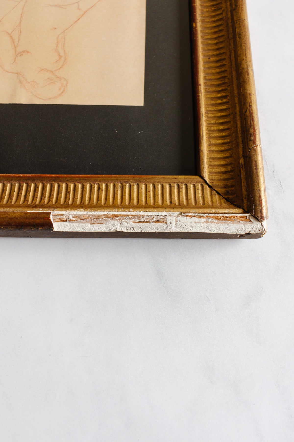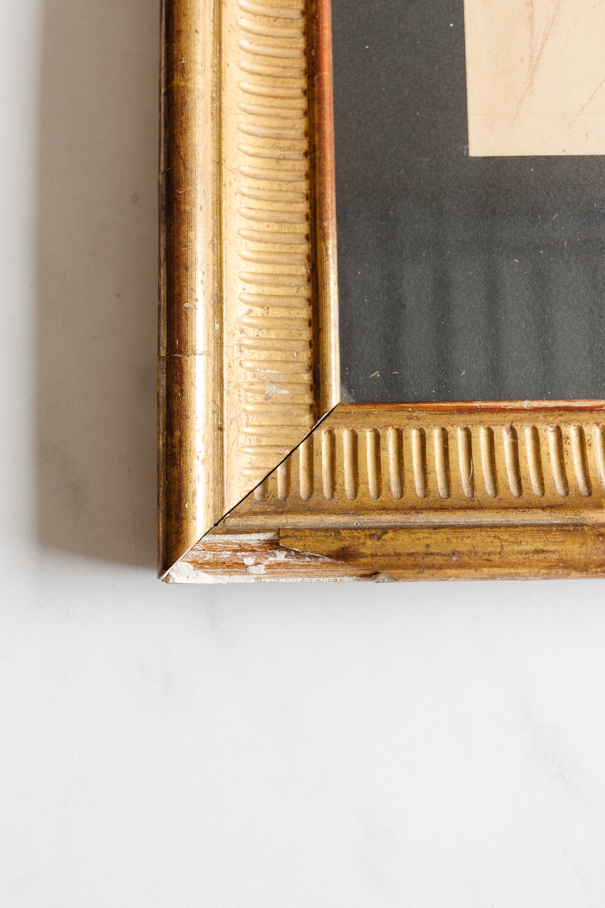 This beautifully rendered original sketch on paper has a little history written on the reverse side of the frame: the sketch was by someone named “Blondel” in the 20th century and the frame is from the 19th century. The frame is beautifully worn, rich with time aged patina, and together with the art makes for gorgeous addition to your wall or shelf.
