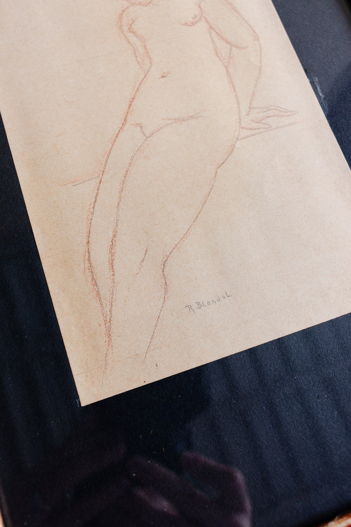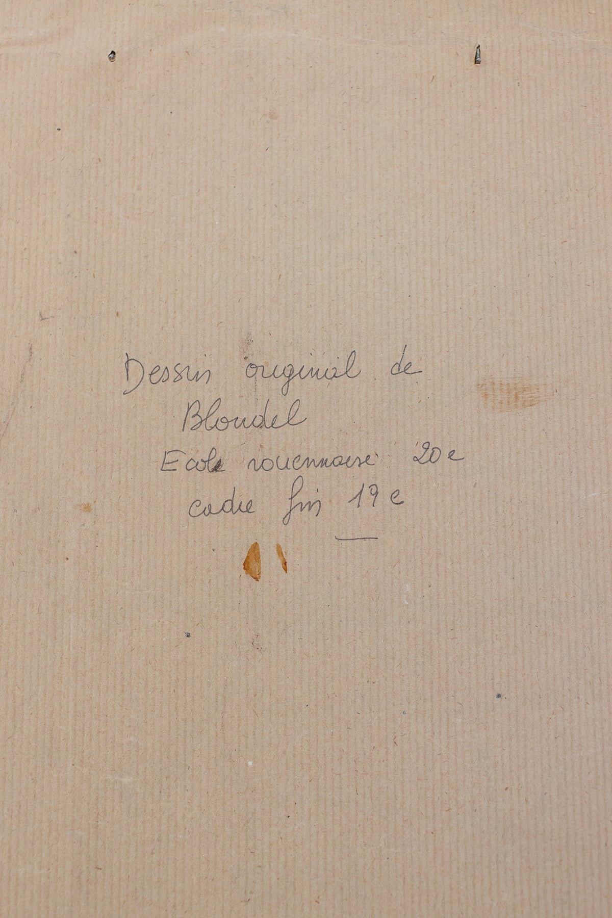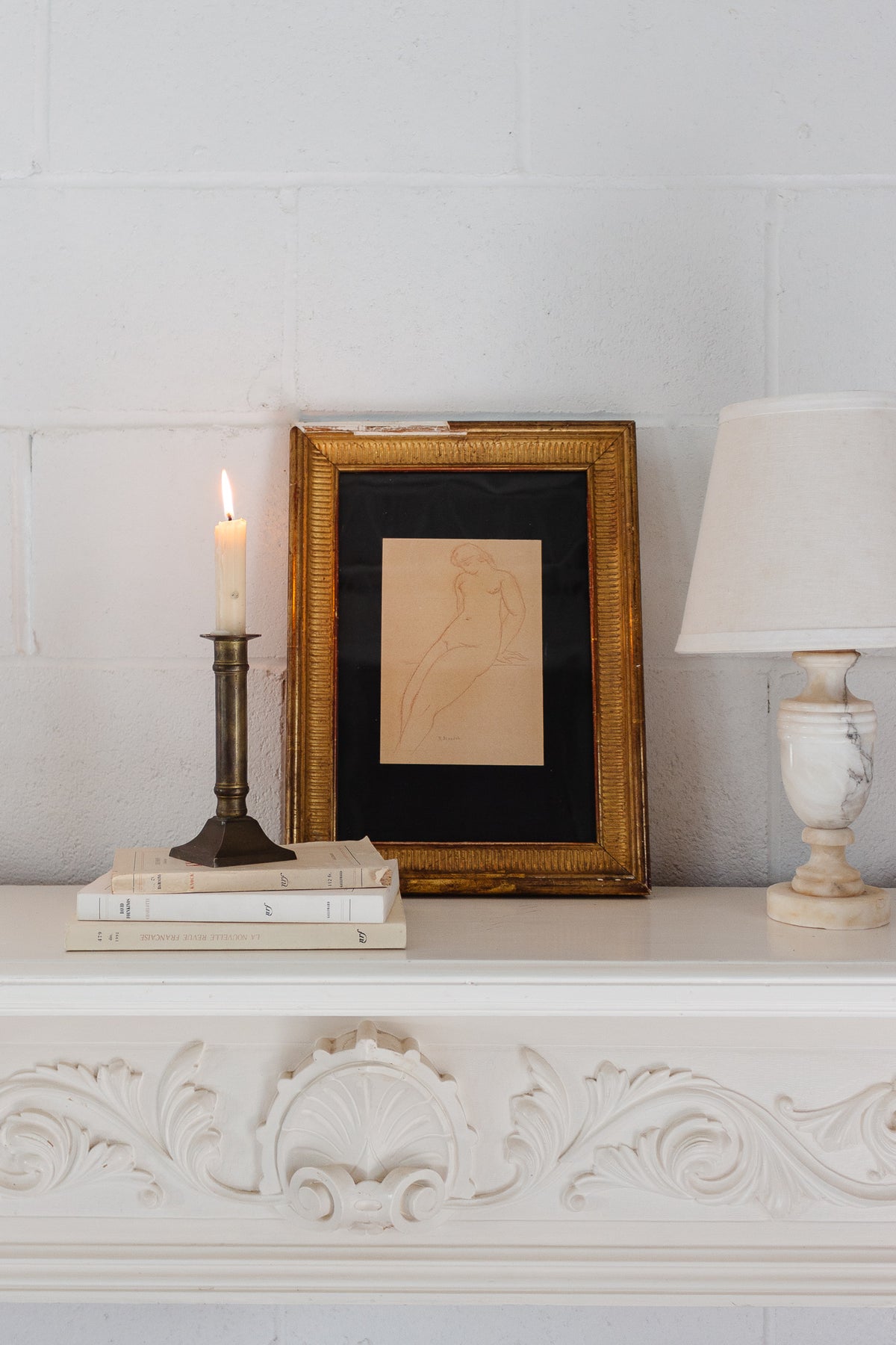This beautifully rendered original sketch on paper has a little history written on the reverse side of the frame: the sketch was by someone named “Blondel” in the 20th century and the frame is from the 19th century. The frame is beautifully worn, rich with time aged patina, and together with the art makes for gorgeous addition to your wall or shelf.