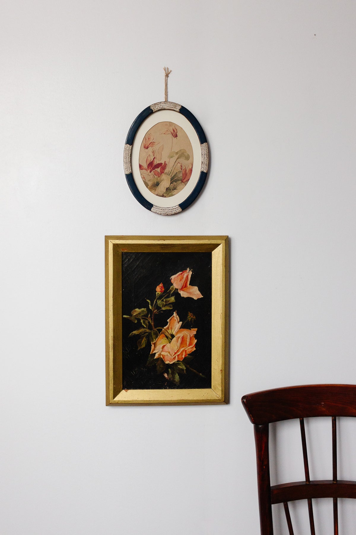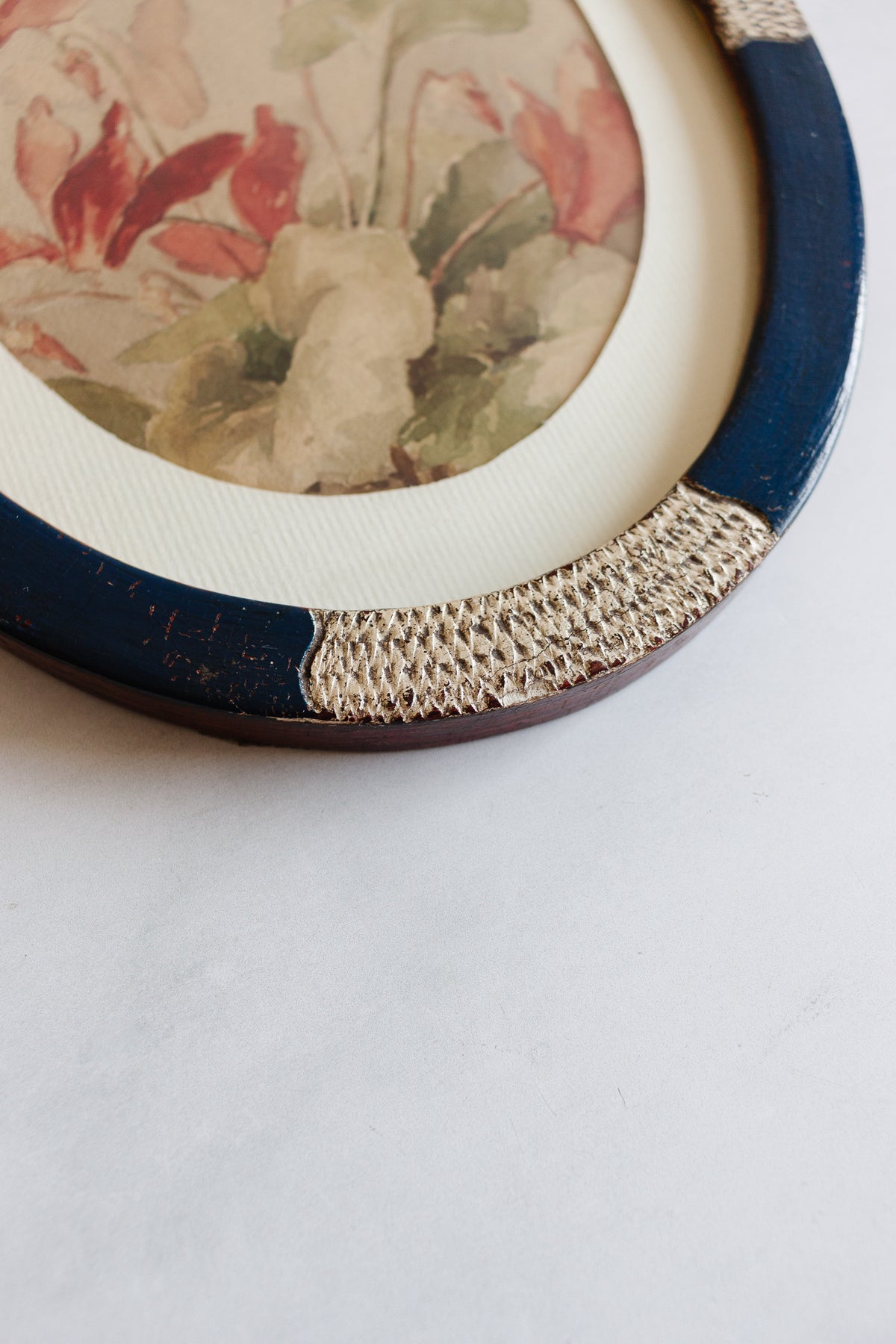One of a kind, original art is so special. We sourced this unique and beautifully rendered watercolour on paper, from a farmhouse in Aix-en-Provence. The classic deep navy oval frame with gilt silver carved embellishments is wonderfully unique. Oval art is an increasingly popular style, and an interesting addition to any wall space.