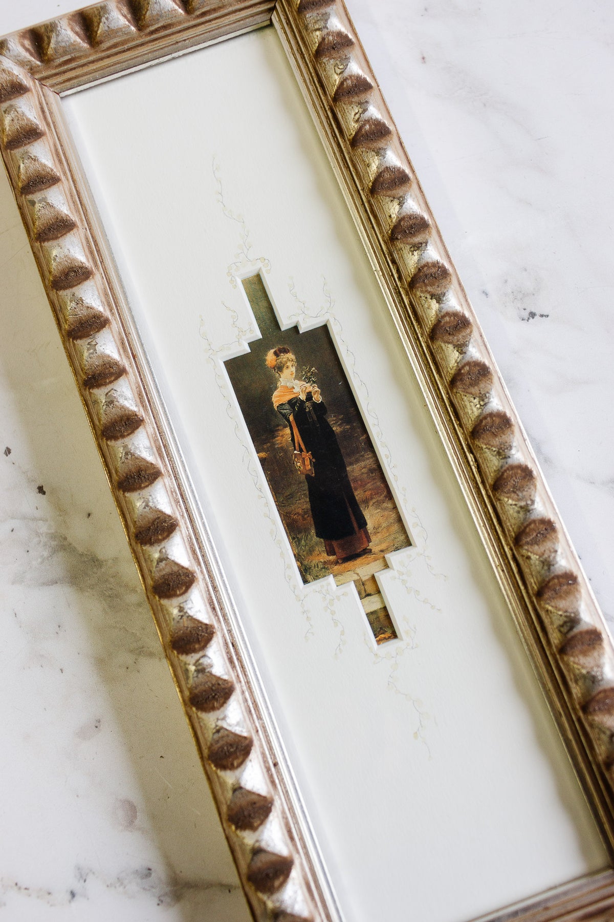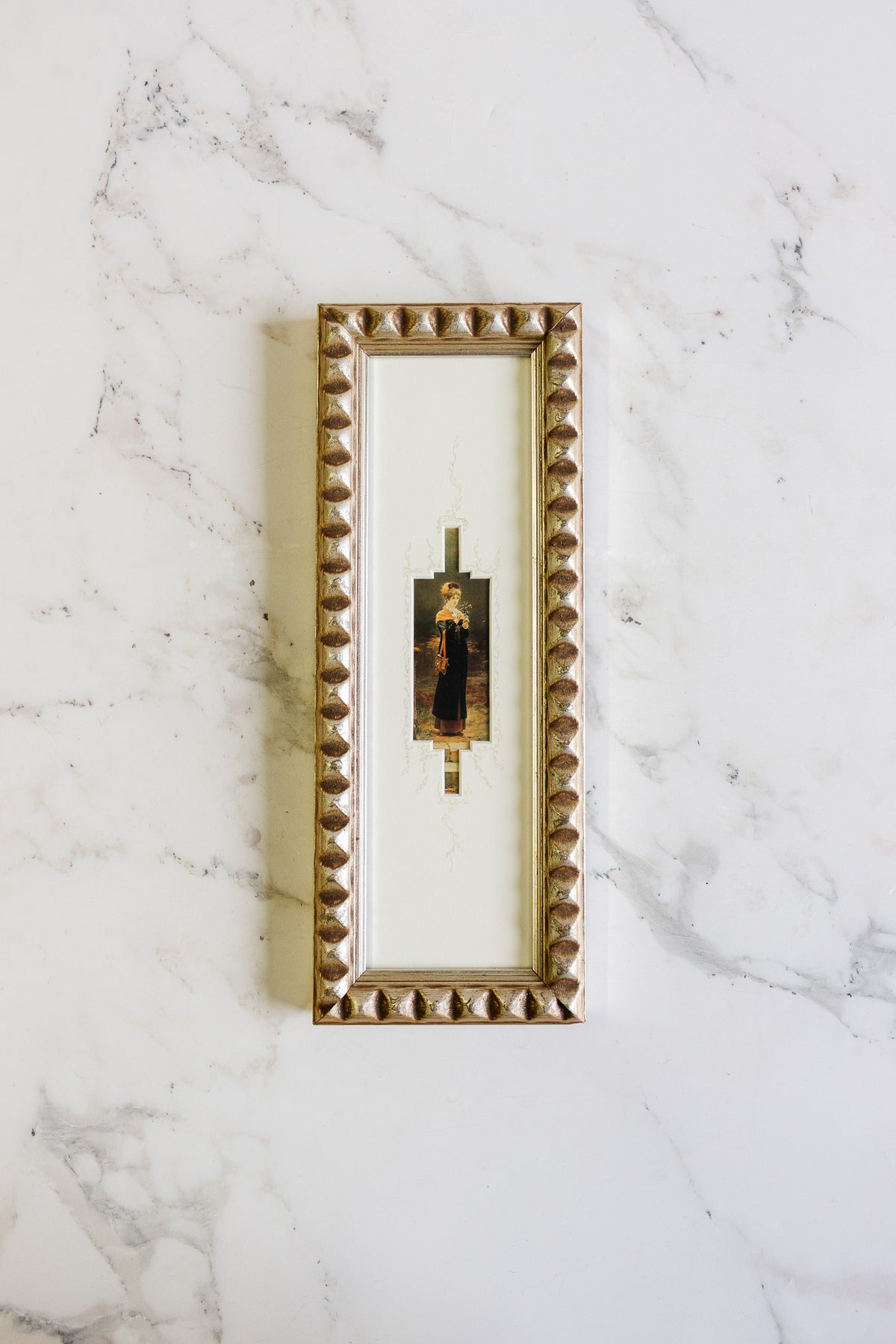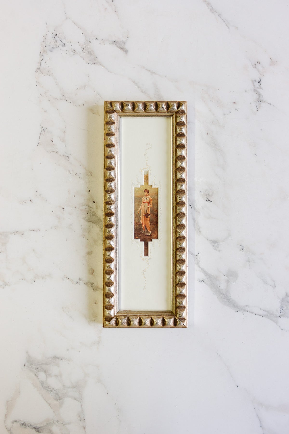 The prints are set within deeply textured gilt frames with geometric beading, giving them depth and a sculptural presence on the wall. Their narrow proportions make them ideal for flanking a mirror, doorway, or small vignette.