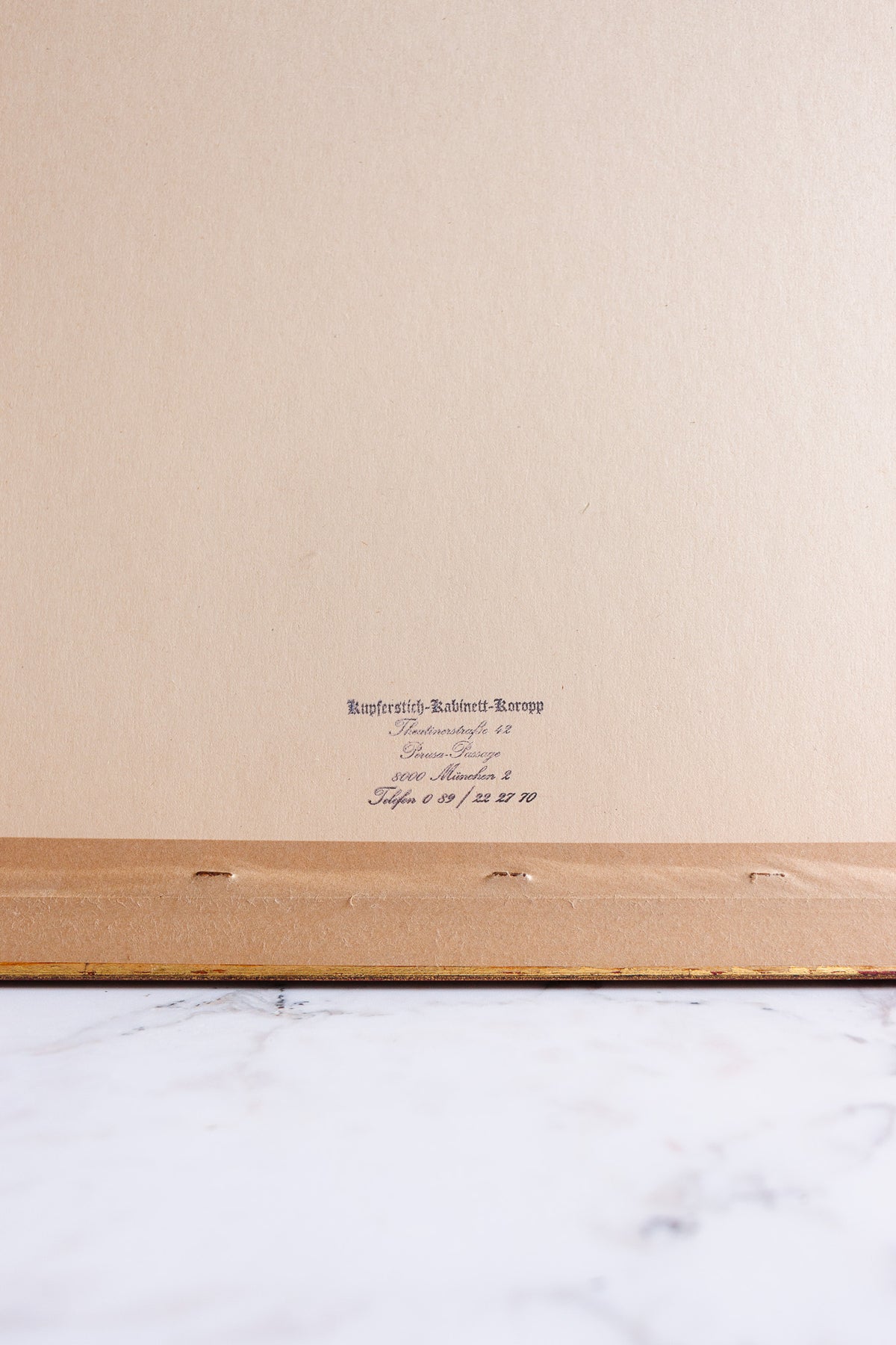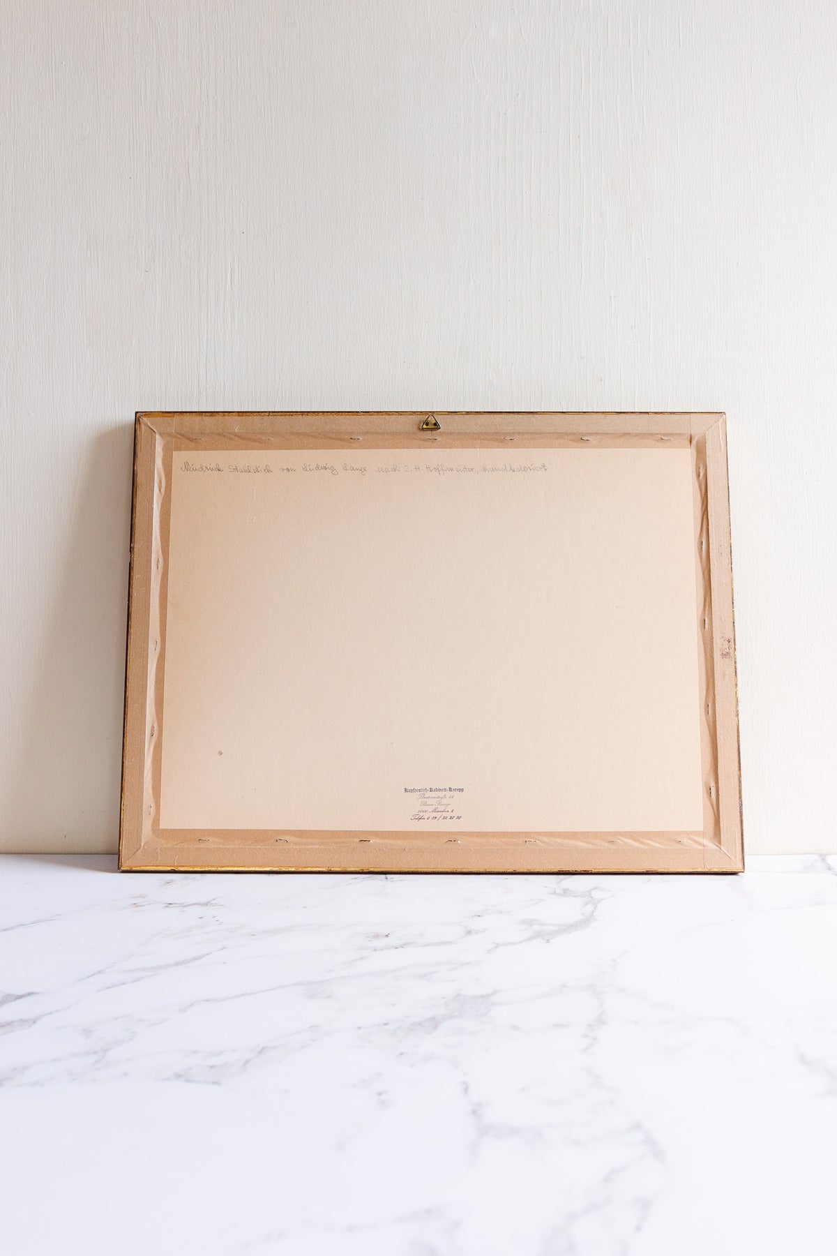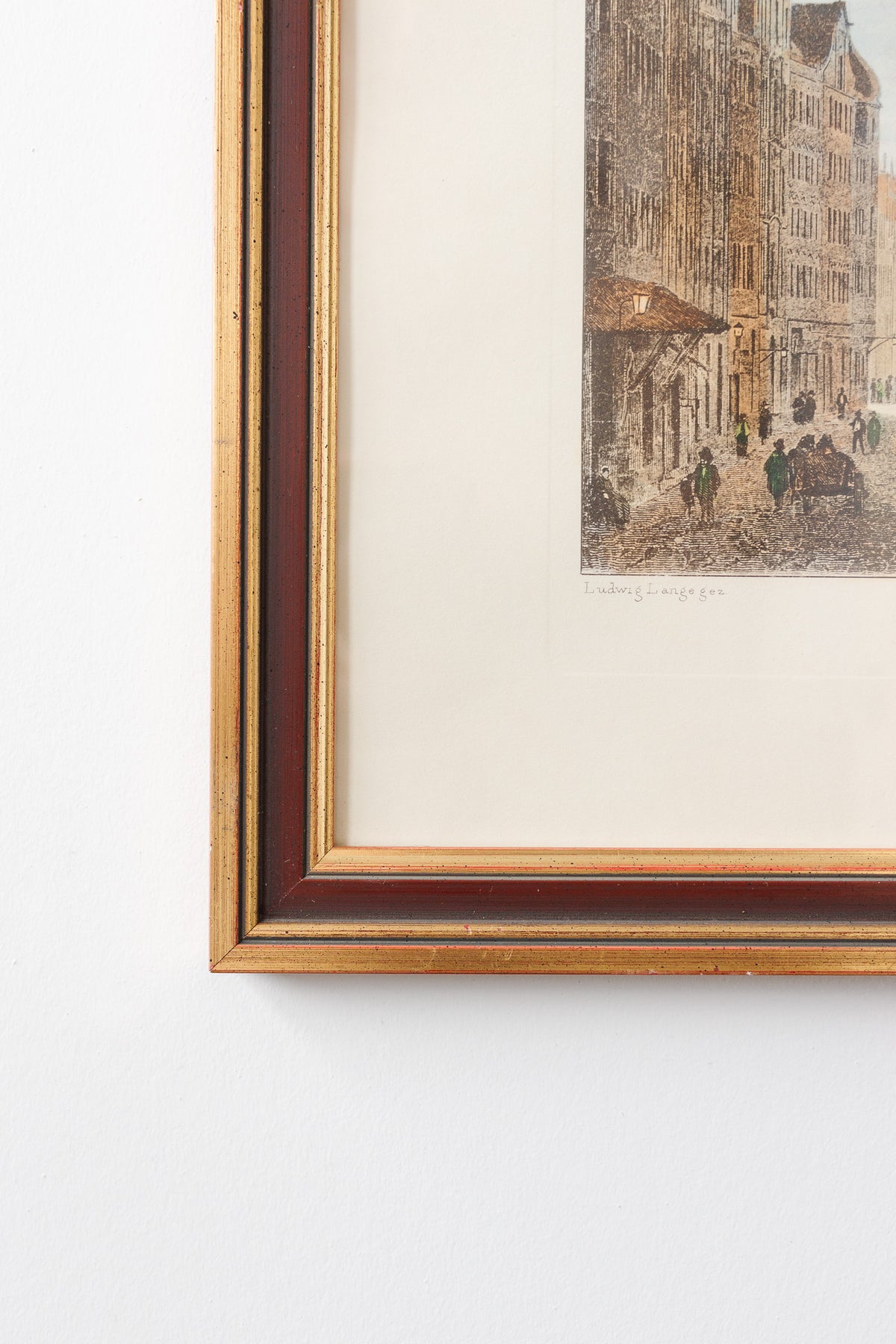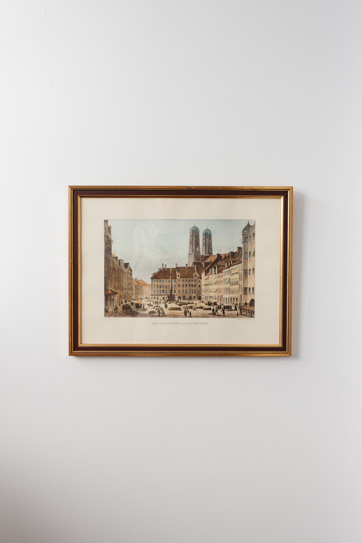 A handsome antique hand coloured engraving sourced from a brocante in Marseille depicting a town square in Munich, Germany.