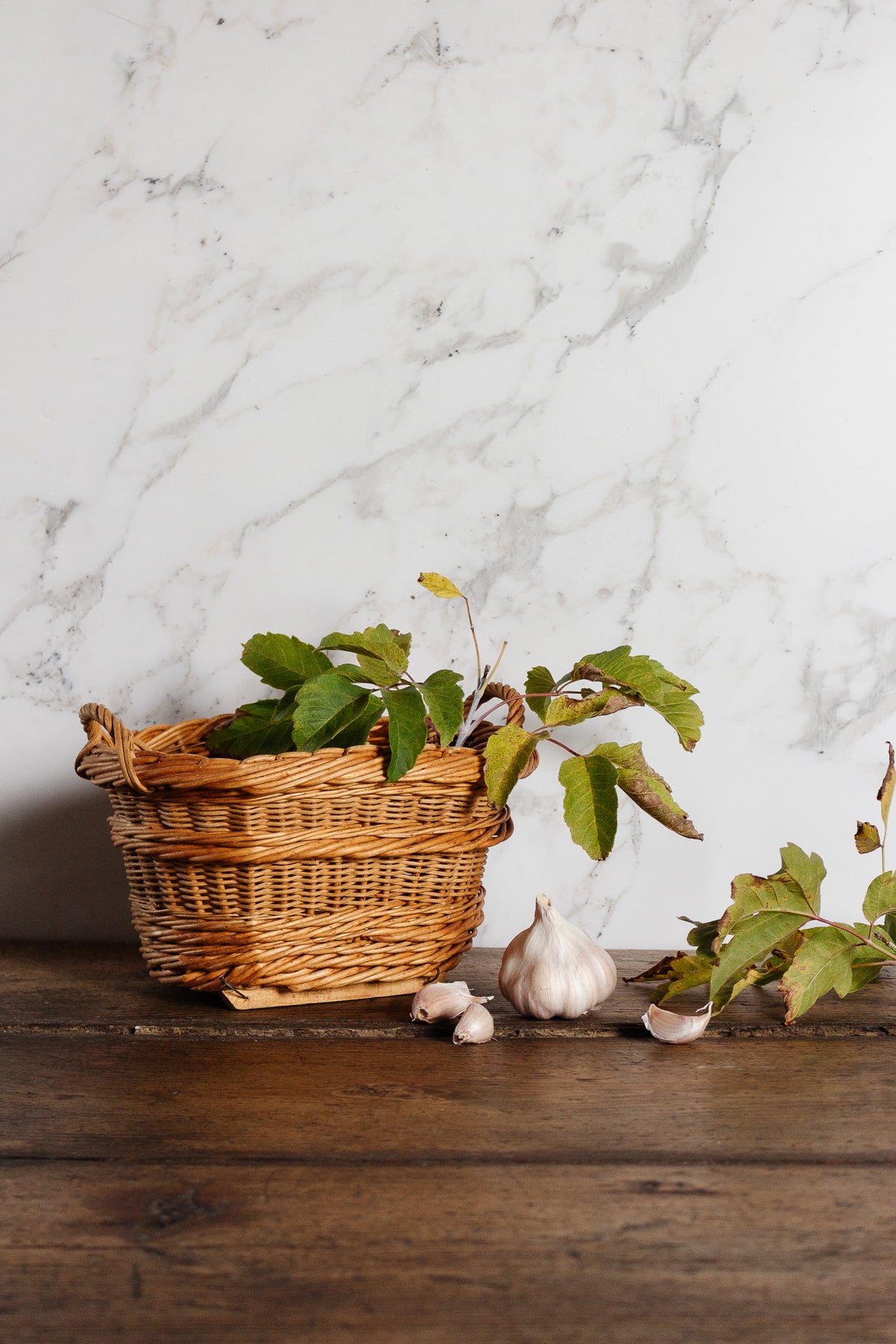 This woven wicker basket with wood slats is well made as well as practical. Use this basket for storage in a powder room, for keeping things neat near your TV, or for filling with curiosities. Sourced from a brocante in Marseille.