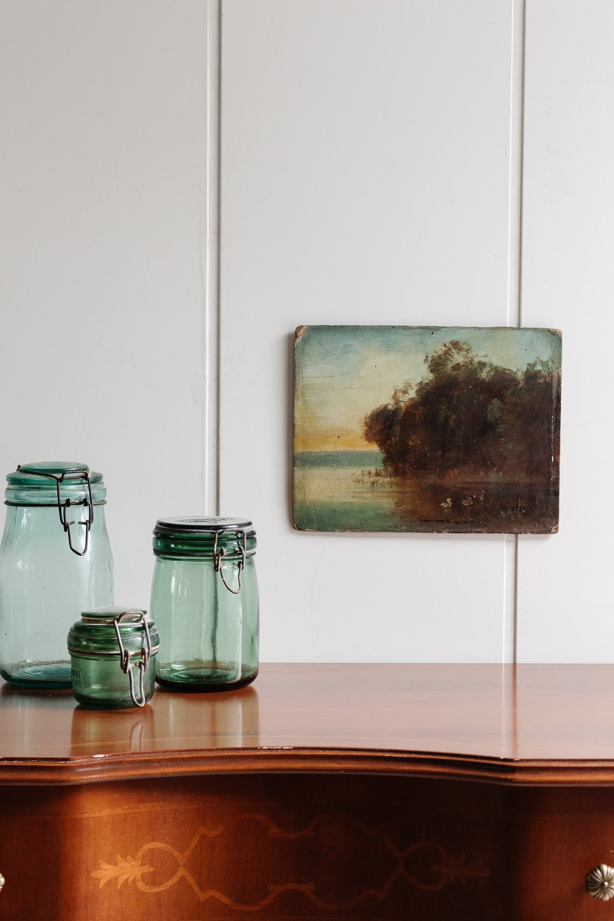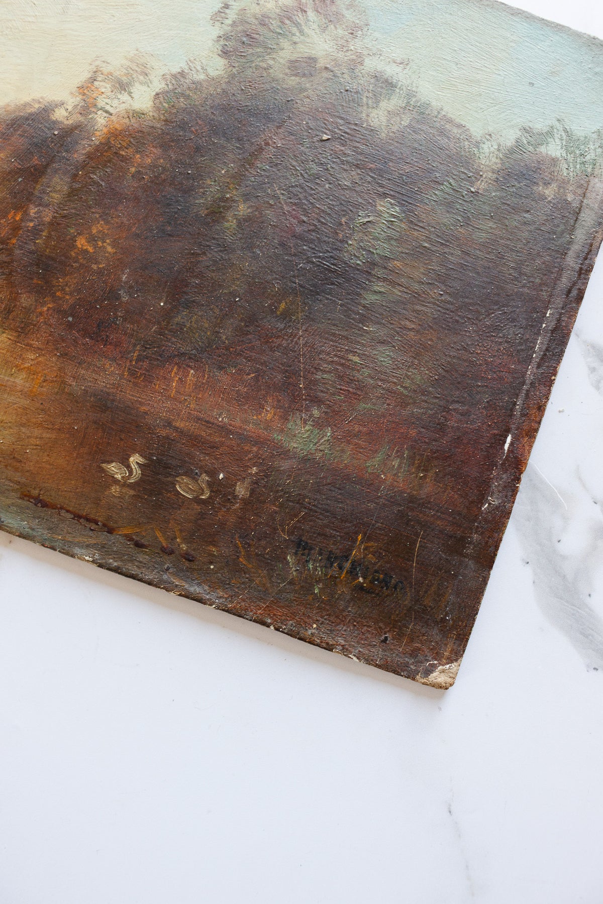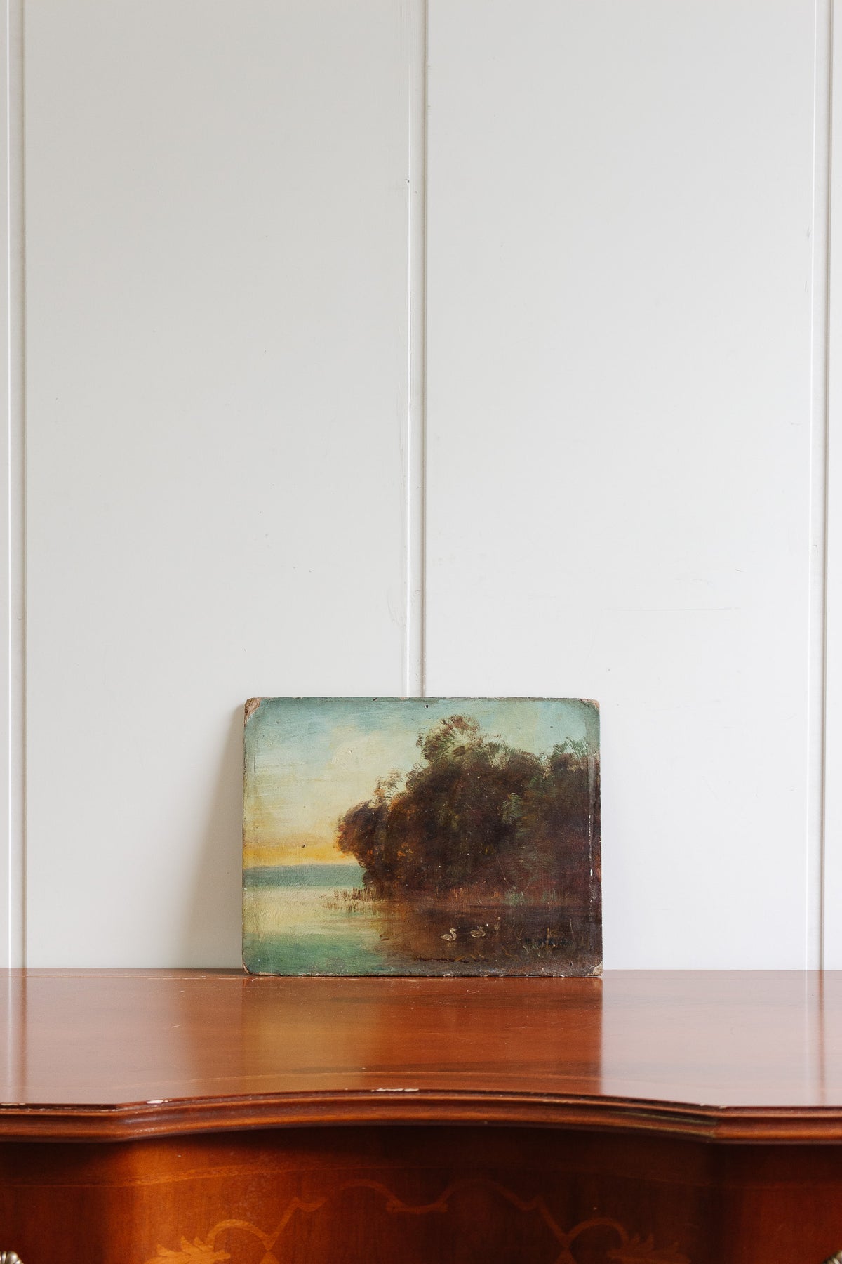 This charming french antique oil on board depicts ducks on the water at dawn with warm hues. Sourced from an art collector in Aix-en-Provence.