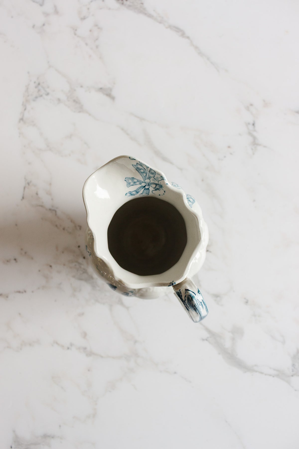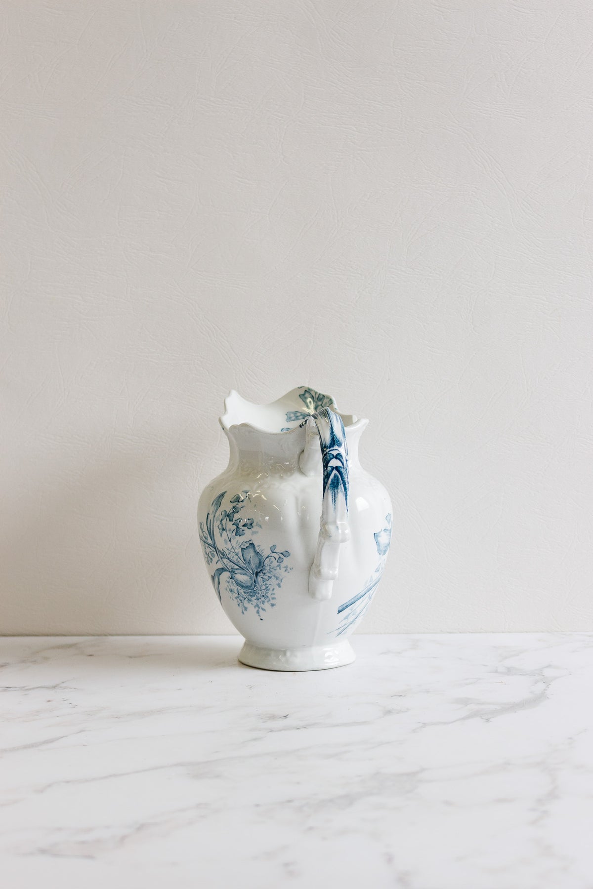 This antique French transferware pitcher features a classic blue and white design with delicate floral motifs. Though unmarked, its form and pattern suggest 19th-century origins. A charming decorative accent or functional piece, it was sourced from a brocante in Marseille.