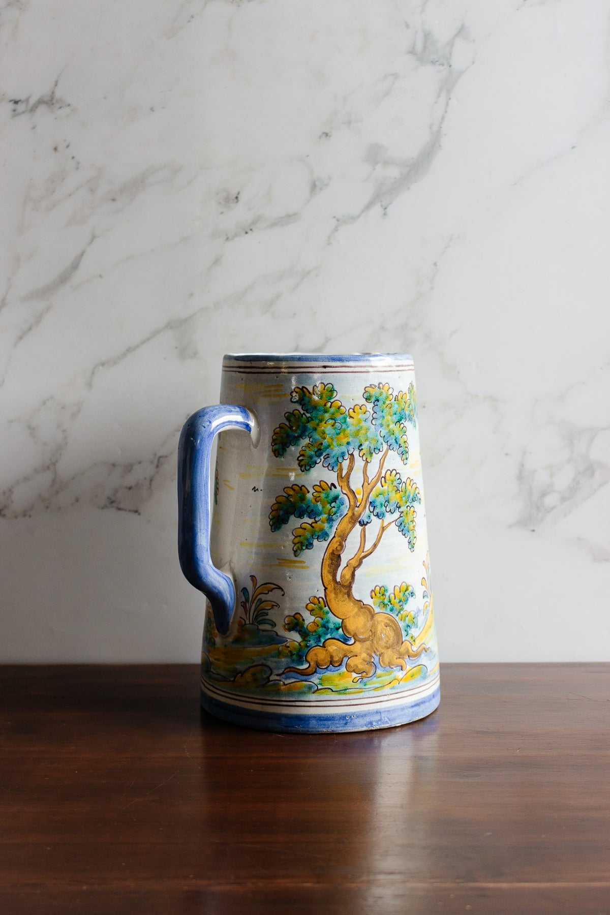 Oversized hand-painted majolica pitcher by Niveiro, Talavera de la Reina, Spain. Tin-glazed earthenware decorated with a polychrome landscape scene featuring trees, foliage, and animals in the traditional Talavera palette of blue, green, yellow, and ochre with a blue handle and banded rim. Marked Talavera Niveiro on base. Sourced from a brocante in Marseille.