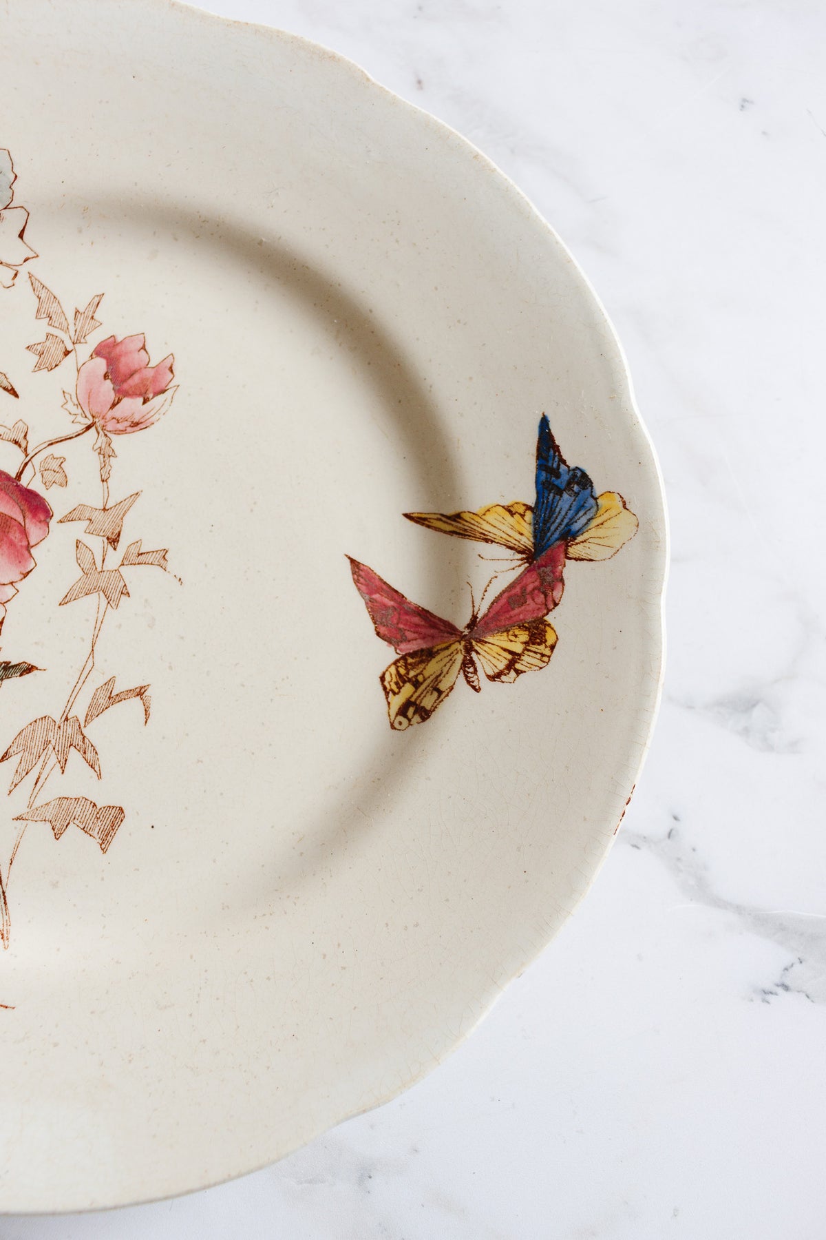 Stunning Choisy-le-Roi polychrome dinner plate, richly decorated with vibrant butterflies and delicate floral motifs. Polychrome refers to the use of multiple vivid colors in the glaze, creating a lively and detailed surface that brings each butterfly and flower to life with depth and brilliance. This technique highlights the fine artistry and craftsmanship for which Choisy-le-Roi faience is celebrated. Sourced from an estate in Aix-en-Provence.