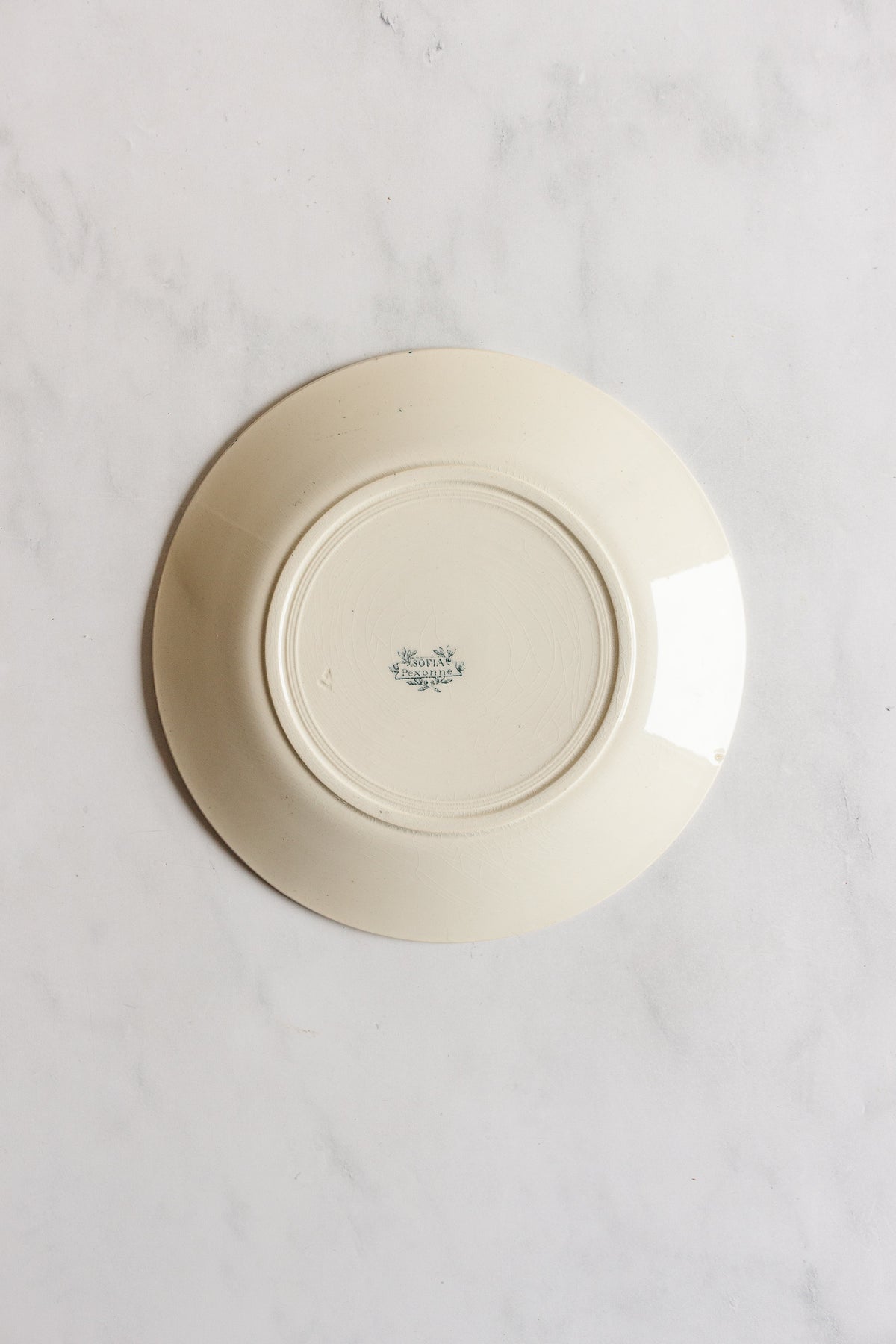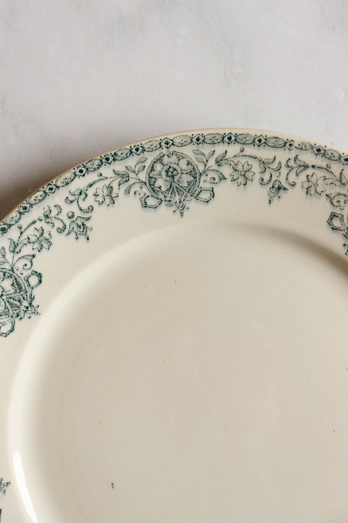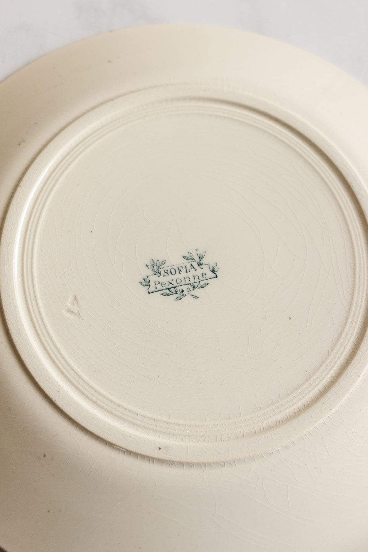 Add to your collection of "art de la table" with the addition of these transferware plates by Pexonne titled "Sofia". The maker's name comes from the commune in North-Eastern France of the same name. These dinner plates have a beautiful intricate design in a classic green and white. Sourced from a brocante in Marseille.