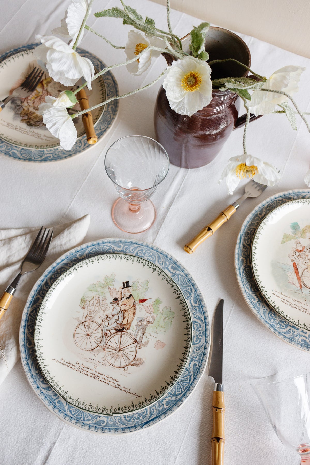 These exquisite antique French talking plates are all different and depicting a different scene. Traditionally, these plates would have been presented towards the end of a meal, aiming to spark dialogue and amuse guests. Now, they make the most beautiful and unique set of hanging plates.