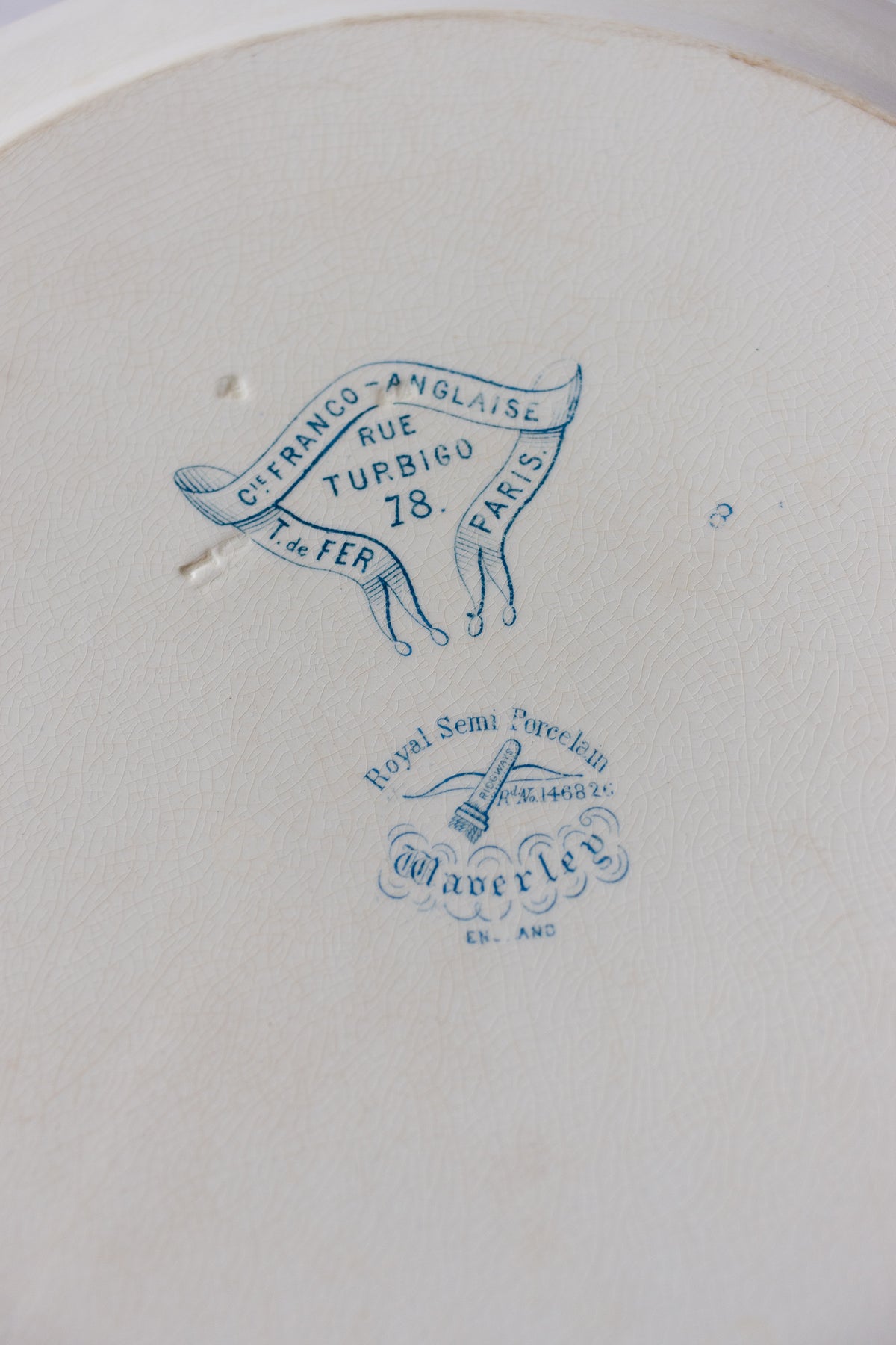 A beautifully detailed floral transferware platter, in a gorgeous soft blue with scalloped edges. This platter has beautiful crazing and some staining that does not affect the functionality of the piece and only adds to its patina and beauty.