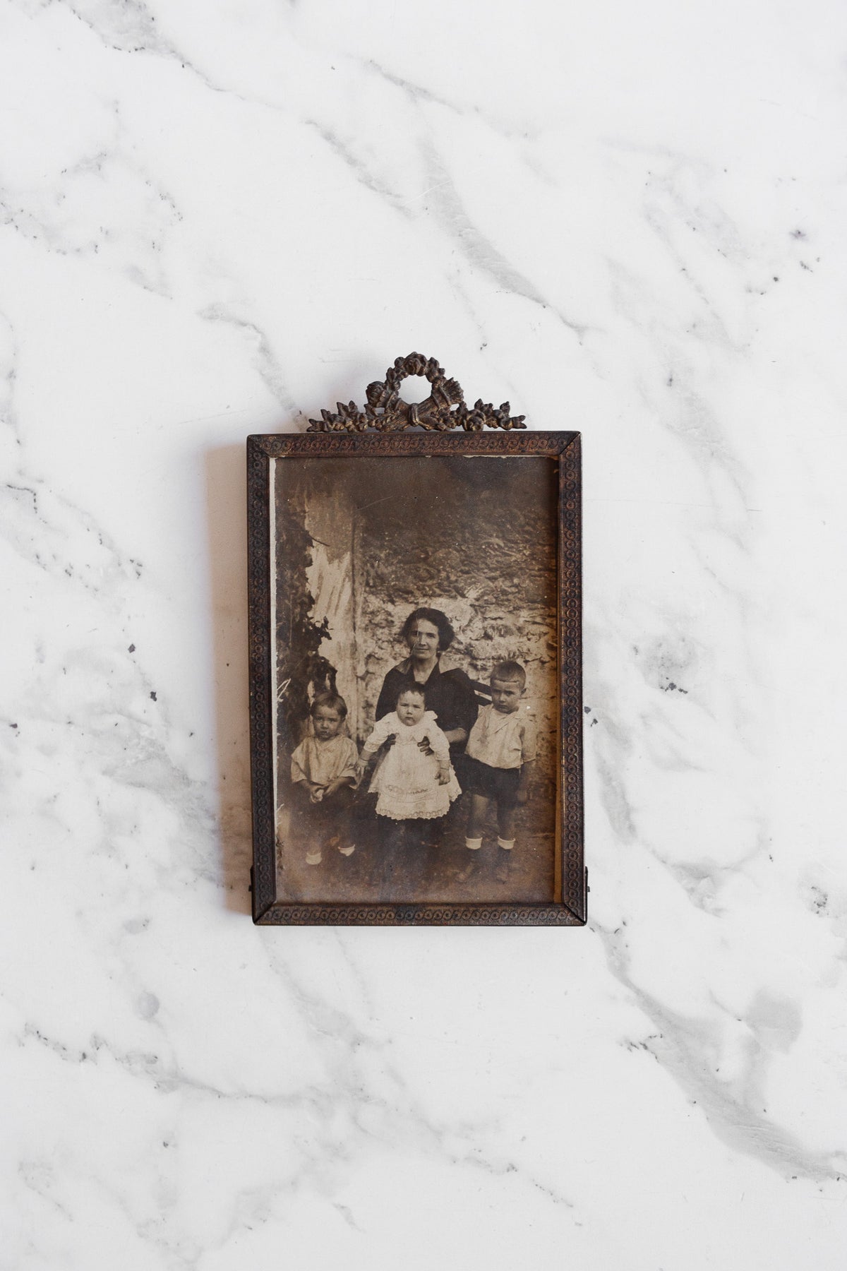 A lovely antique brass picture frame with a gilt finish and a quintessentially french louis xv style bow adornment. Pictured with the original photo, you can swap this out for one of your own if you so choose.