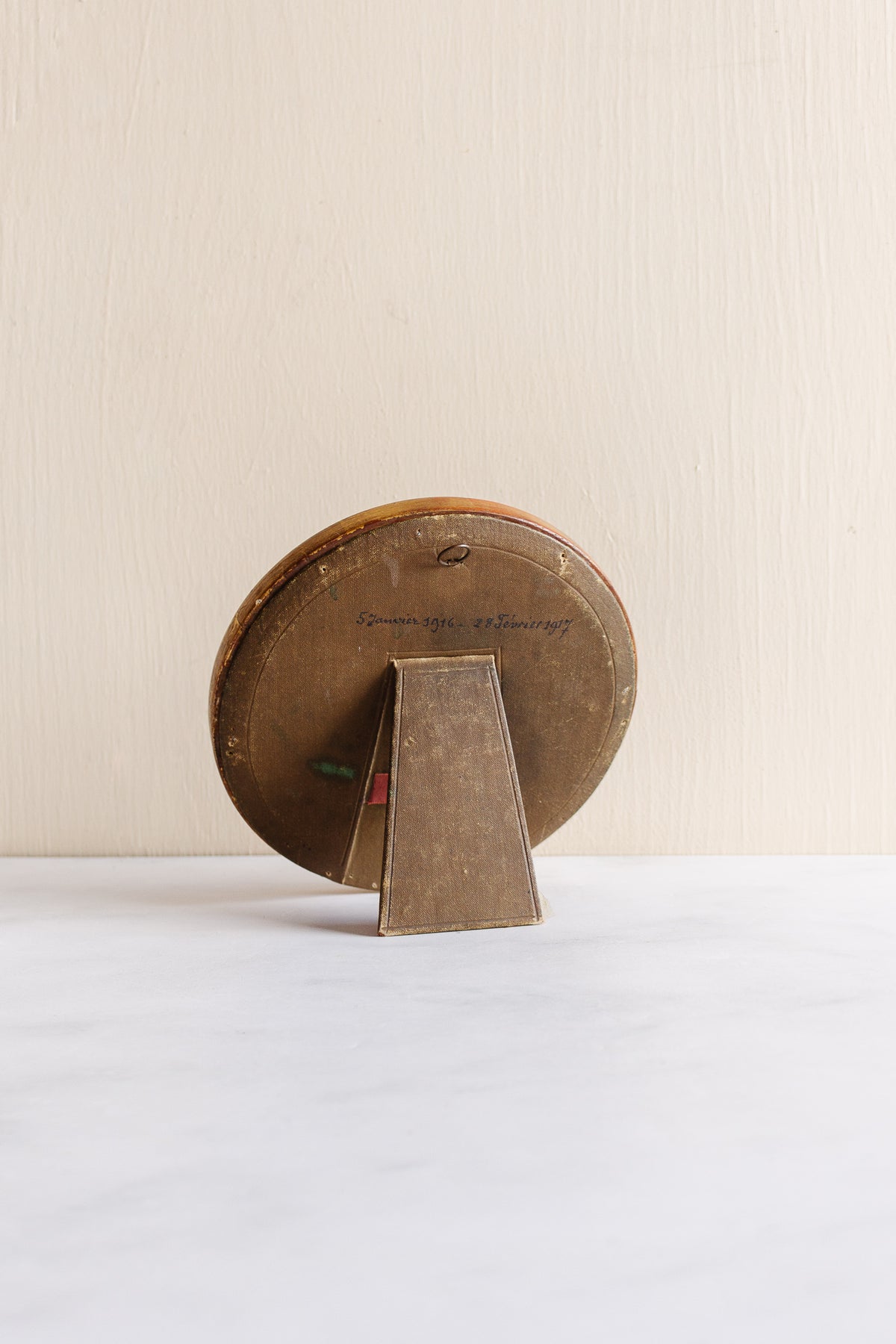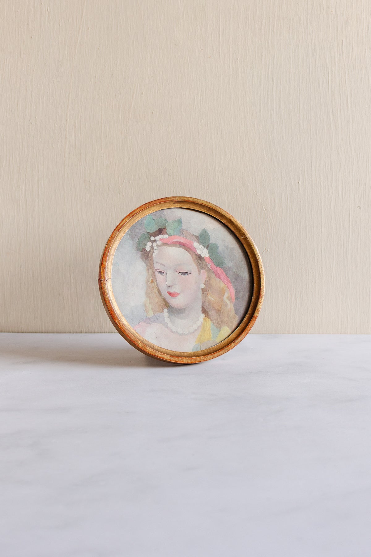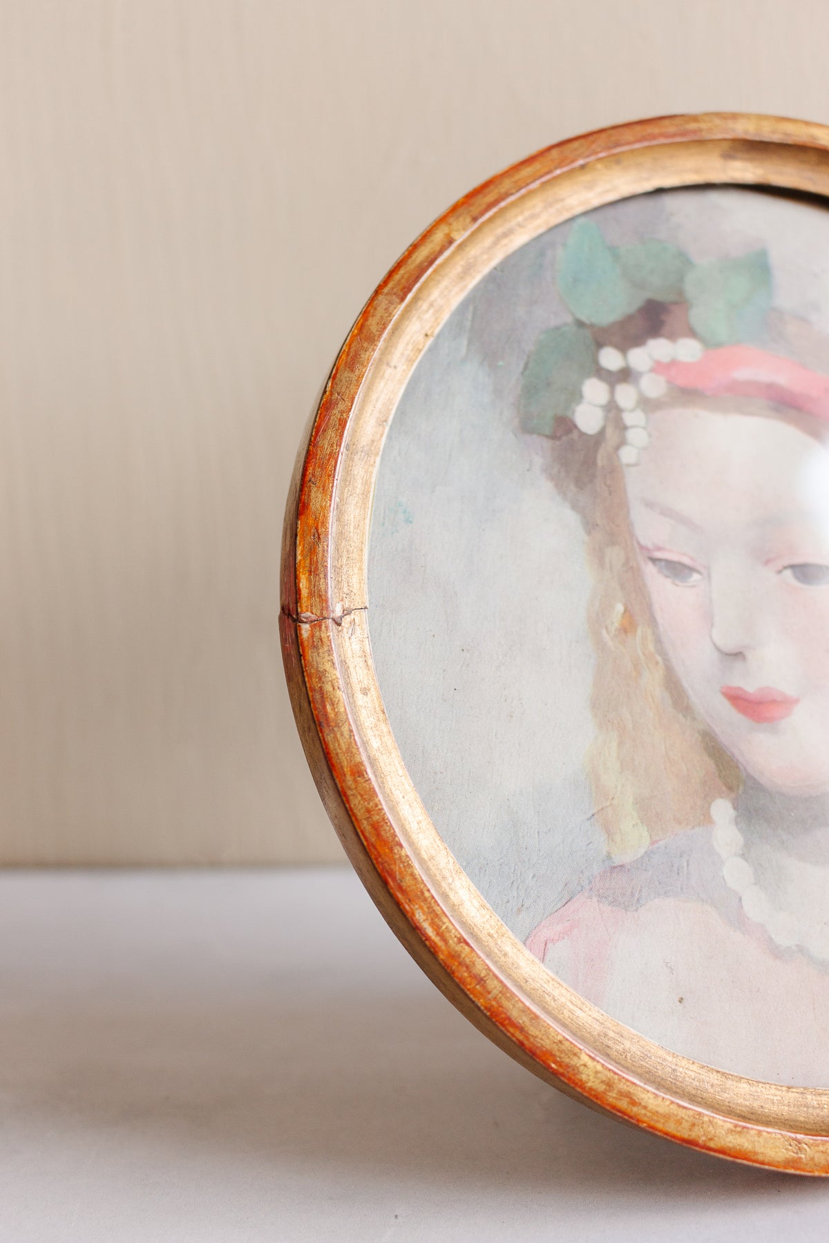 A beautiful antique French portrait print on paper, framed in an original, rare to find and highly sought after circular gilt wood frame that is a work of art in itself. On the reverse, the previous owner wrote two dates in elegant script: January 5, 1916–February 28, 1917.