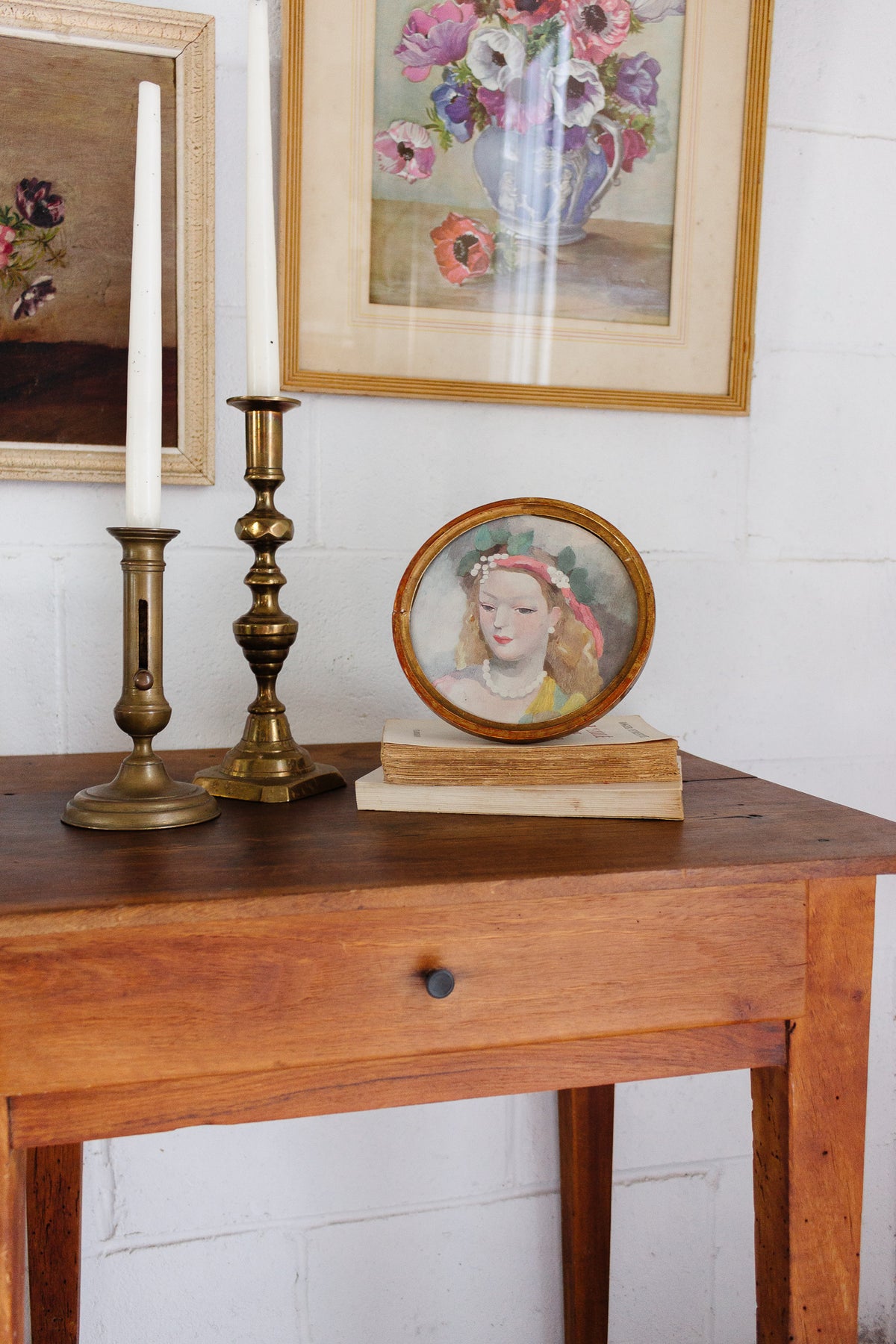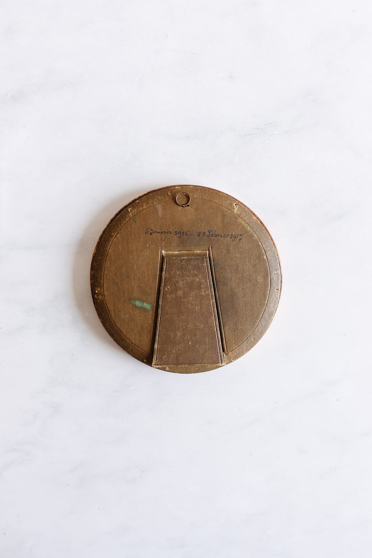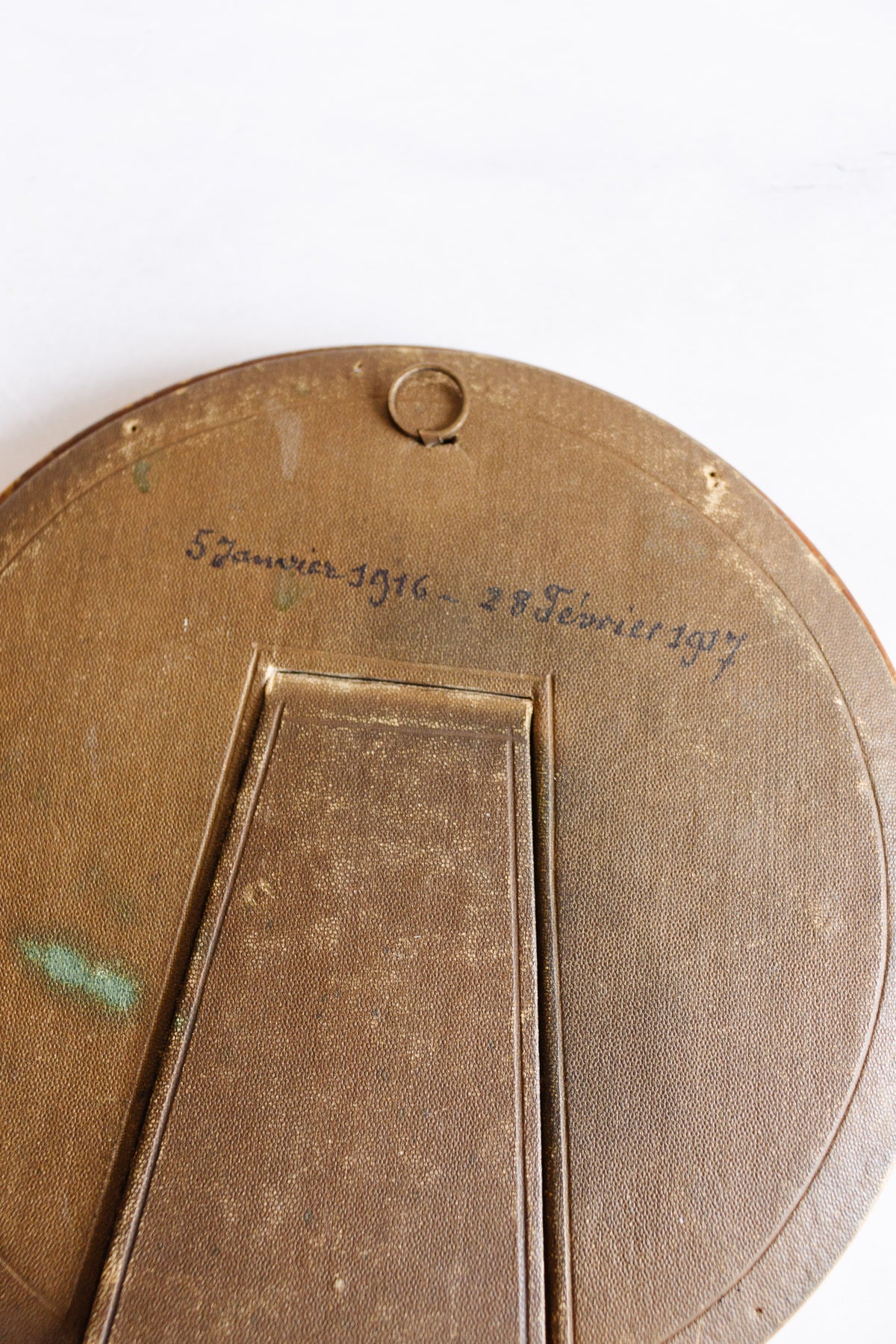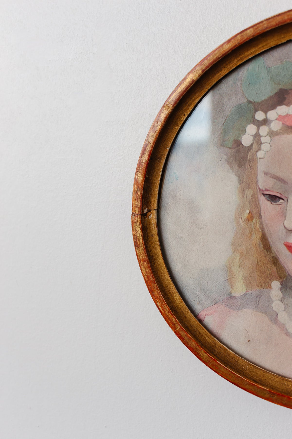 A beautiful antique French portrait print on paper, framed in an original, rare to find and highly sought after circular gilt wood frame that is a work of art in itself. On the reverse, the previous owner wrote two dates in elegant script: January 5, 1916–February 28, 1917.
