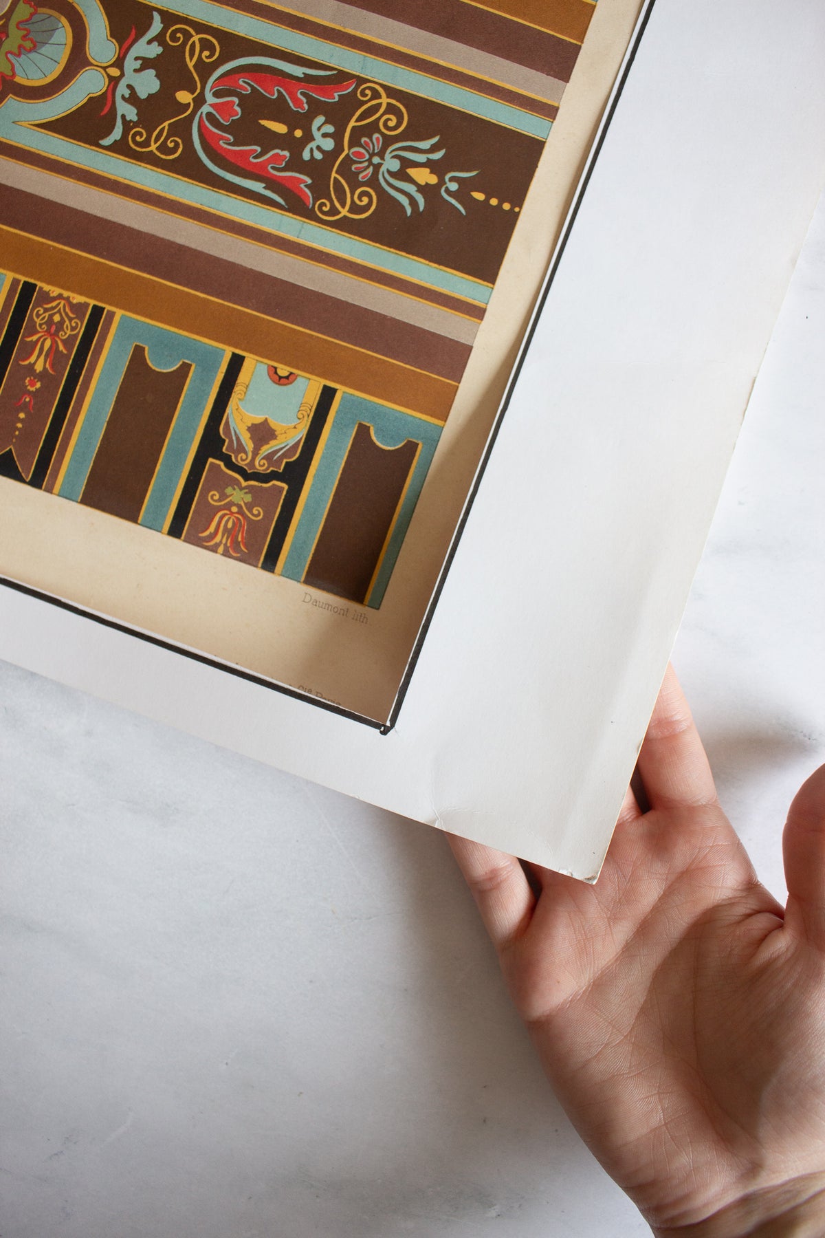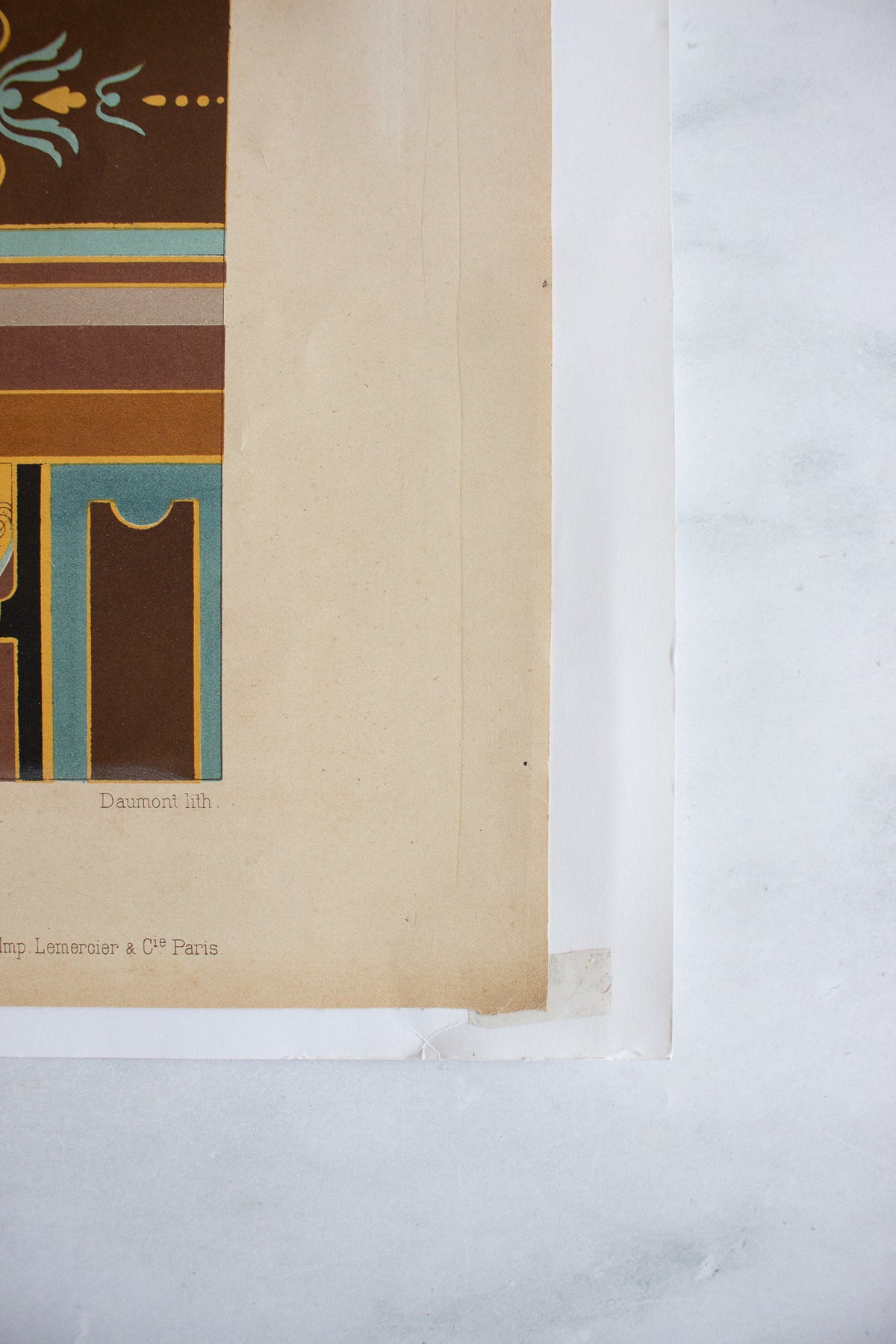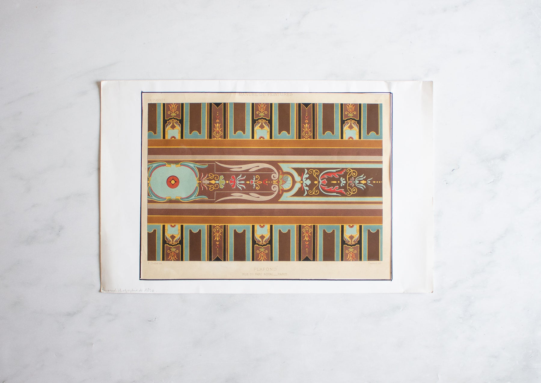 This exquisite antique french chromolithograph is dated 1890 and was printed in France. Printed on thick paper and on an oversized page, this piece is ready to frame and display.  The colorful pattern feels a bit like the 1960s but the elevated shapes and patterns quickly dismiss this idea. Sourced from an estate in Marseille.