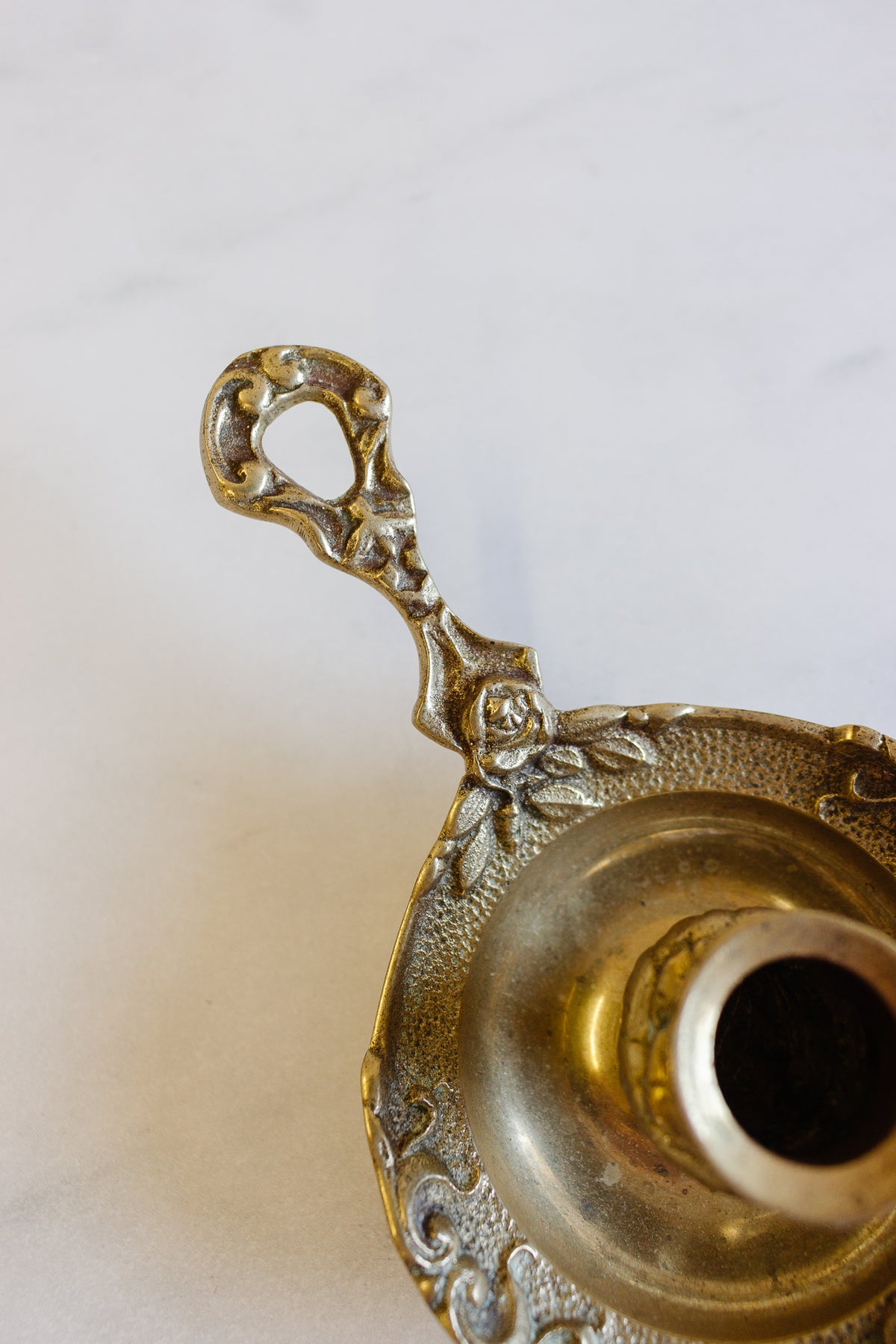 This beautifully crafted chamber stick was sourced from a market in Marseille. We love the stunning and rarely seen floral details that make it a timeless and one of a kind piece.