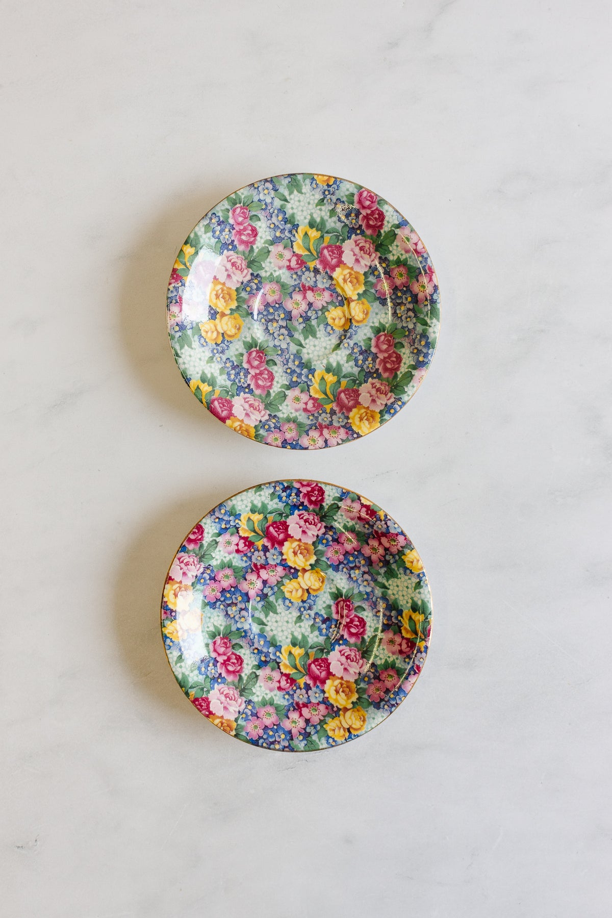 Sweet little brightly coloured floral saucers, in excellent condition with no chips or cracks. By Royal Winton Grimwades in their "Julia" pattern circa 1939 to 1954. Use as intended and pair with a teacup for an eclectic set, or repurpose as a stunning catch-all for jewelry and curiosities.