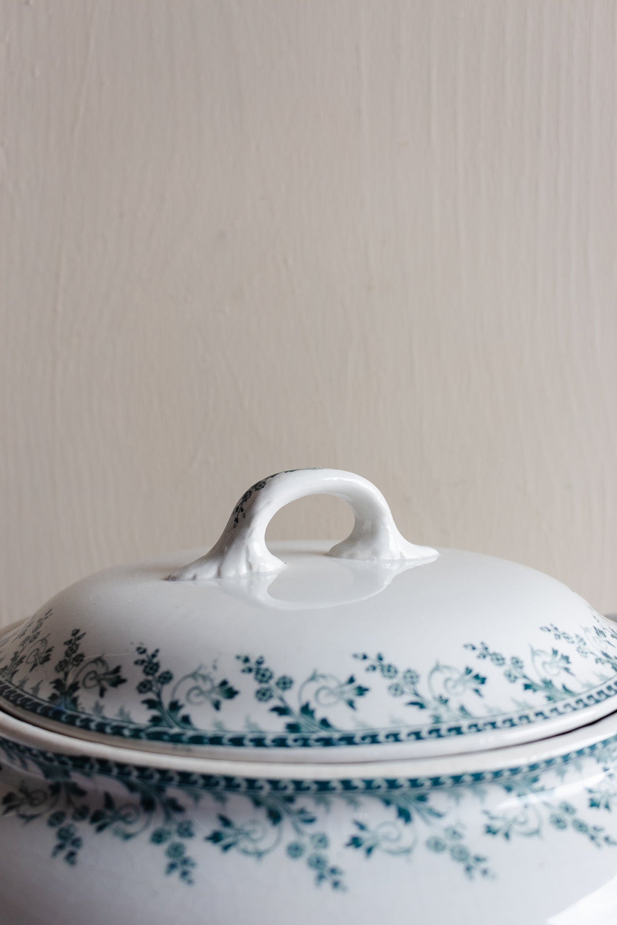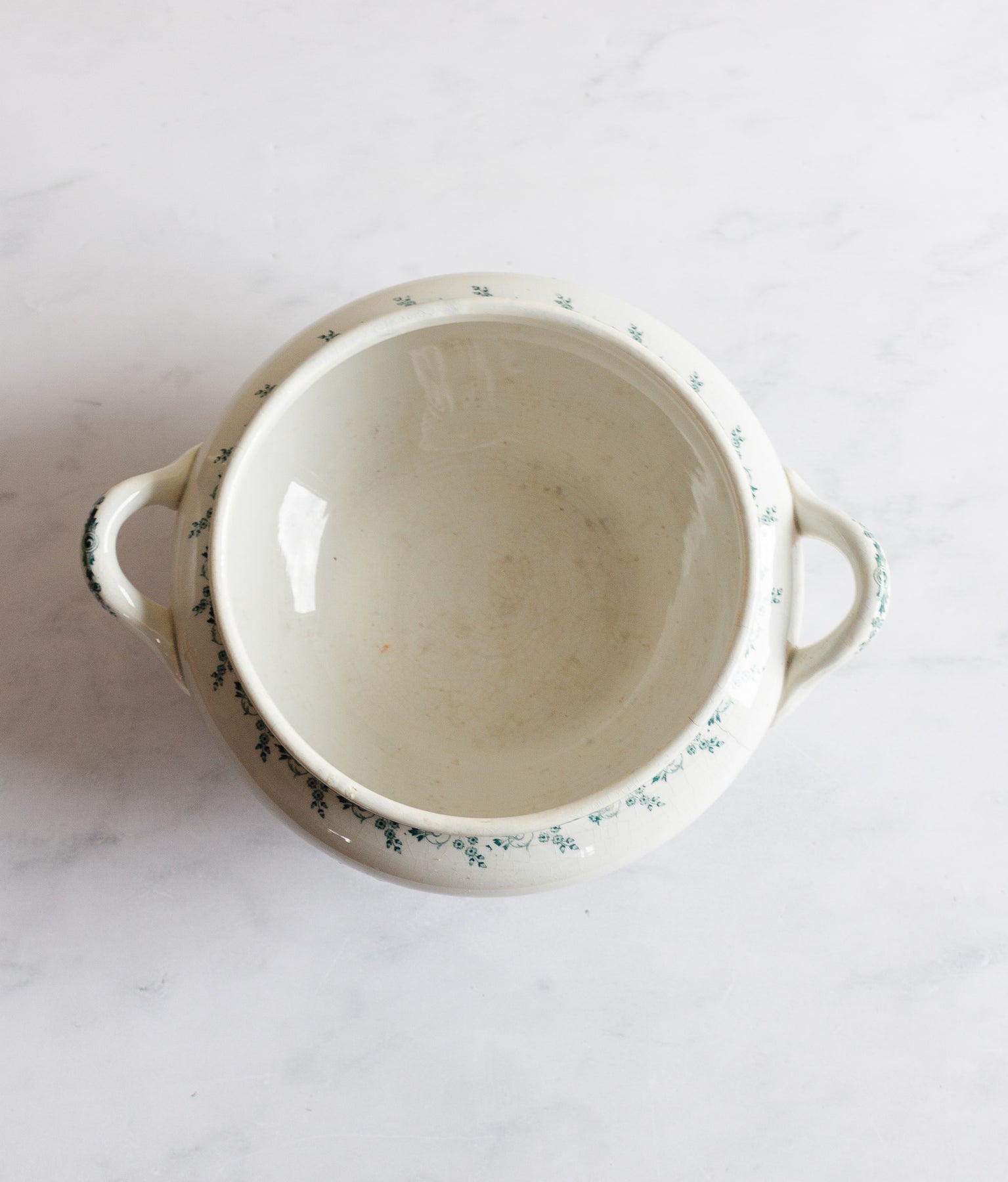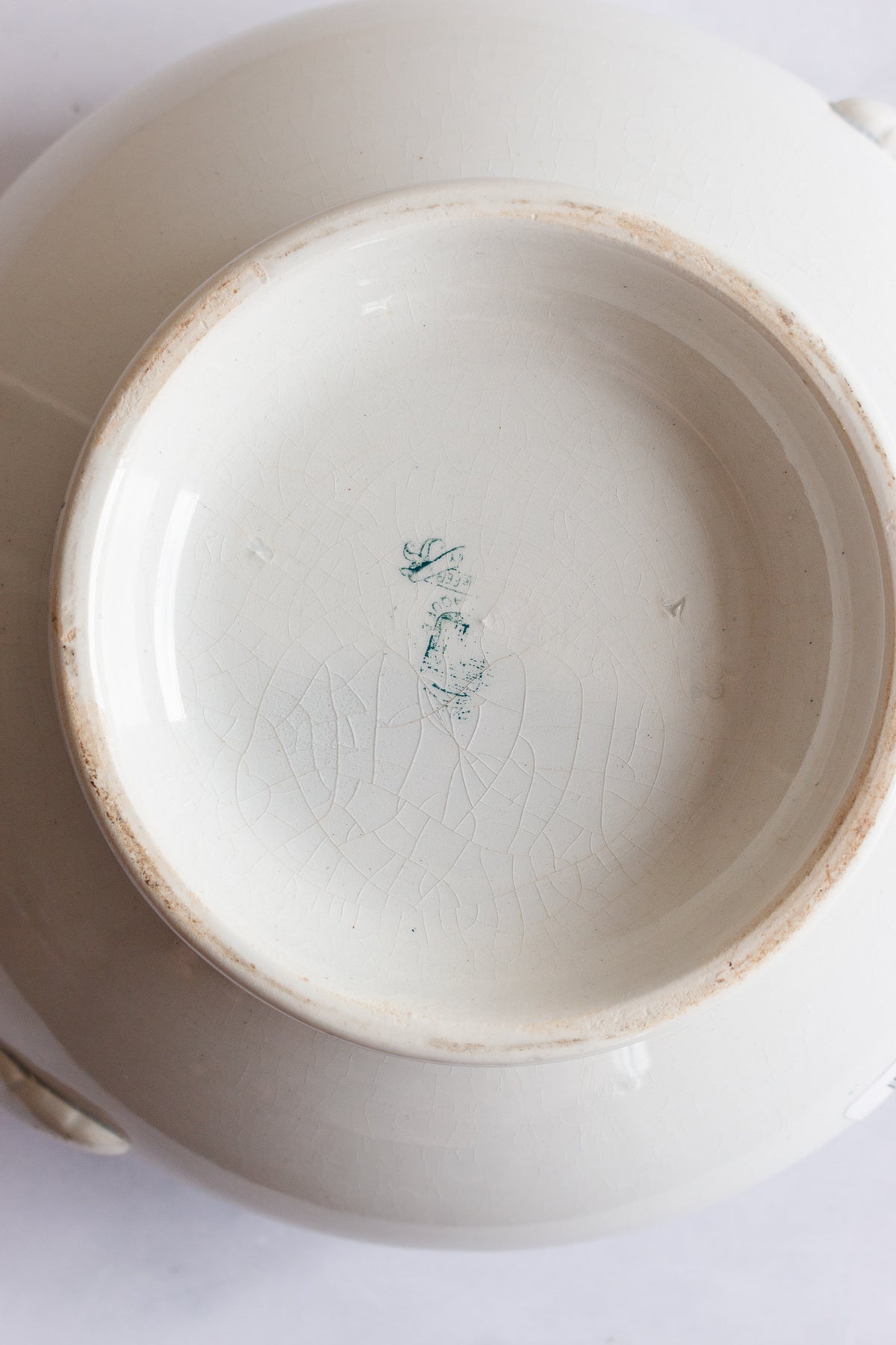 This antique french transferware soupière has lovely signs of age and wear and is full of history. Even the maker's mark on the bottom has worn with time. Imagine hot soup being served at the table in the French countryside from this soupière. It had been passed down through generations and if ready for the next chapter. Make this heirloom piece a part of your "art de la table". Sourced from a farmhouse in Normandie.