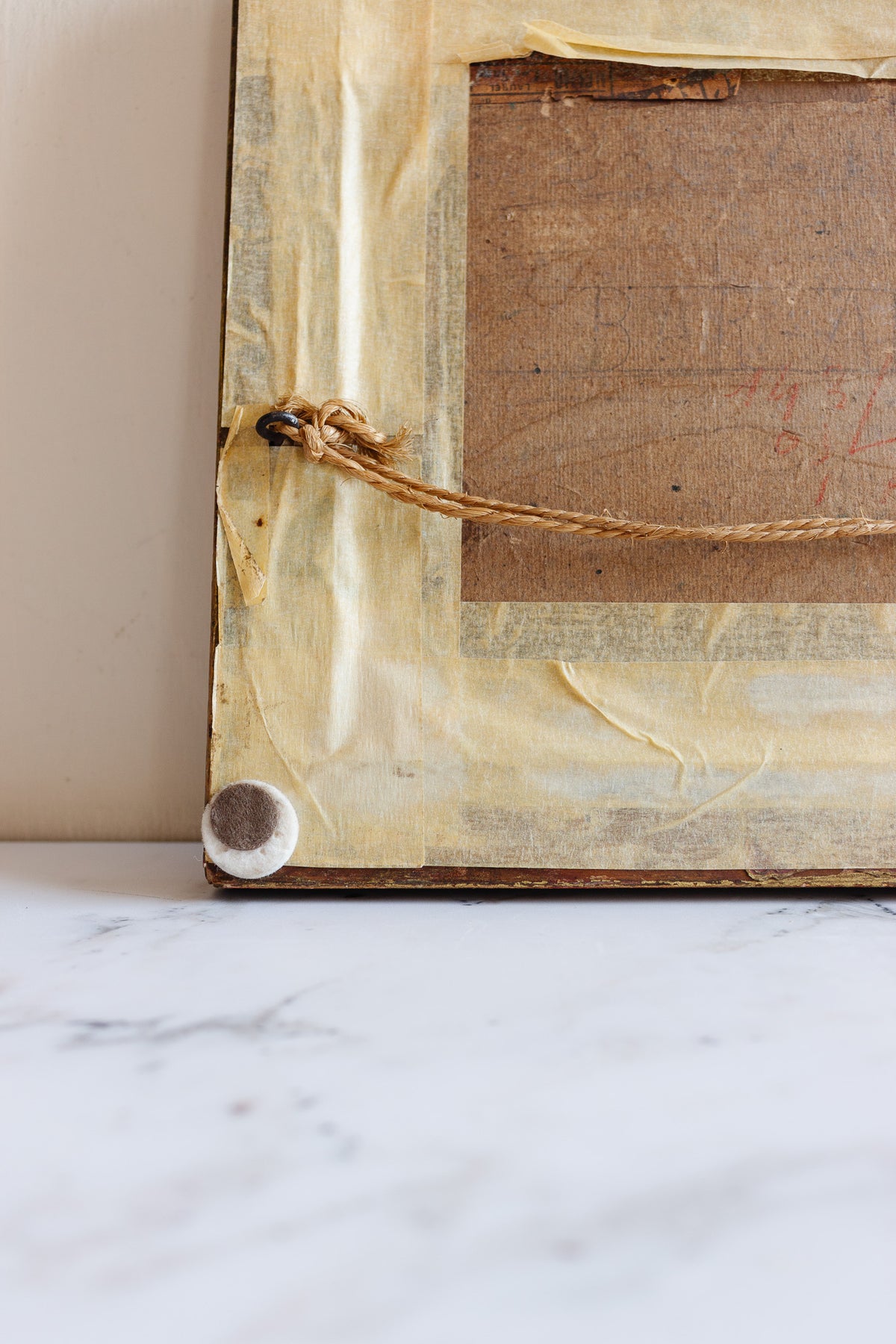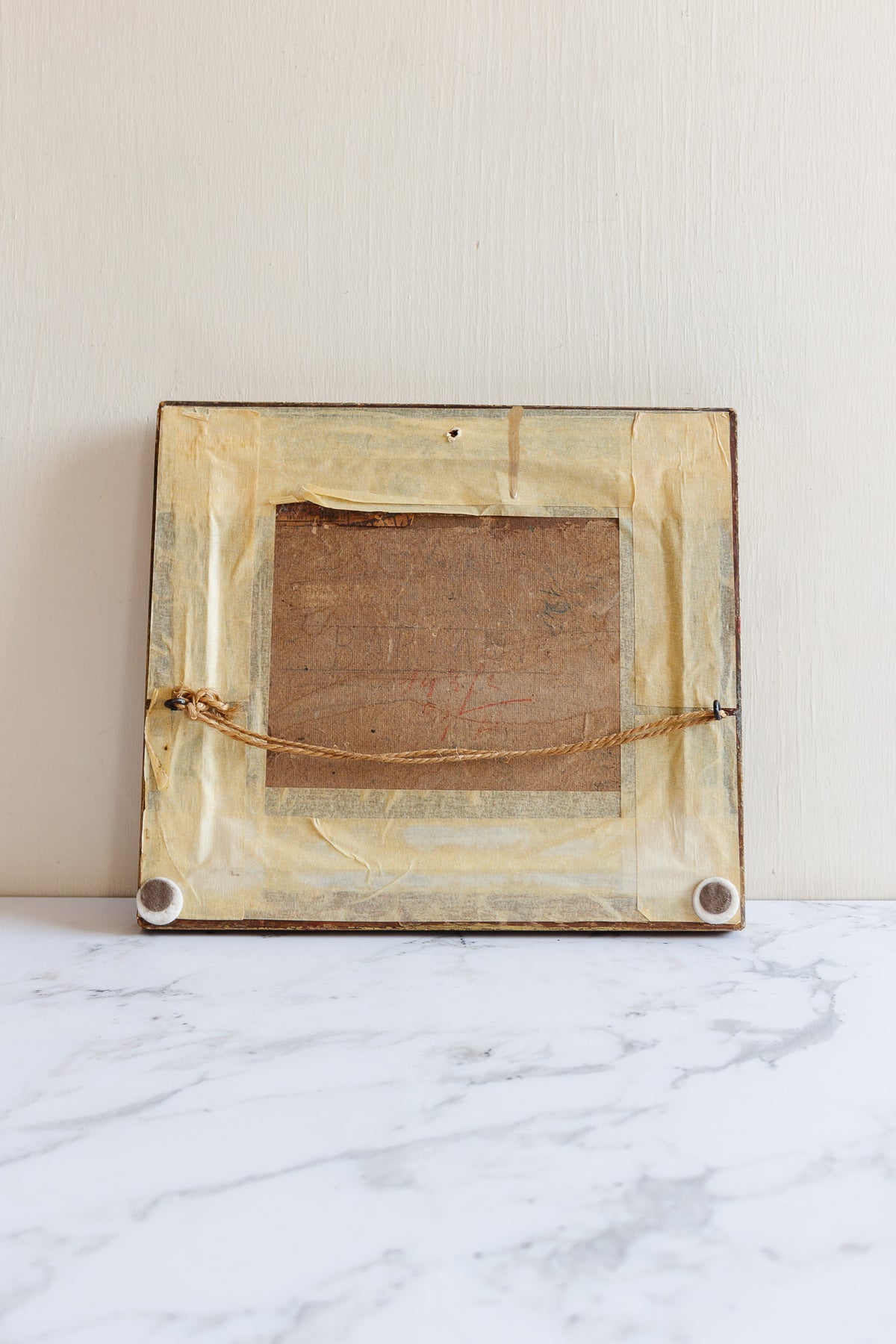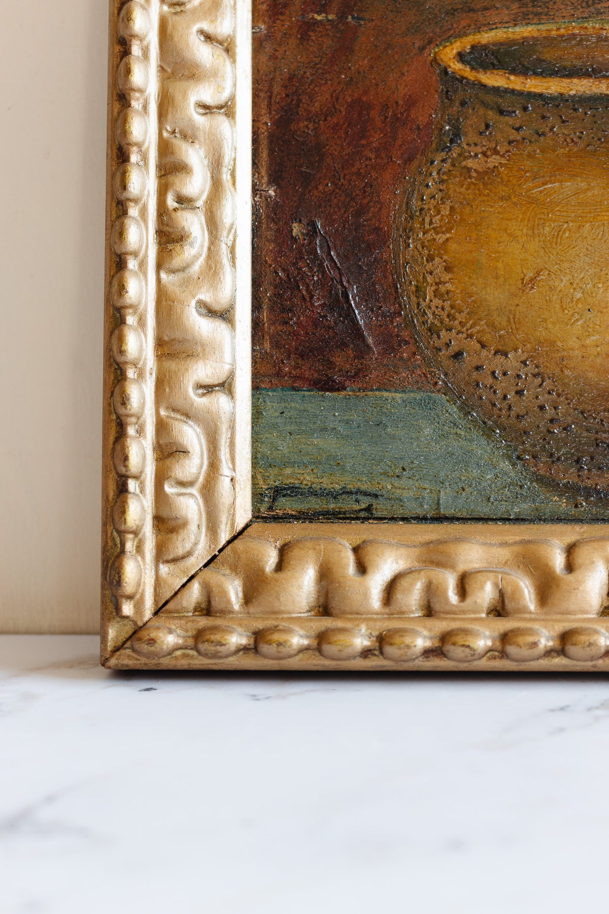 A gorgeous, moody antique French still life oil on board, housed in its original gilt frame as shown.