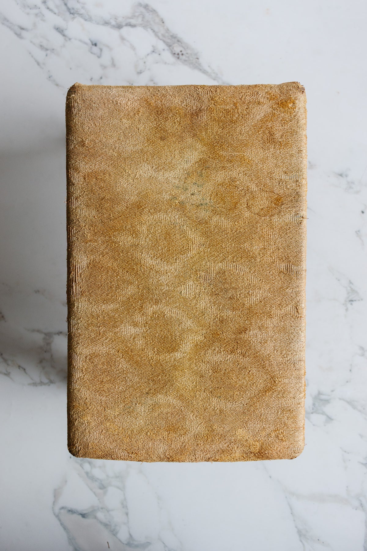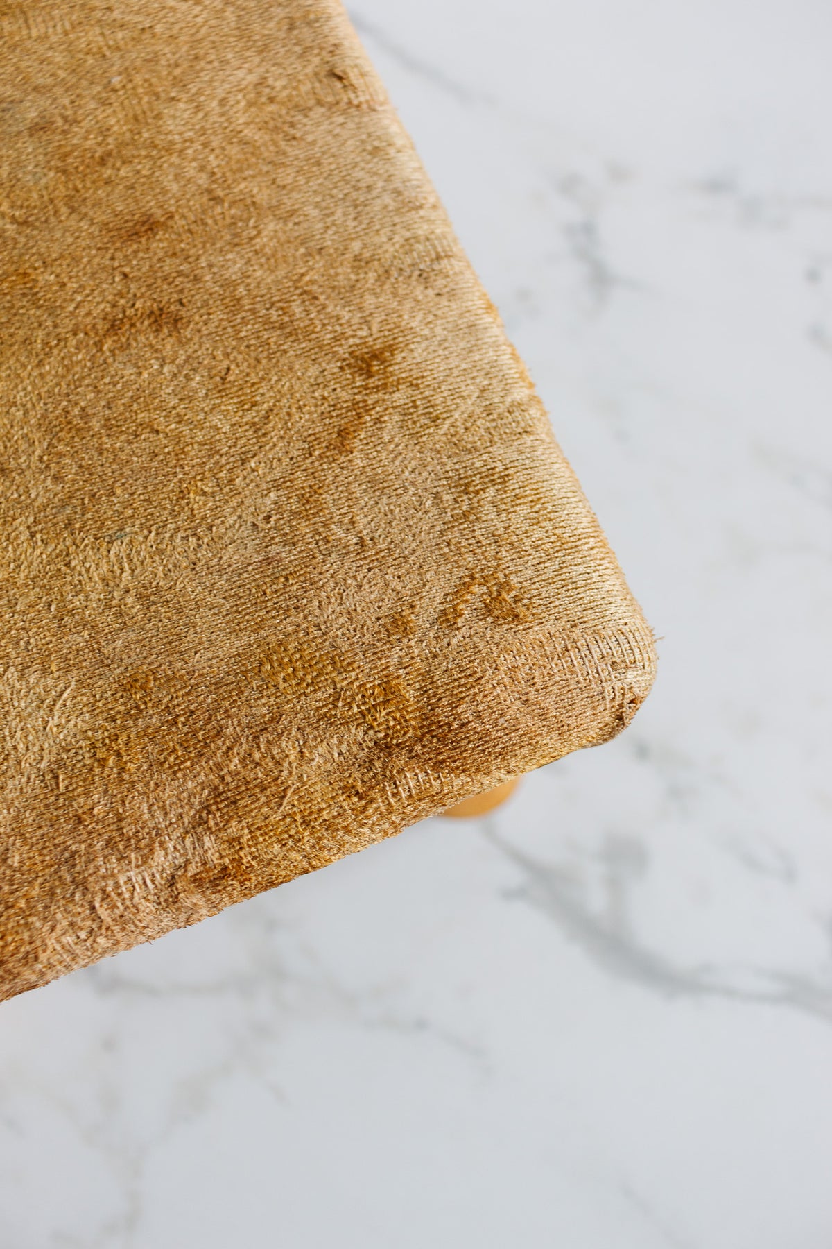 Antique English upholstered footstool with cabriole legs and mustard yellow fabric, sourced from a brocante in Marseille. The fabric has been professionally cleaned, though some staining remains, and the piece shows signs of age and wear consistent with its history. Its compact size and characterful presence make it perfect as a functional accent in a living space or as a decorative piece that tells its story through time-worn details.