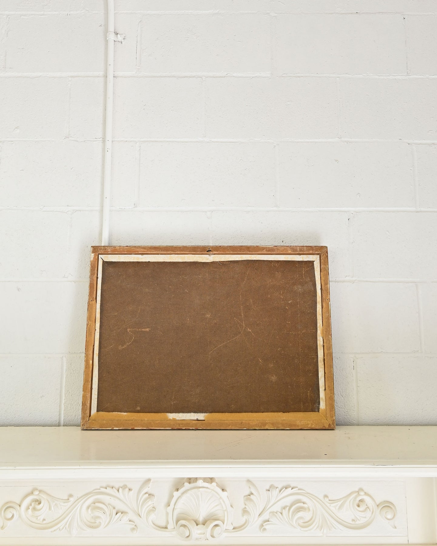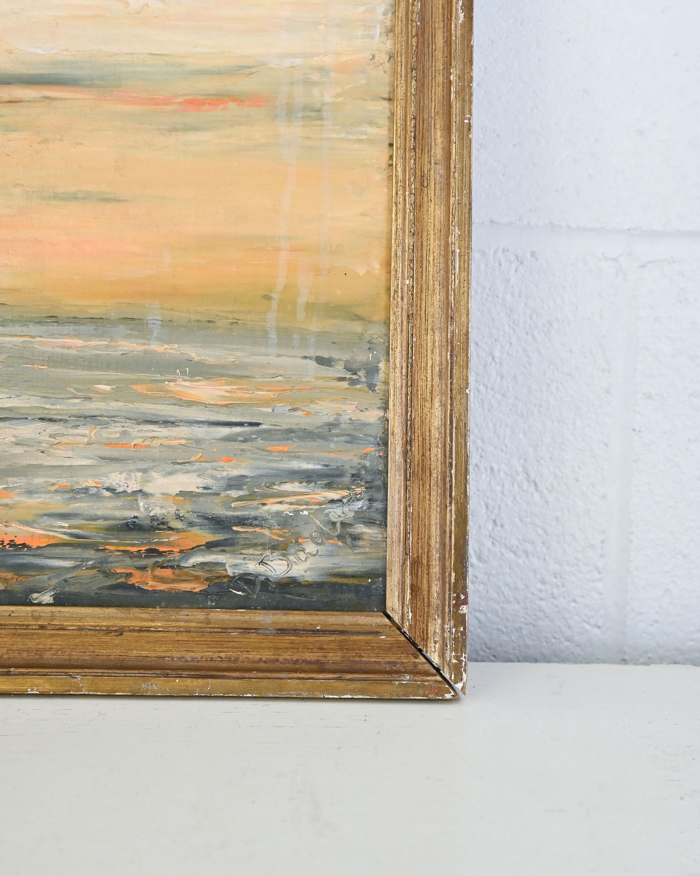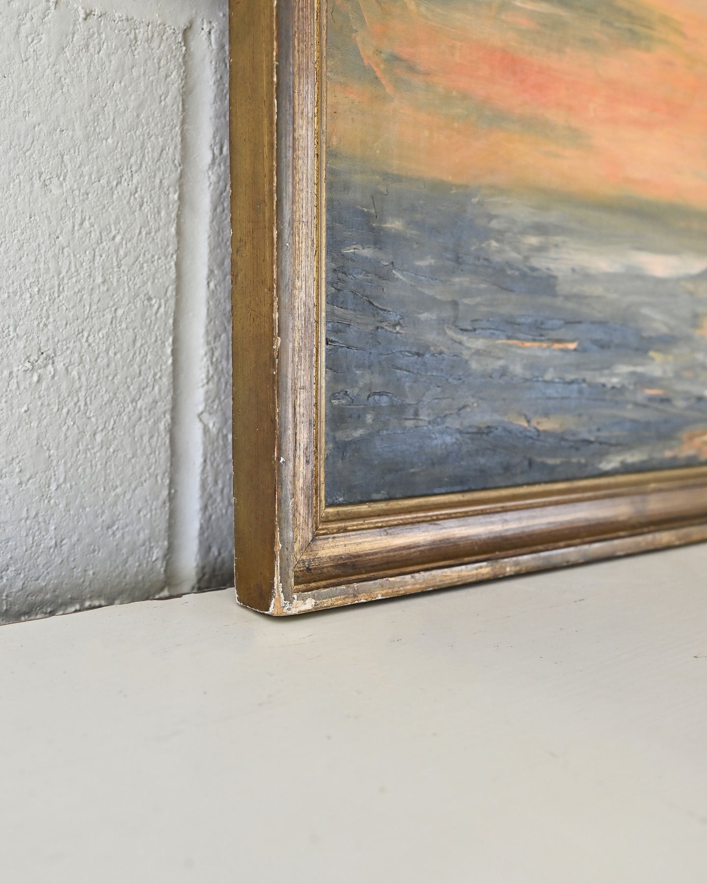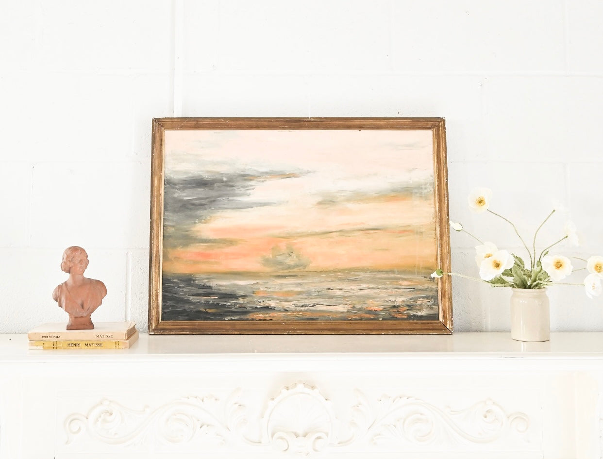 A vintage french oil on board of a gorgeous sunset over the water. We sourced this piece from a home in Aix-en-Provence.  Note there are some light white drips on the right side of the painting. Priced accordingly.