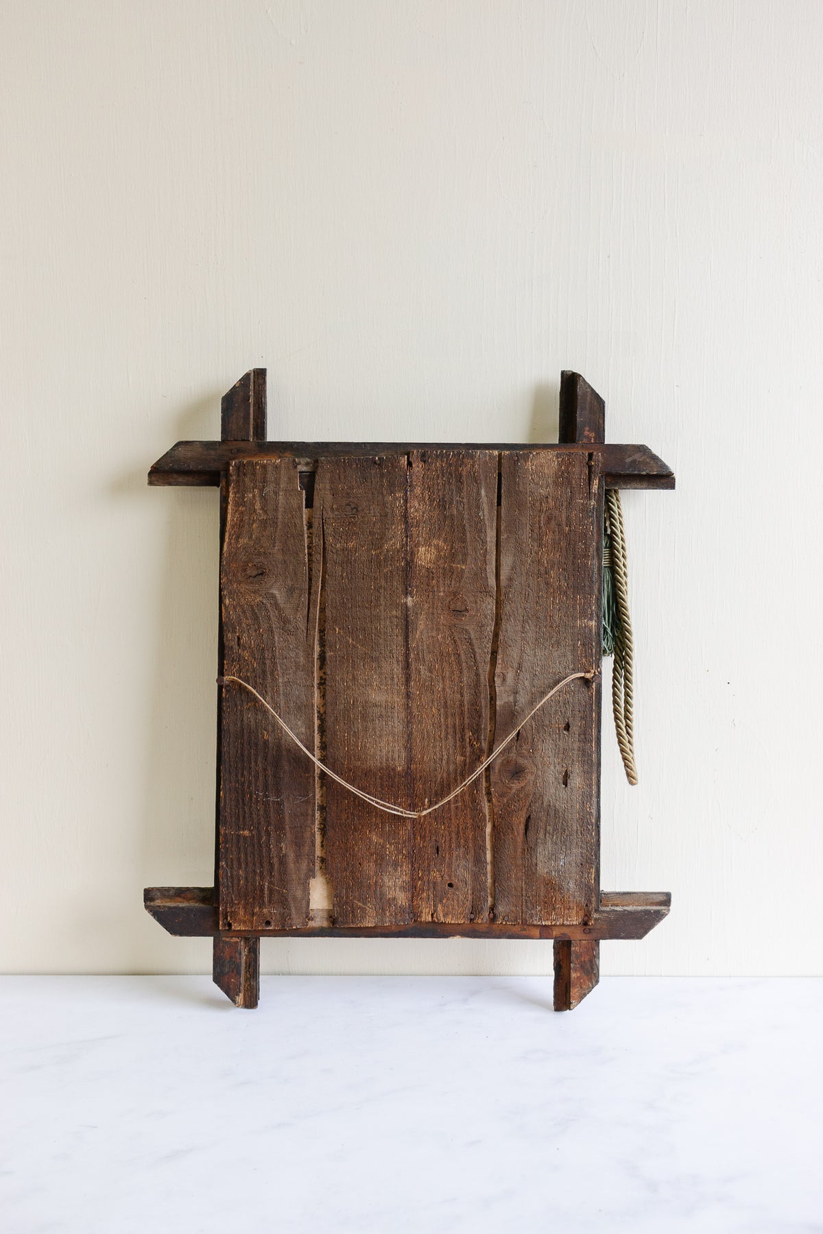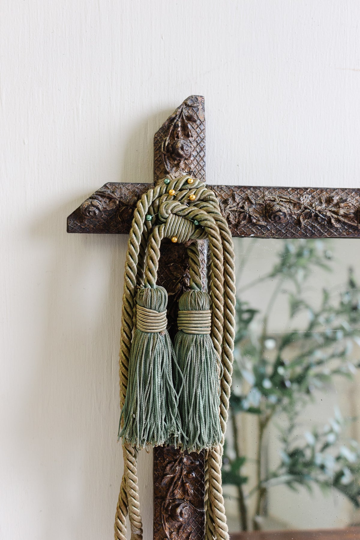 Missing floral plaster element on bottom right corner; distressed; top left corner has had a tassel with pins (not original to mirror) attached to frame