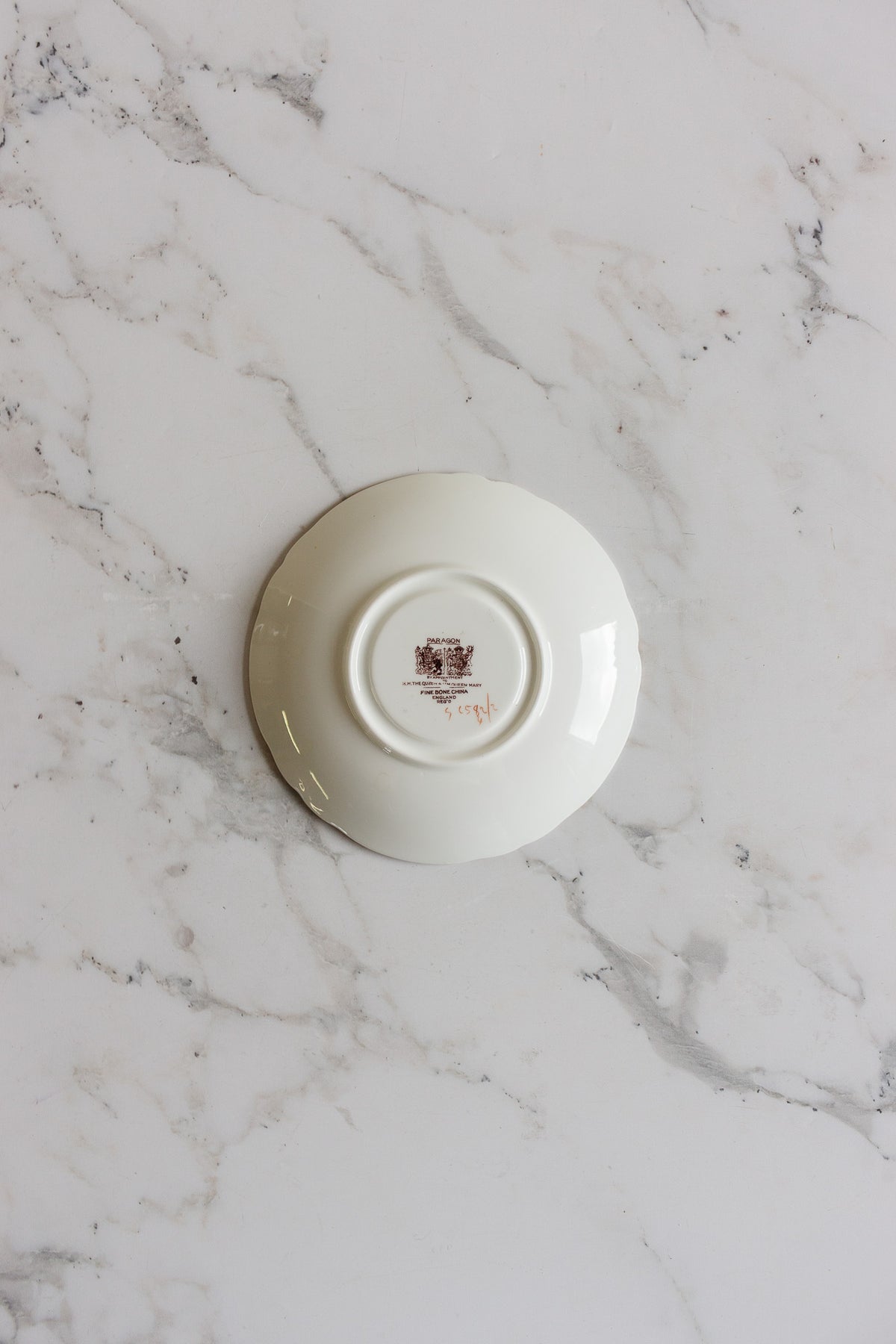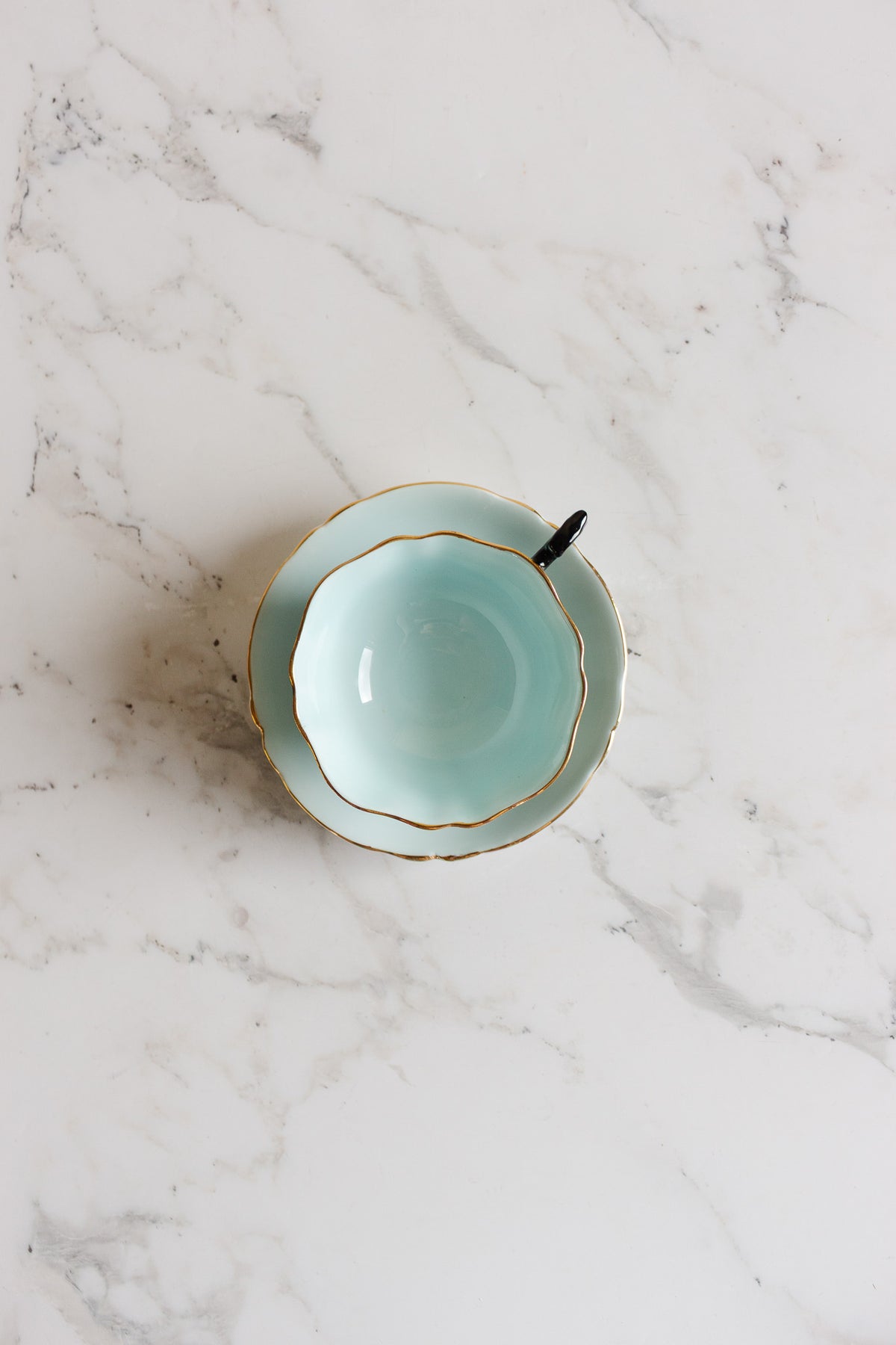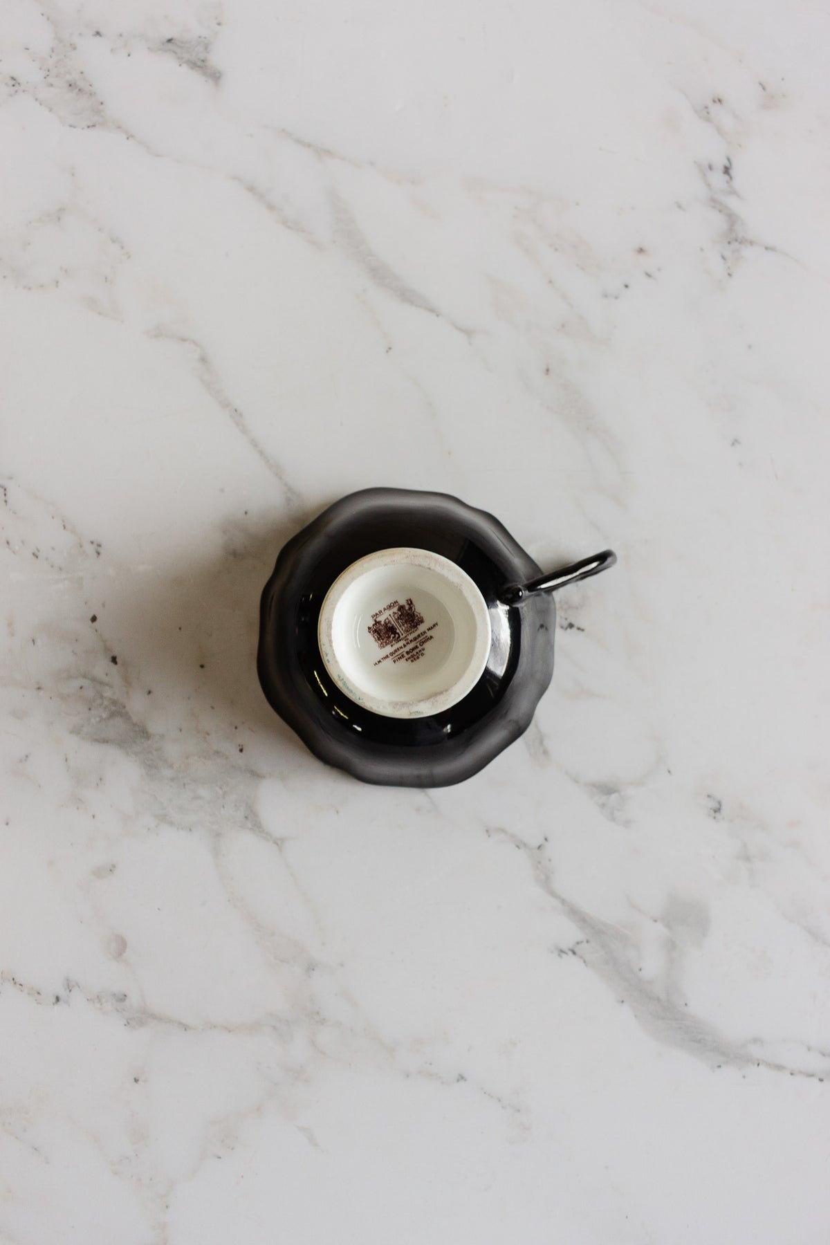 This 1930s Paragon teacup and saucer is a striking example of vintage English elegance. Featuring a double warrant, the cup’s handle and exterior are black, contrasting beautifully with a robin’s egg blue interior and foot. The matching saucer is robin’s egg blue with a central black circle, completing the bold, Art Deco-inspired look. Sourced from a brocante in Marseille, it is in excellent vintage condition, perfect for display or adding a touch of refined style to your tea service.