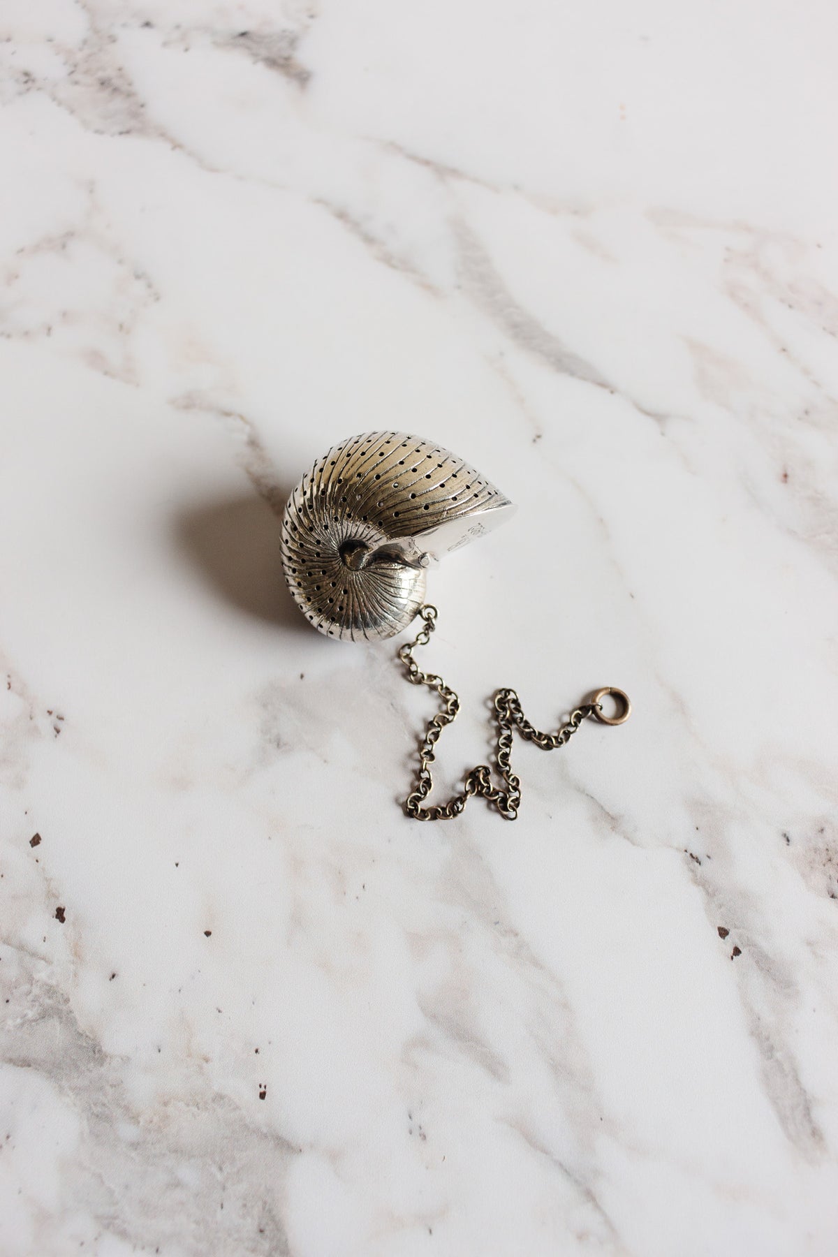 An absolutely incredible, truly one of a kind heirloom, this turn of the century petite sterling silver tea infuser was beautifully crafted by English silversmith Birmingham, in a rarely seen nautilus shape. It also has an extra special feature. Since it was likely a gift of remembrance, it features a personalized engraved monogram and date.
