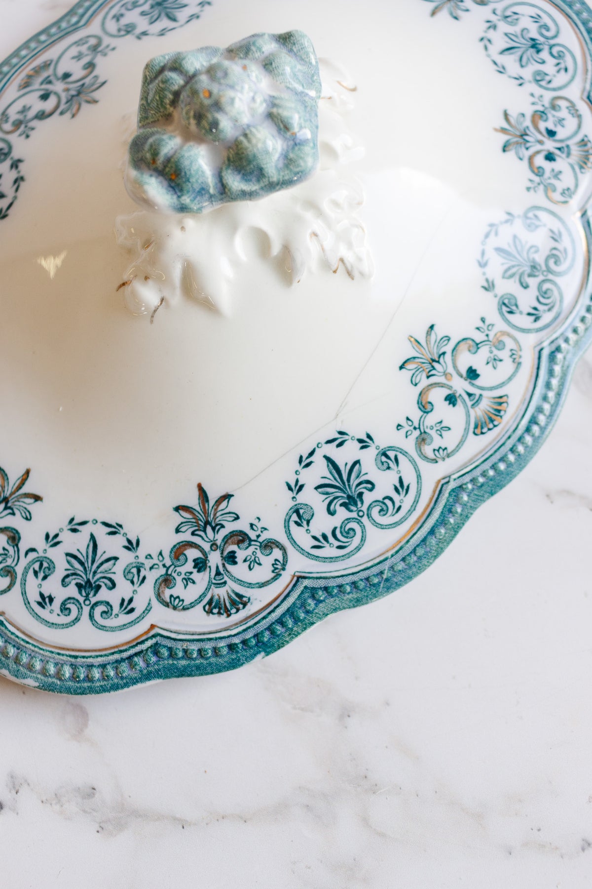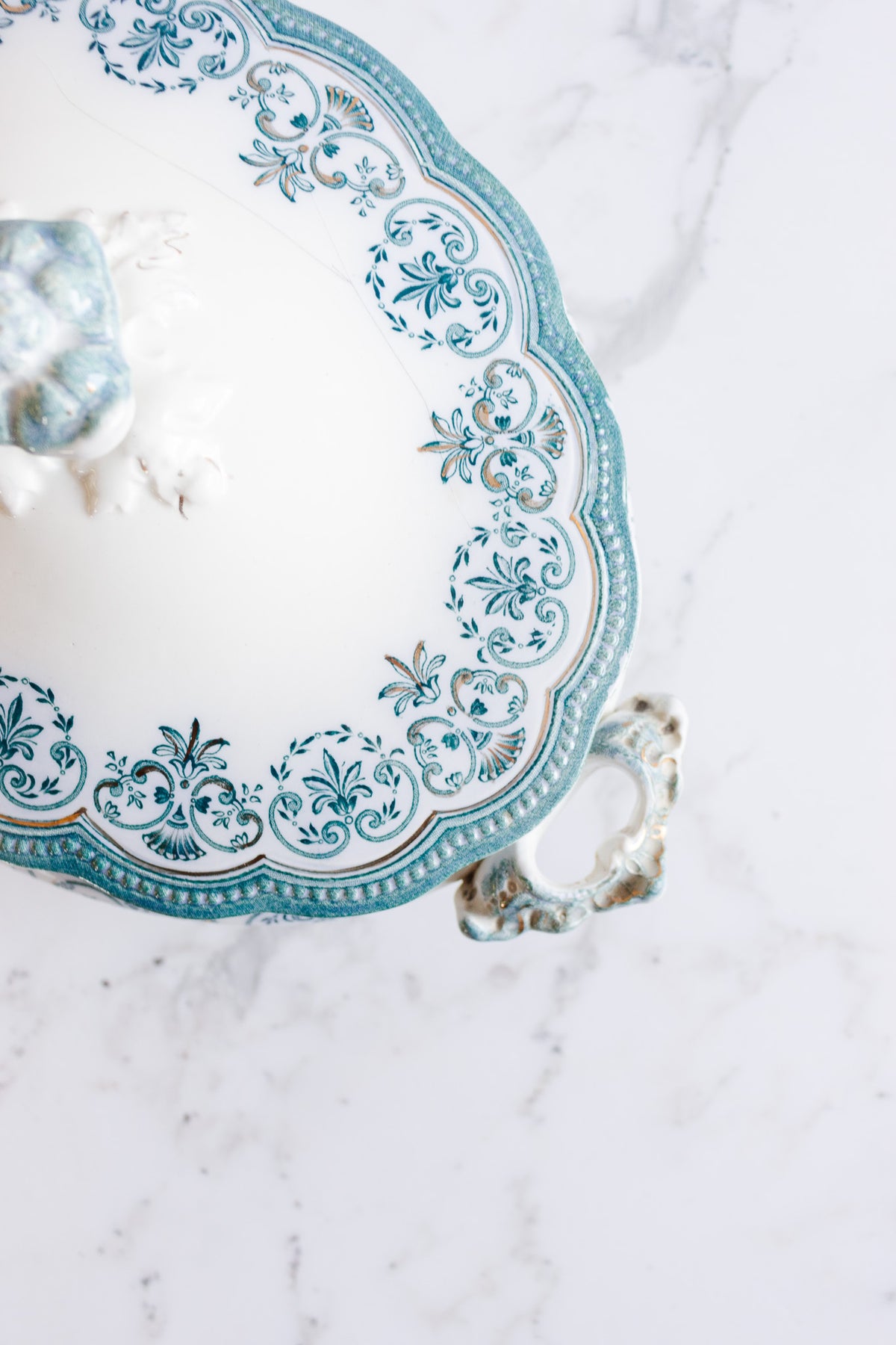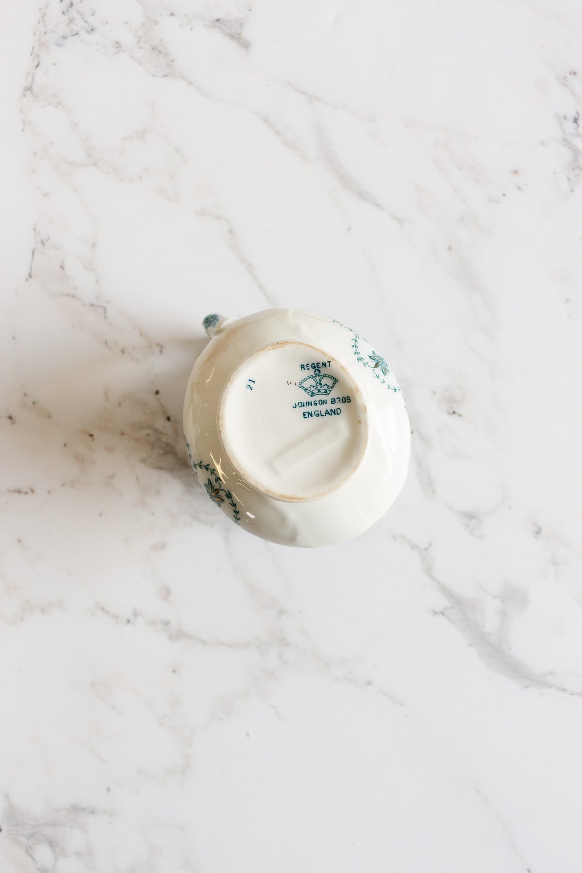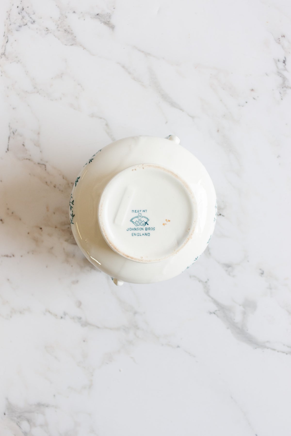 The Johnson Brothers' "Regent" pattern, featuring an aqua design with gold accents, is a vintage china collection produced in England.