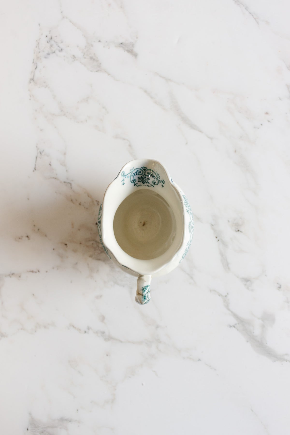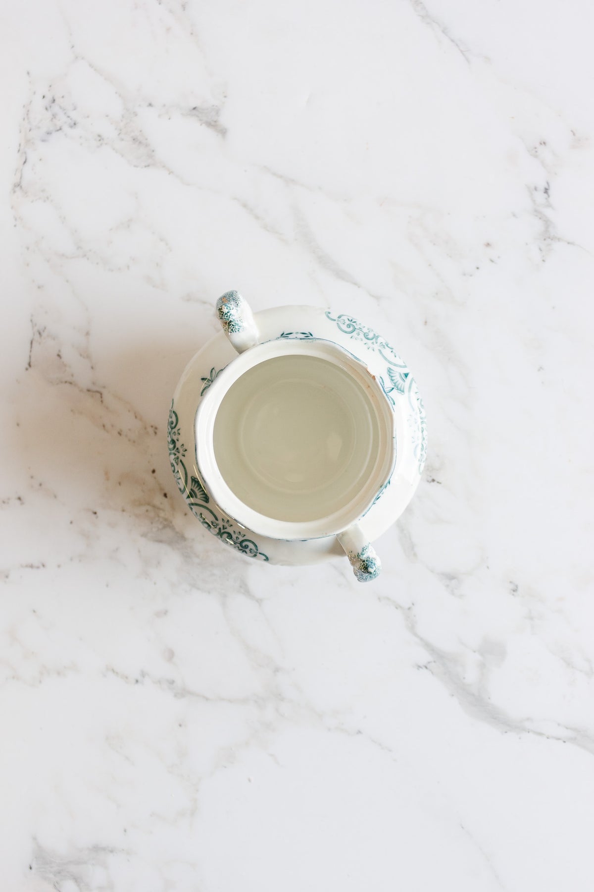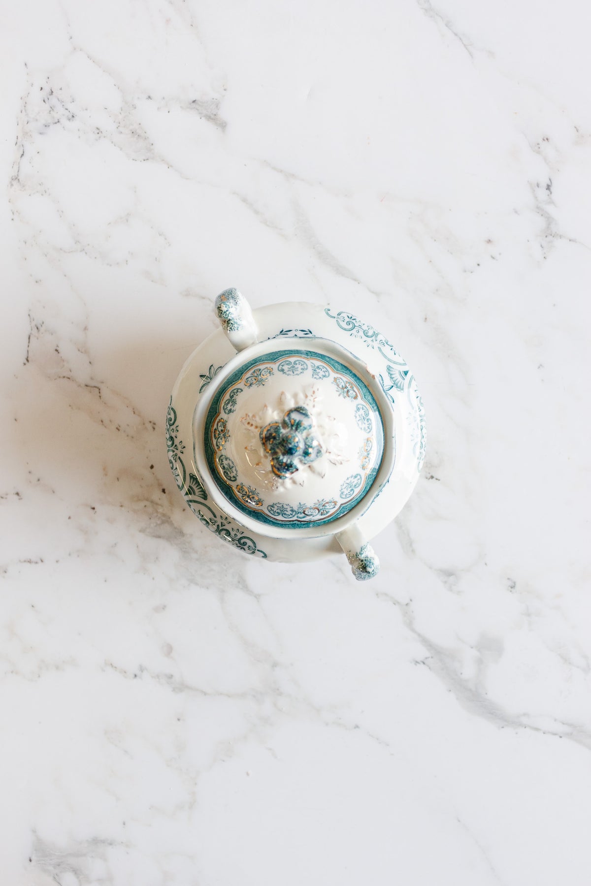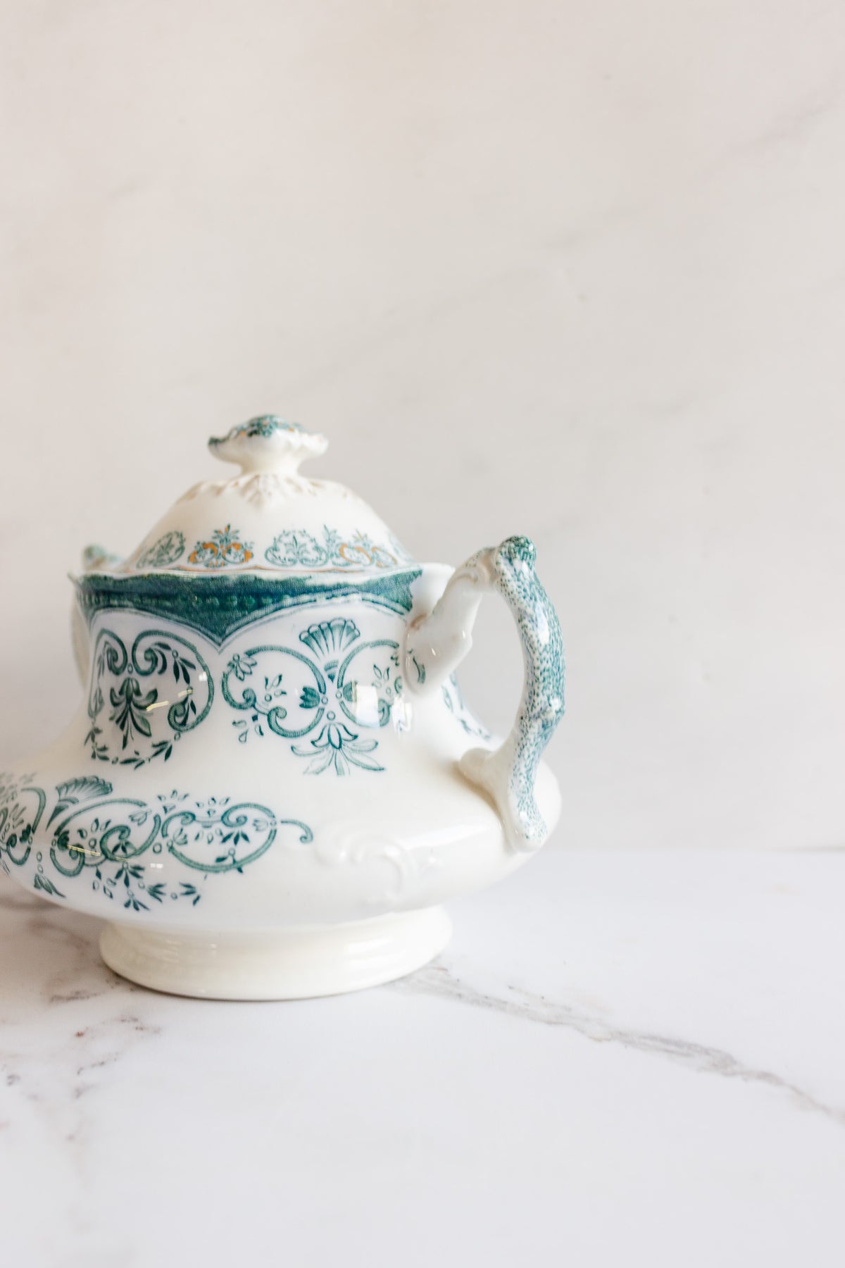 The Johnson Brothers' "Regent" pattern, featuring an aqua design with gold accents, is a vintage china collection produced in England.