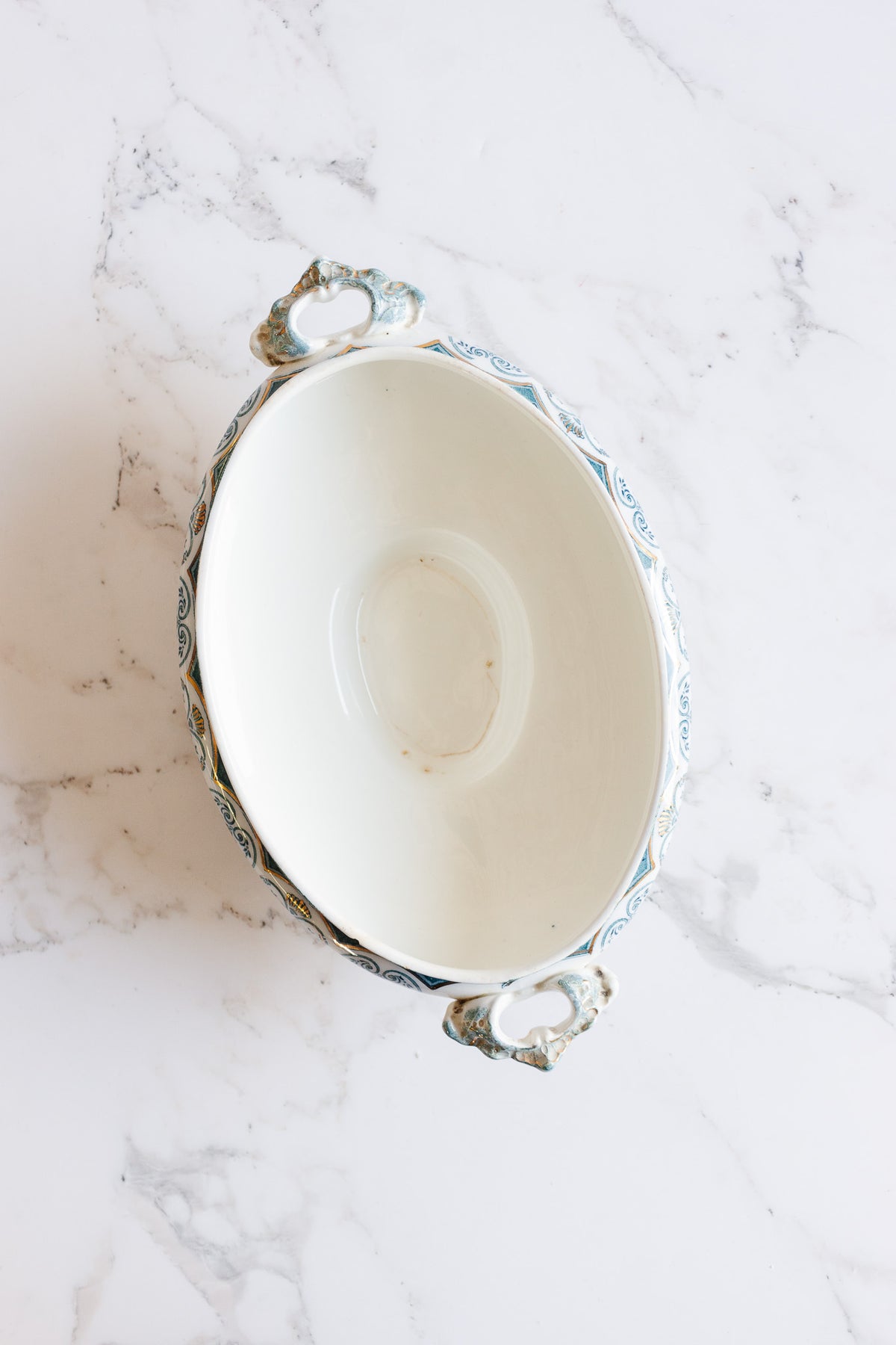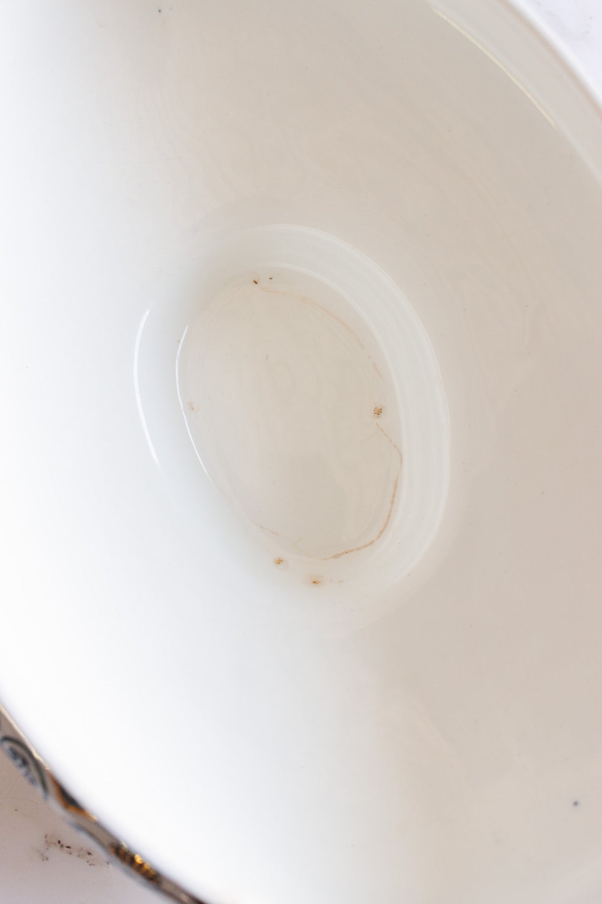 Sold as a set of a creamer, sugar bowl, and covered dish. Please note the signs of age and wear as pictured including chips, a hairline crack in the dish lid, and some discoloration.
