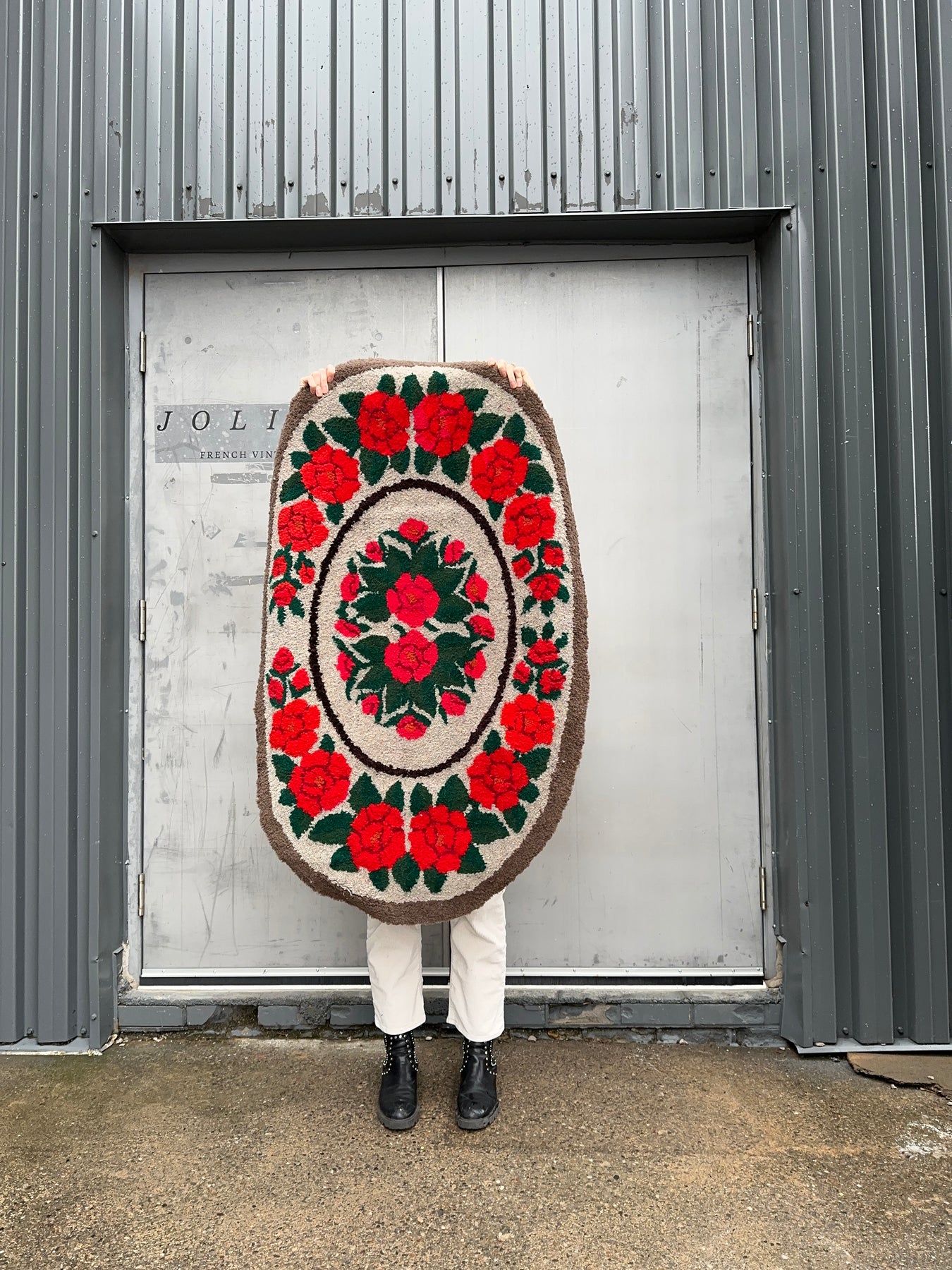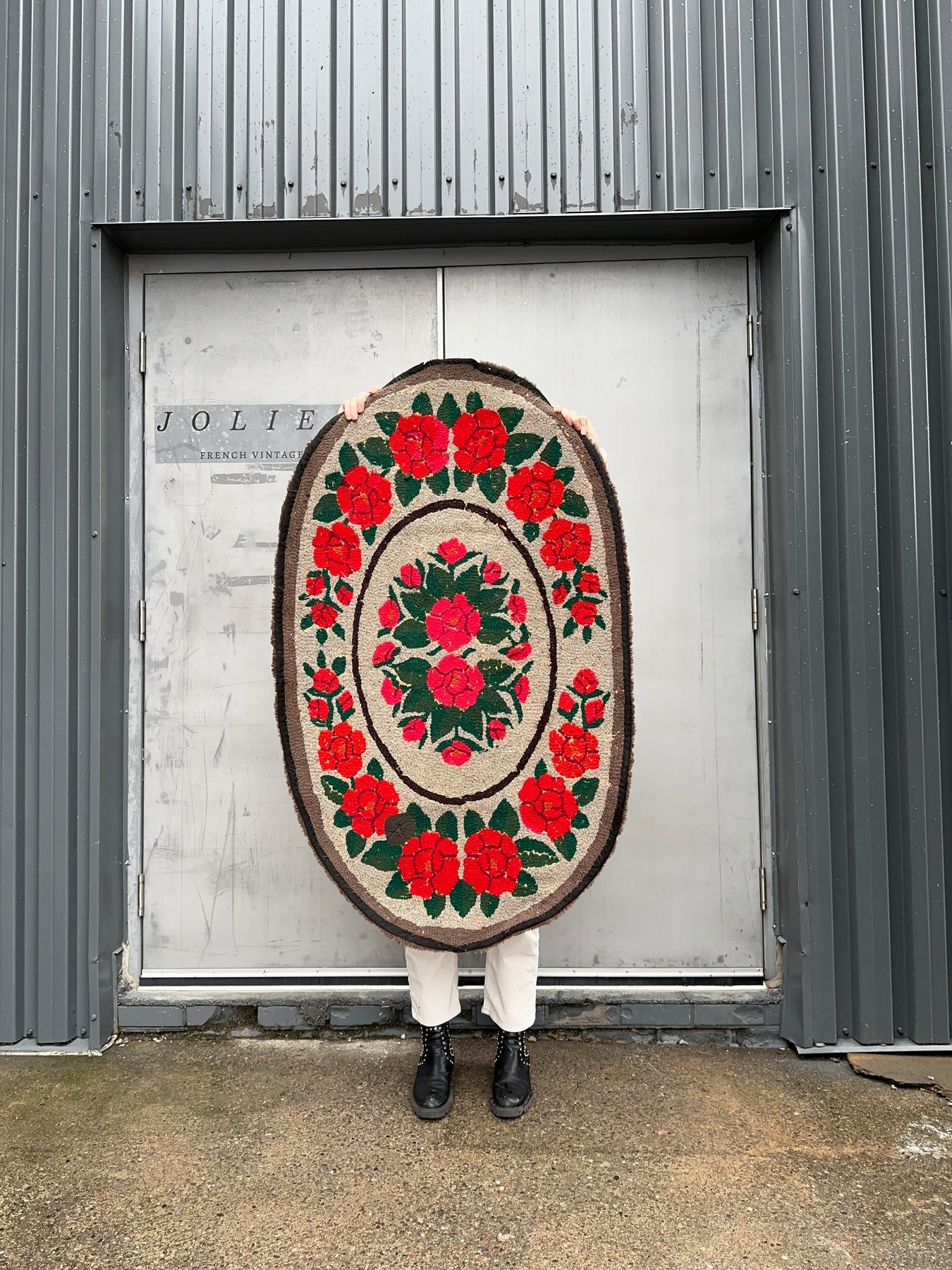 This charming 1950s hook rug was made in England but found in a brocante in Marseille. The pretty red roses stand out against the tan background and we think this would be ideal in a bedroom or powder room.