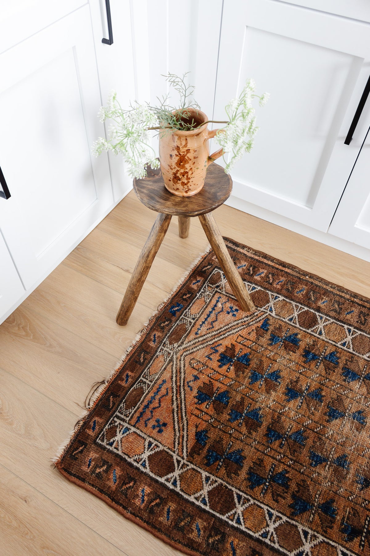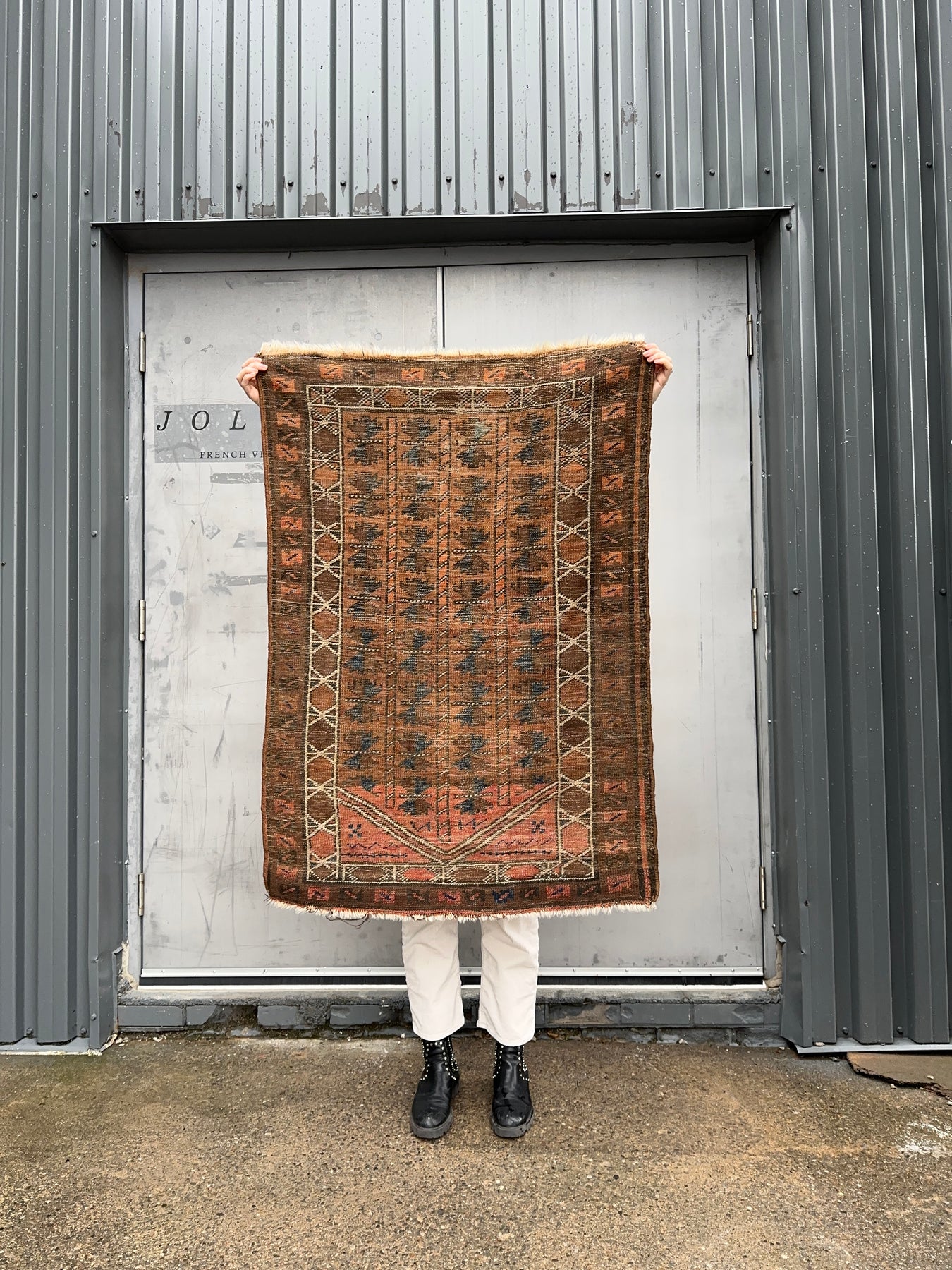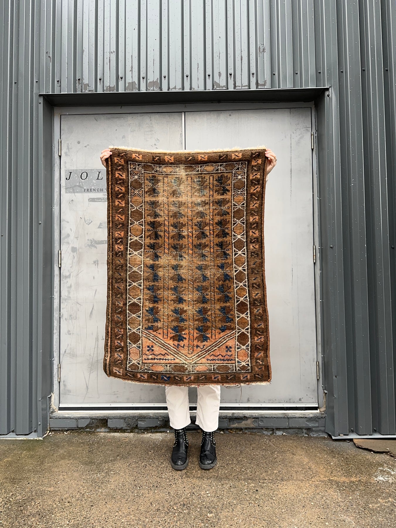 Antique Persian rug circa 1890s with gorgeous signs of wear and age. We love adding a time worn piece to our decor to add warmth and character. Sourced from an estate in Marseille.