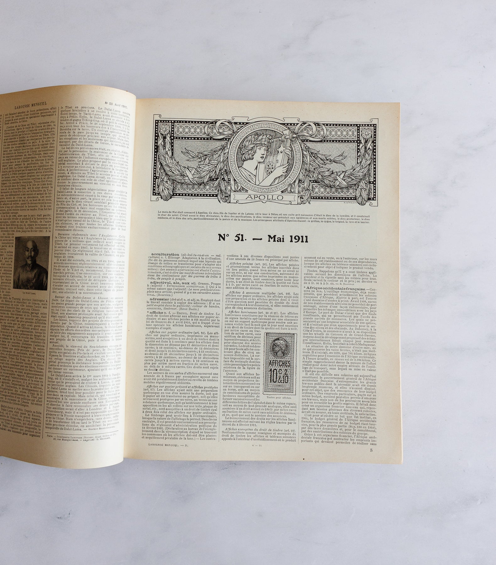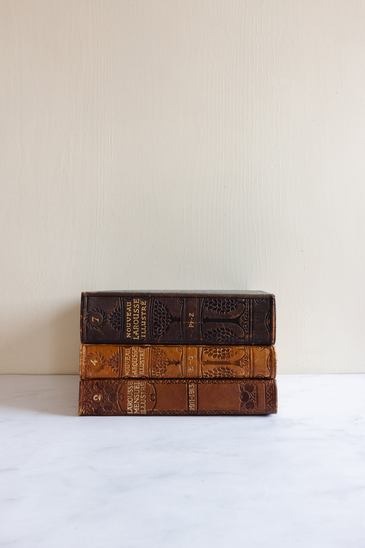 These incredible turn of the century antique leather bound encyclopedias have loads of shelf appeal. Each beautifully heavy book features images amidst the French language text and embossed covers.