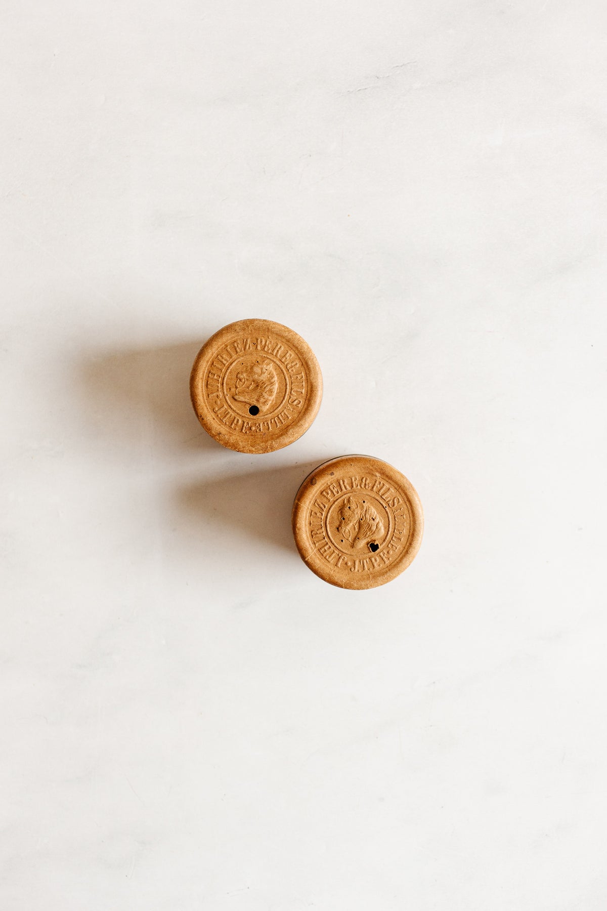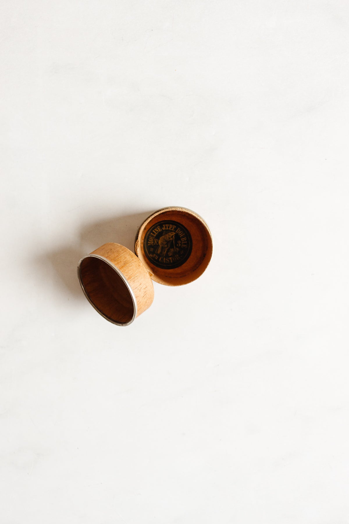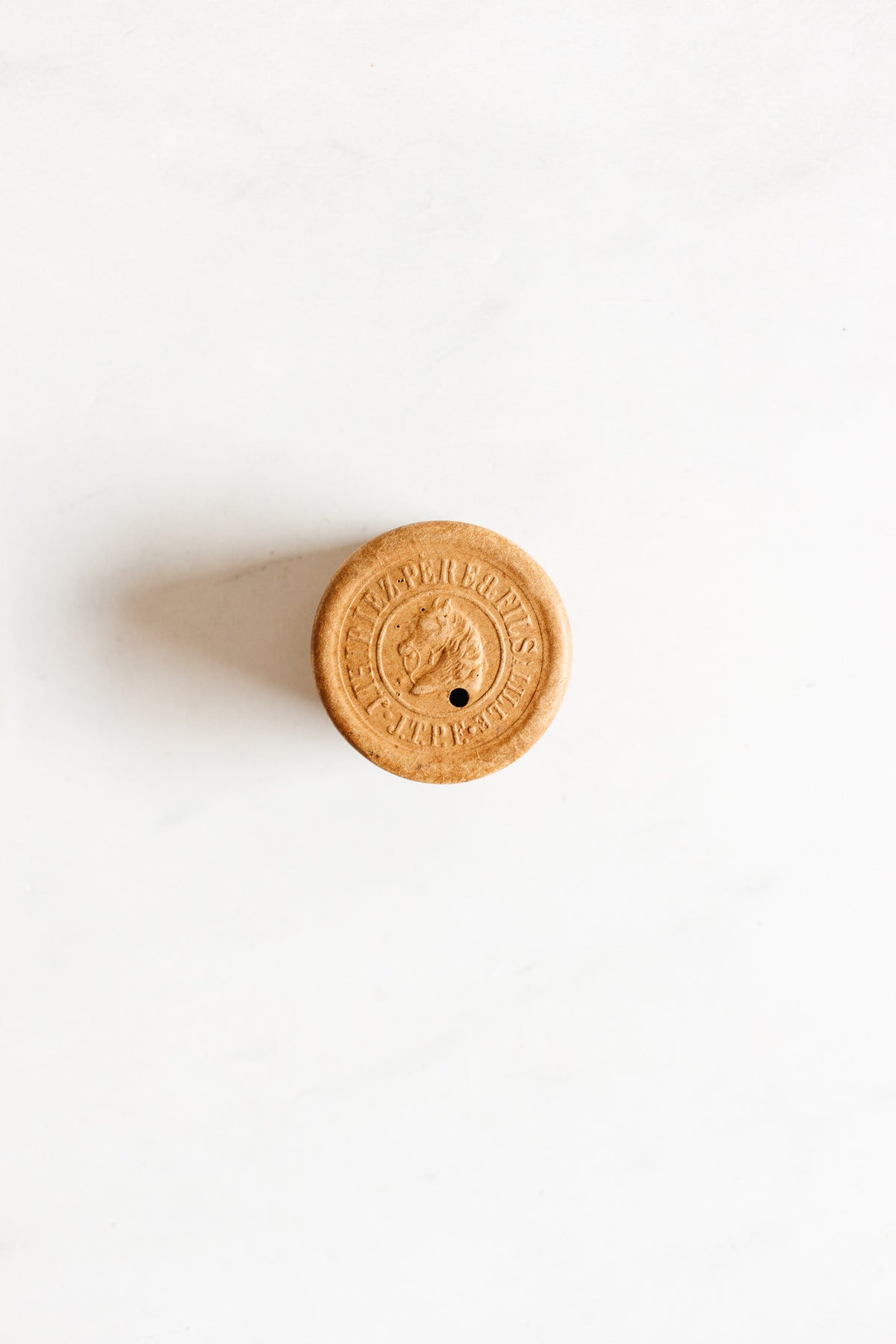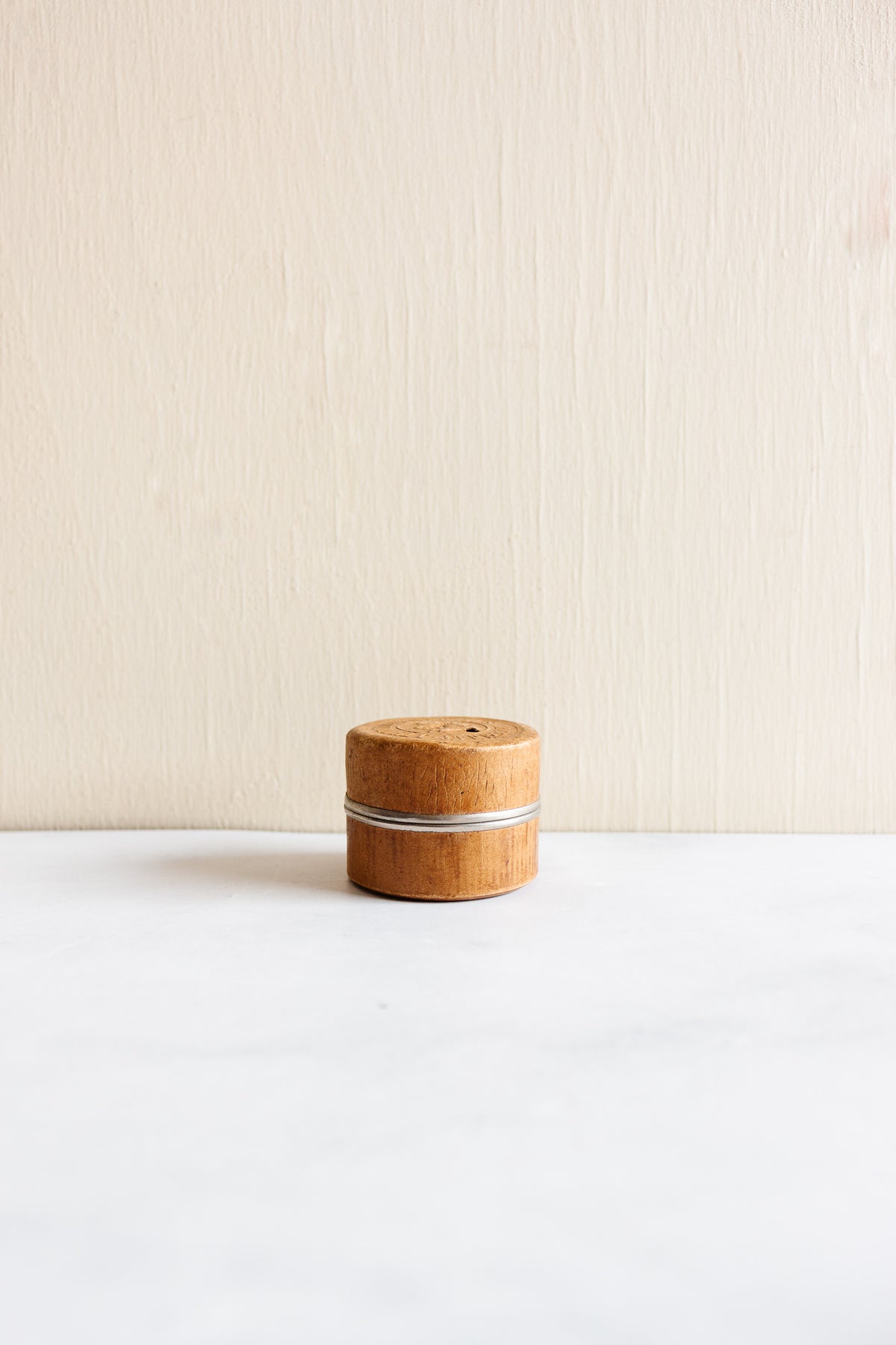 We love these unique thread box dispensers that keep spools organized while in use. Made by renowned French thread manufacturer J. Thiriez Père & Fils, they are made of heavy cardboard with a faux wood grain surface, with a metal finishing trim. The thread feeds through a hole in one side of the box, embossed with JTPFs horse head logo.