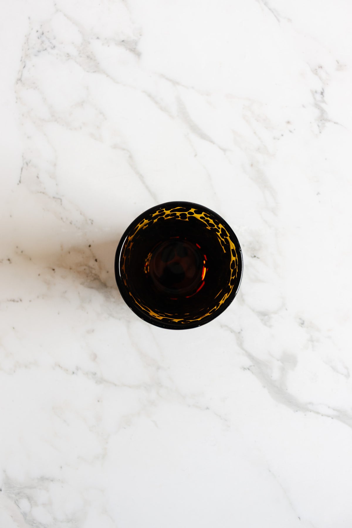 A set of three vintage tortoiseshell glass tumblers, likely hand-crafted in France and sourced from a brocante in Marseille. Each tumbler features hand-blown bubbles and swirling rich patterns, showcasing the artistry and character of French glassmaking. Perfect for serving drinks with flair or as a decorative, collectible accent for your bar or table.