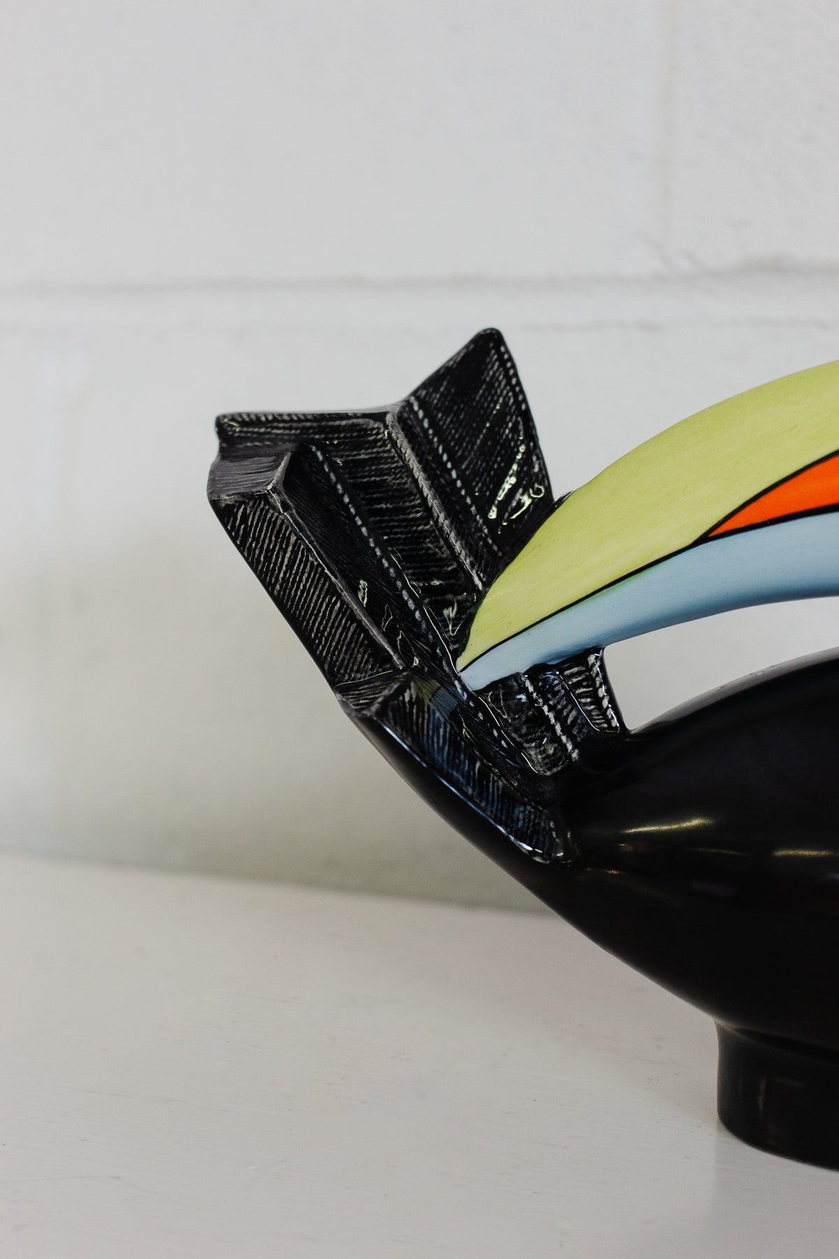 A vibrant vintage toucan figurine by Goebel, likely crafted in West Germany around 1972, based on the maker’s mark. This mid-century ceramic piece features Goebel’s signature attention to detail, with expressive lines and a bold, glossy glaze. There are a few minor chips to the painted finish, consistent with age and handling, but they do little to detract from the charm and character of this playful piece. A delightful addition to any shelf, vignette, or collection of West German ceramics.