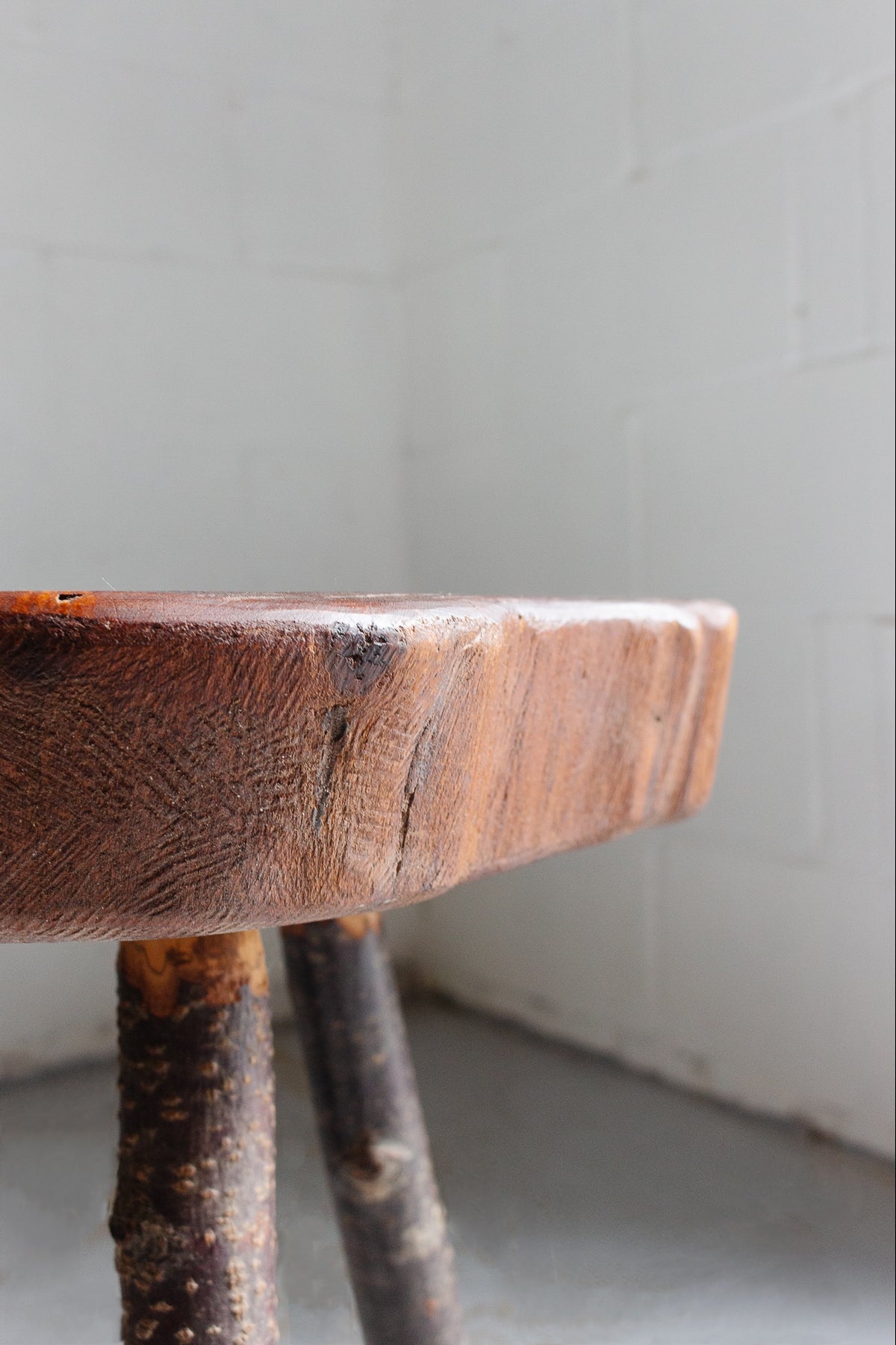 Gorgeous, classic midcentury French brutalist hand crafted stool, made of a thick crosscut slab of softly polished live edge wood and branch legs. An incredible heirloom piece ready to use as a seating option or side table.
