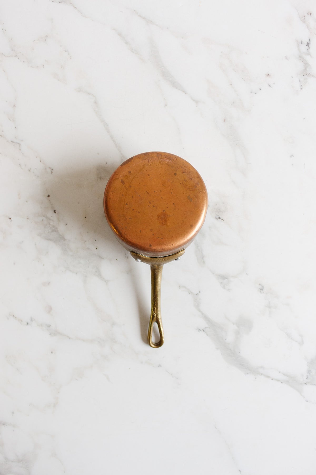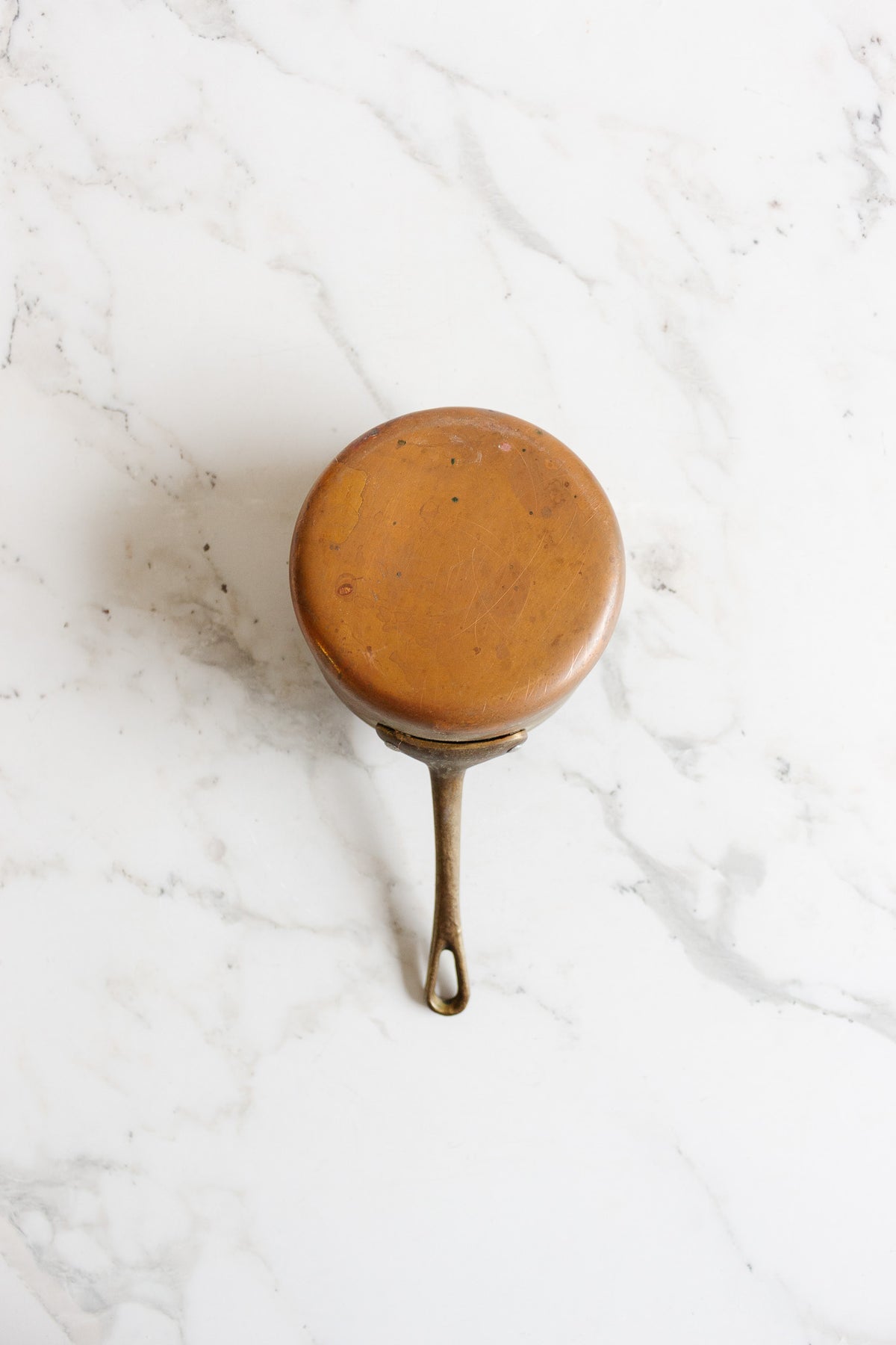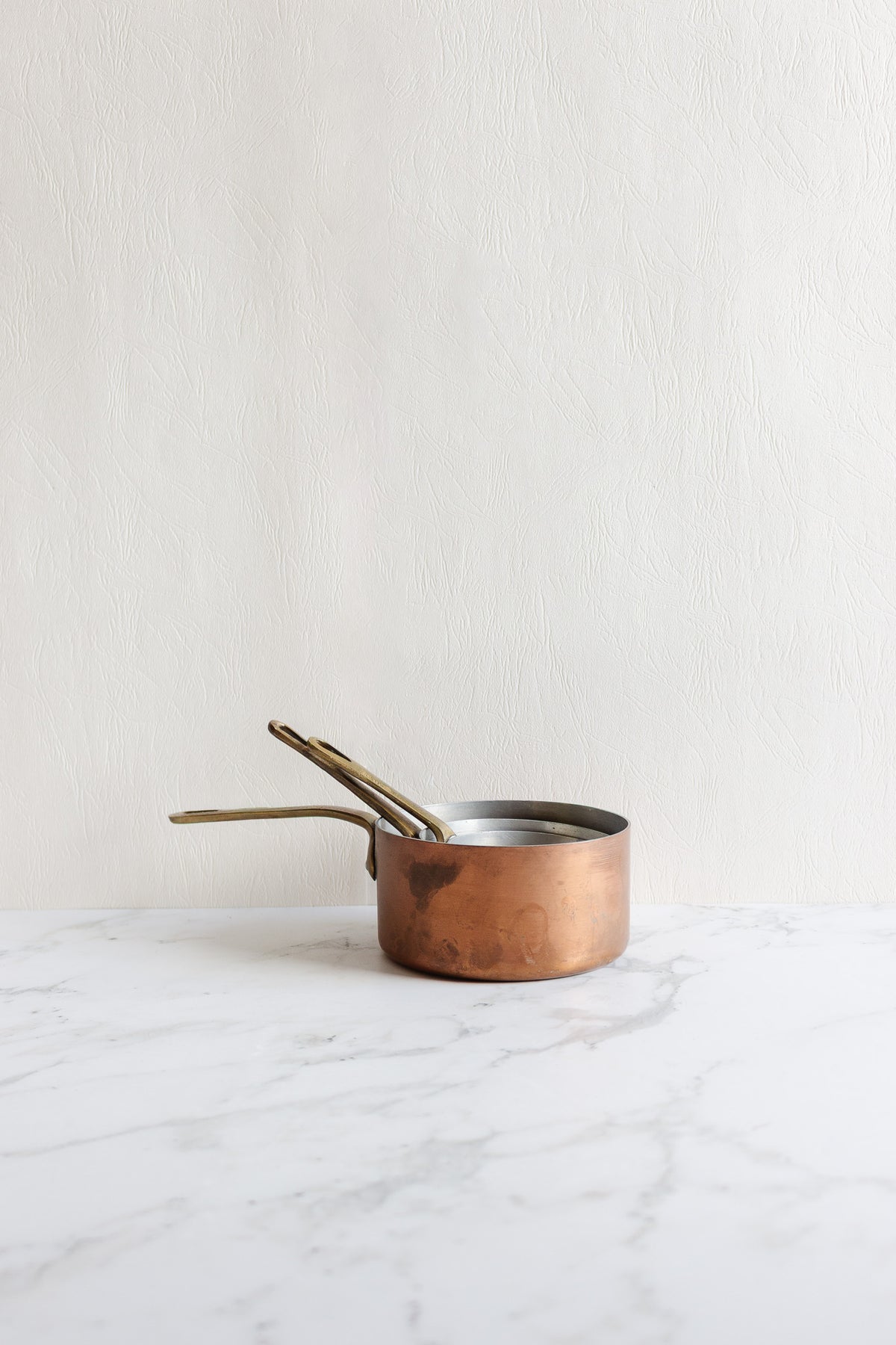 A set of three vintage French copper pots, each with cast iron handles and a rich, naturally aged patina that speaks to years of use in a traditional French kitchen. Their sturdy construction and elegant proportions make them as beautiful on display as they are functional. Sourced from a brocante in Marseille, each pot tells its own story through wear and warmth of tone.