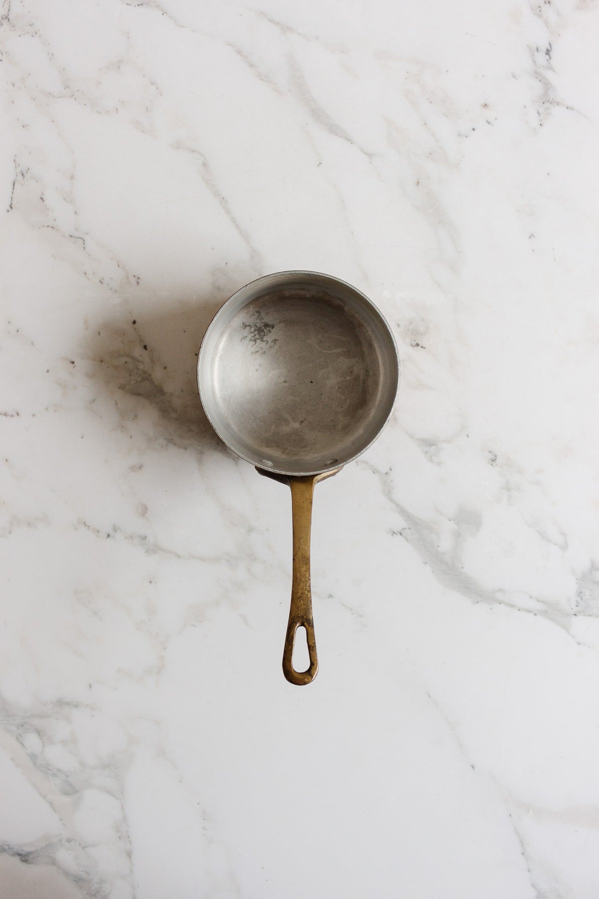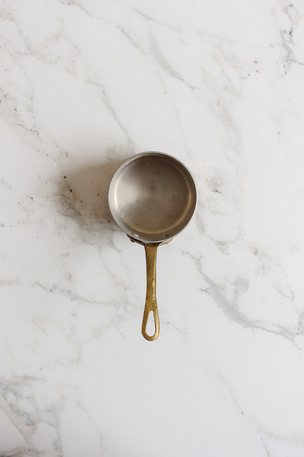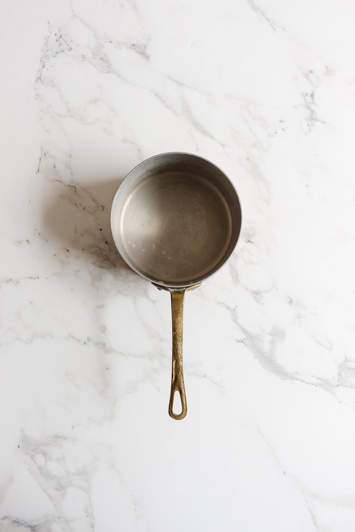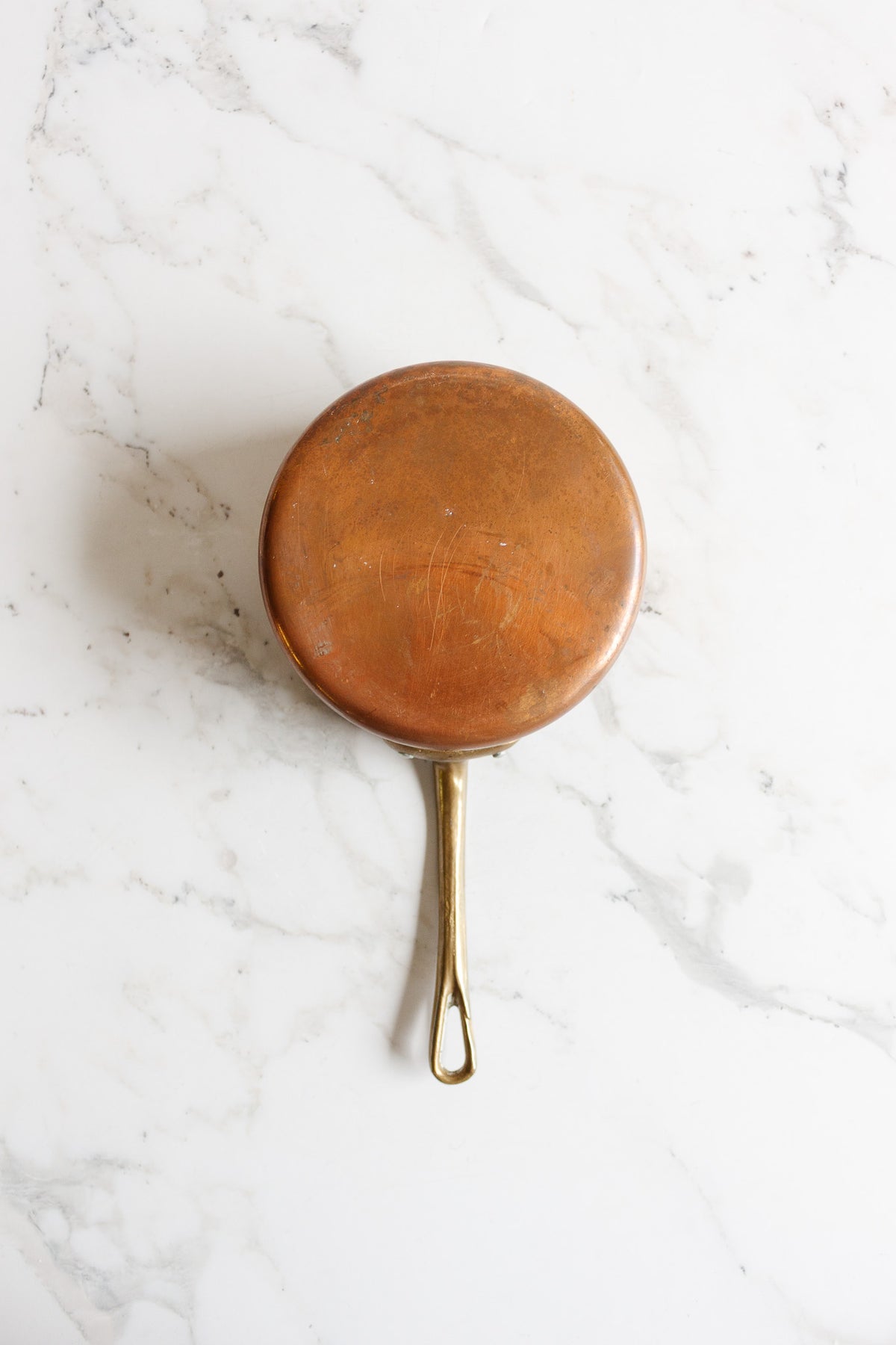 A set of three vintage French copper pots, each with cast iron handles and a rich, naturally aged patina that speaks to years of use in a traditional French kitchen. Their sturdy construction and elegant proportions make them as beautiful on display as they are functional. Sourced from a brocante in Marseille, each pot tells its own story through wear and warmth of tone.