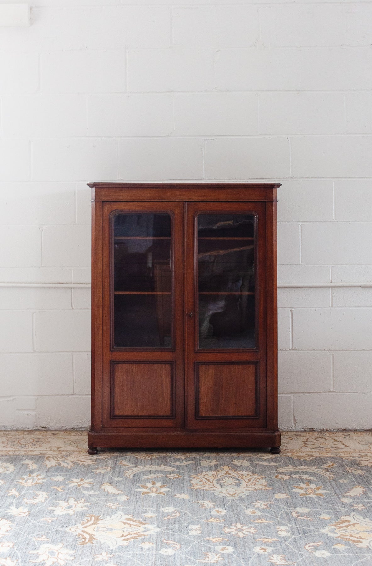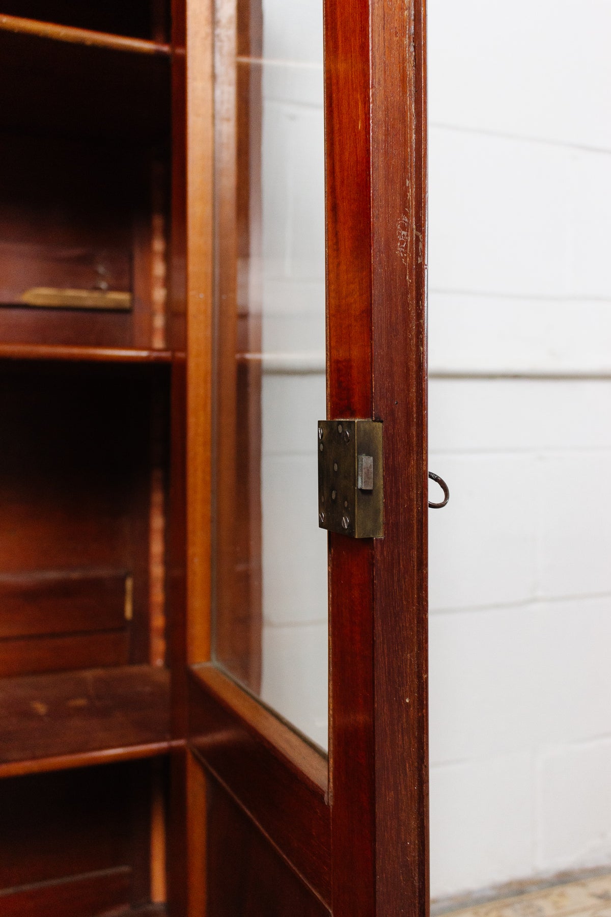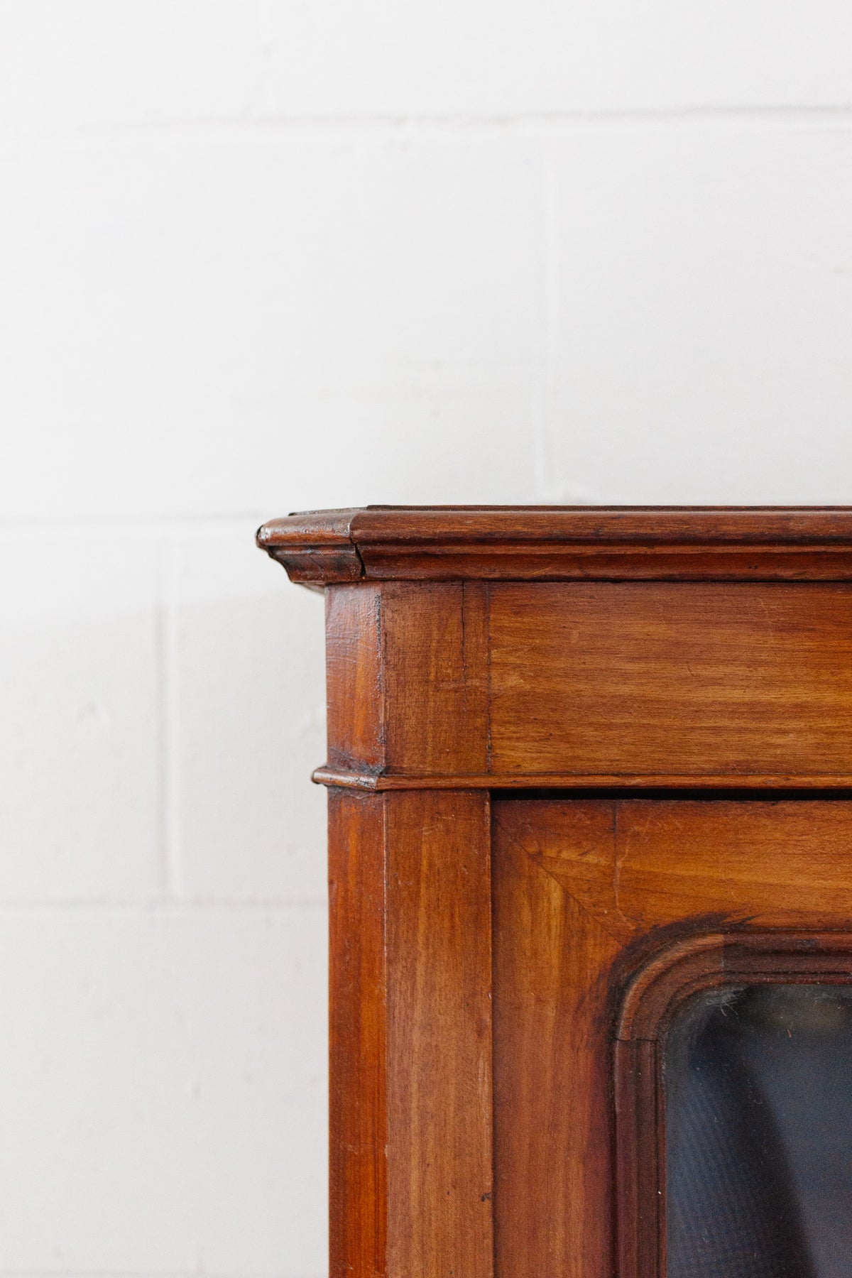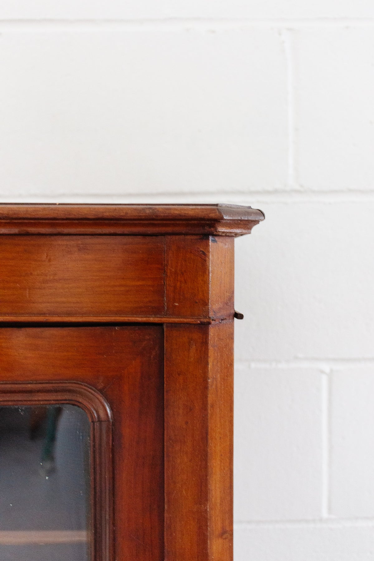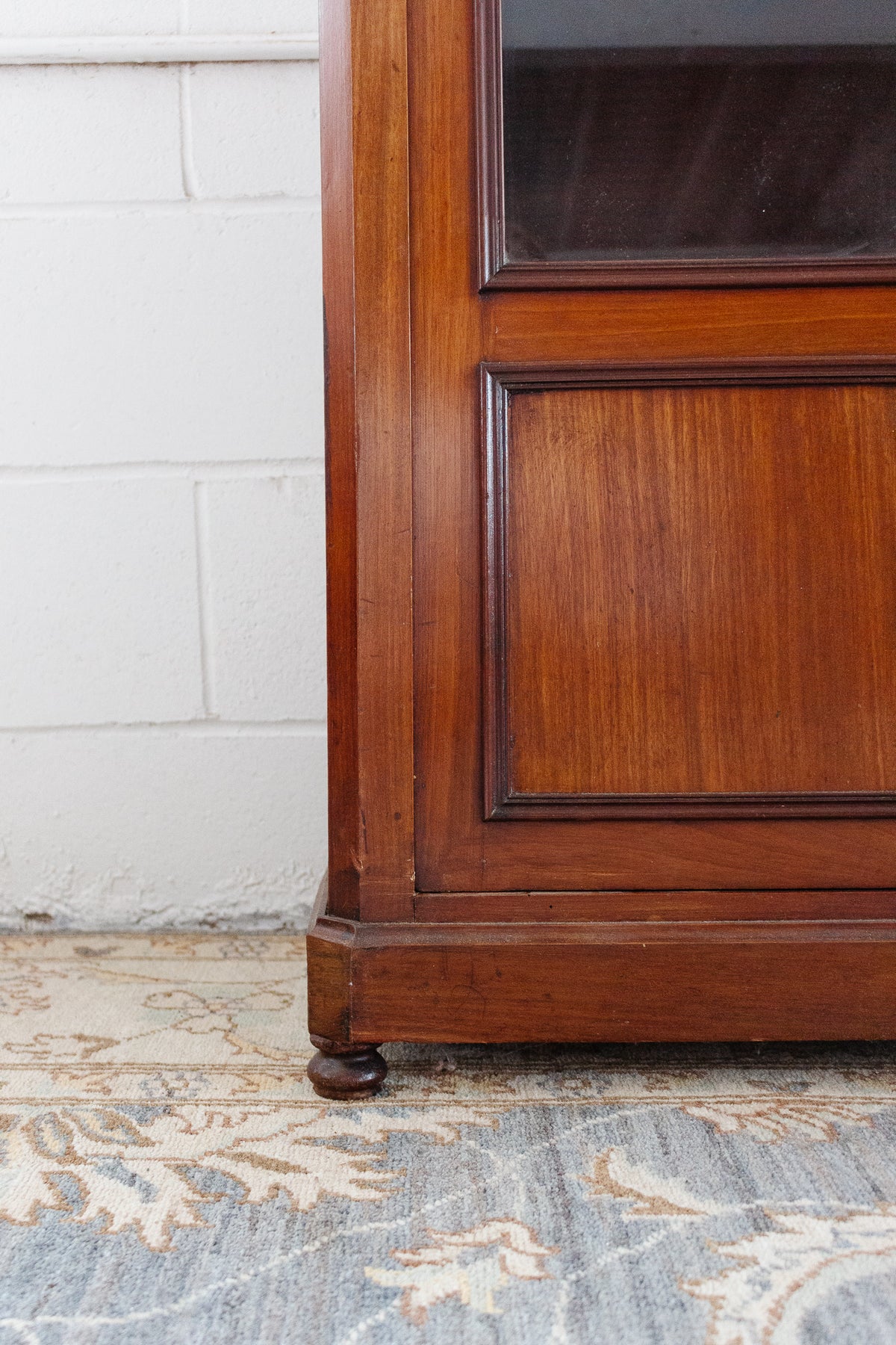A stunning antique glass front cabinet in a compact size, but with all of the elegance of any twice it's height. Featuring original antique wavy glass and original hardware and key, classic clean lines and the sweetest ball feet. Use this the living room, in the study, or even by your entry way. Please note signs of wear as pictured, including a very small piece of missing trim that does not affect the integrity of the piece; right door requires the use of the interior clasp to remain closed.
