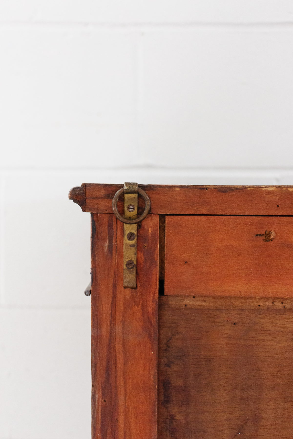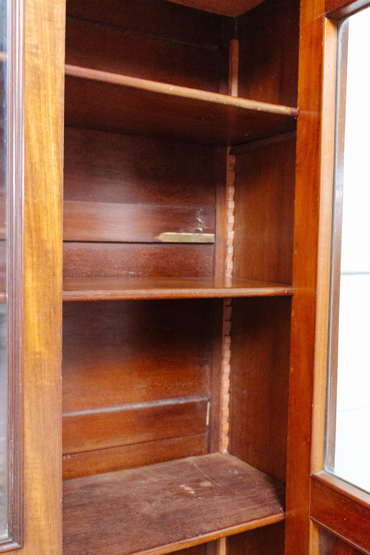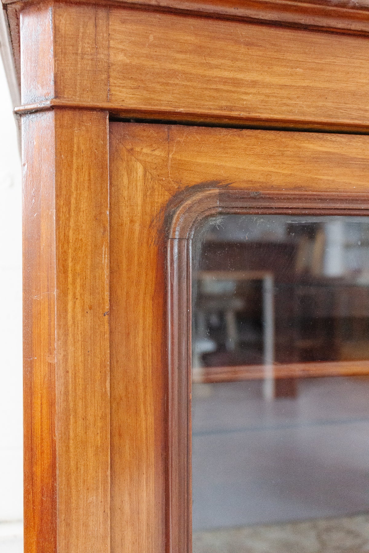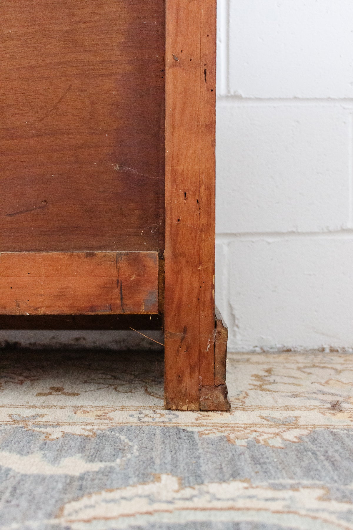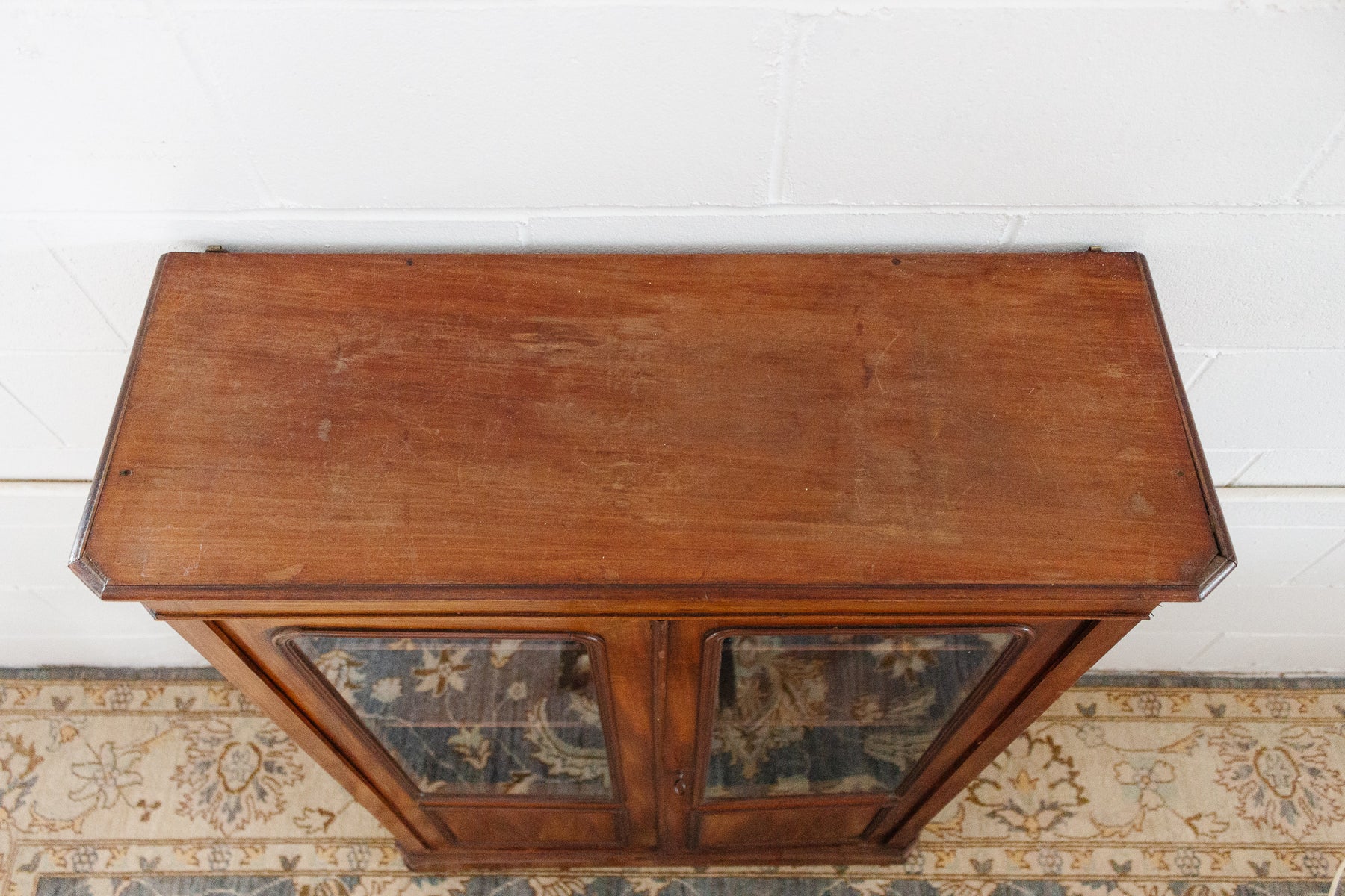 A stunning antique glass front cabinet in a compact size, but with all of the elegance of any twice it's height. Featuring original antique wavy glass and original hardware and key, classic clean lines and the sweetest ball feet. Use this the living room, in the study, or even by your entry way. Please note signs of wear as pictured, including a very small piece of missing trim that does not affect the integrity of the piece; right door requires the use of the interior clasp to remain closed.